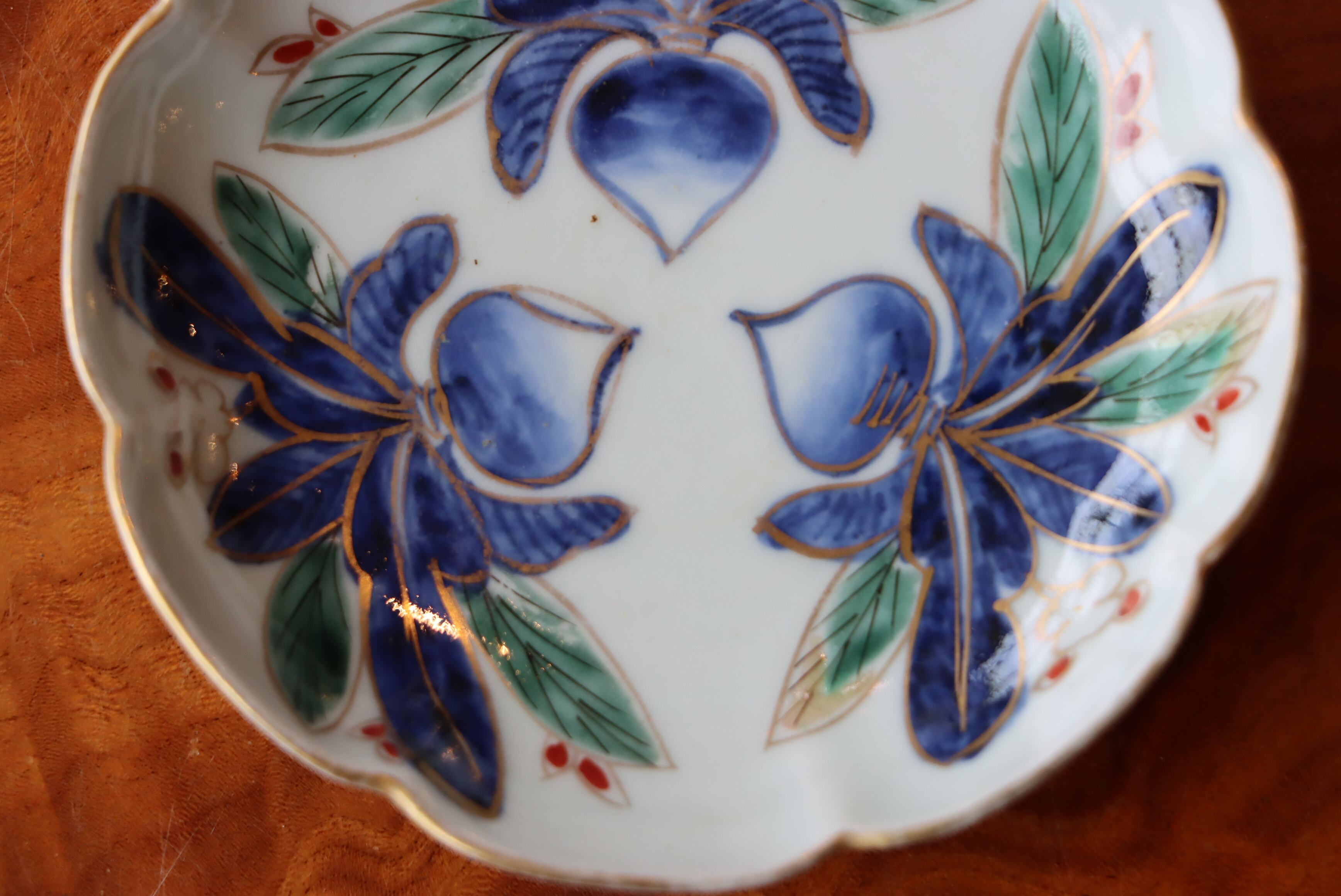 柔らかい花びらのようなフォルムが特徴の輪花の器に、縁起の良い蕪(かぶ)の模様が丁寧に描かれています。