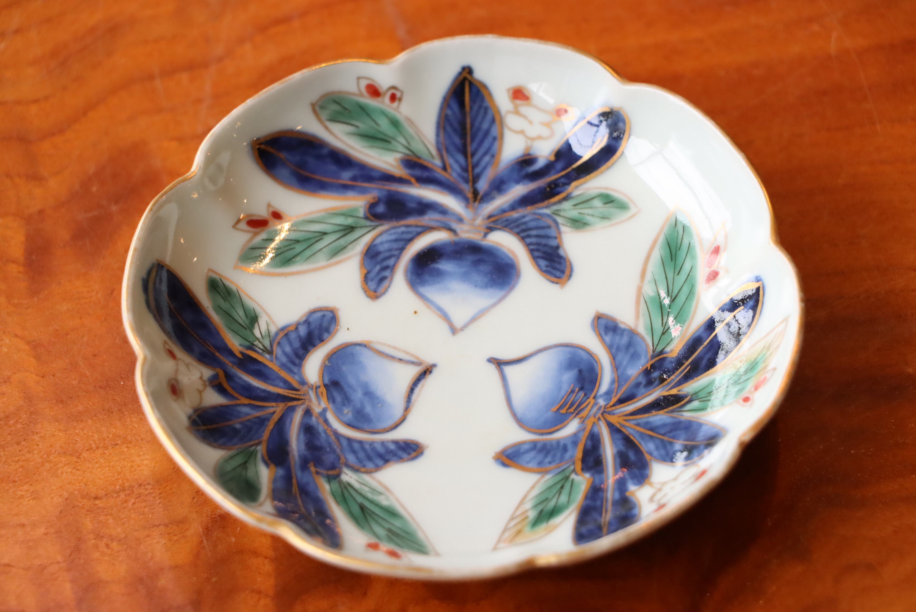 濃淡のある青で表現された蕪の葉や実に、緑や赤がさりげなく差し色として加わり、さらに金彩が施されることで上品な華やかさが引き立っています。