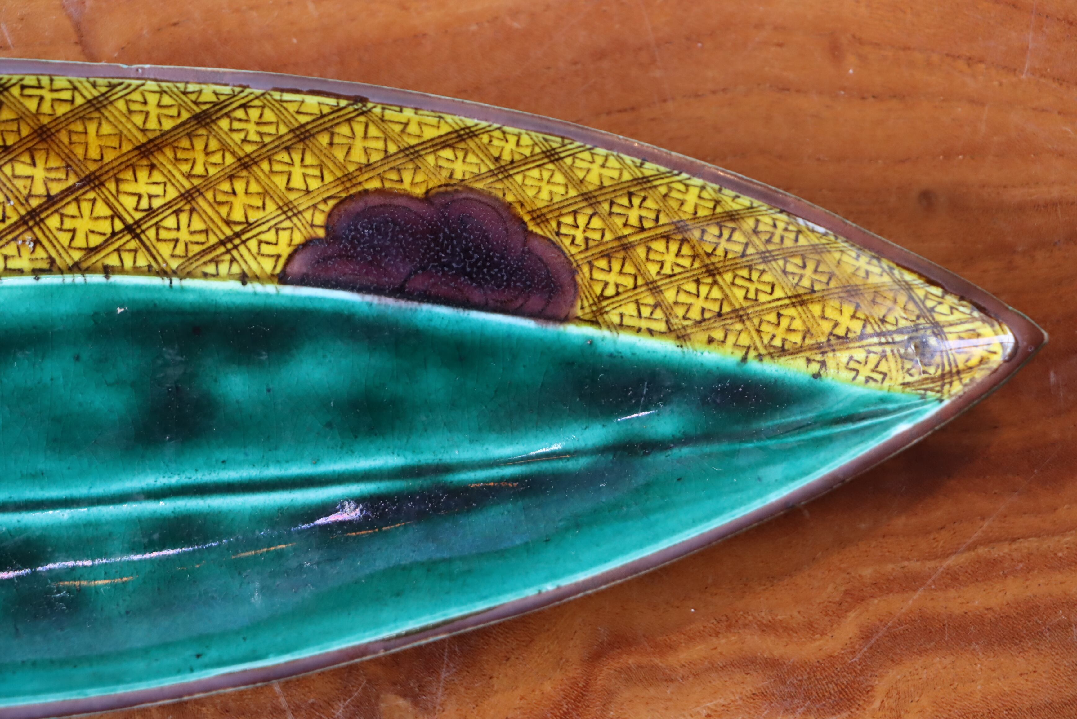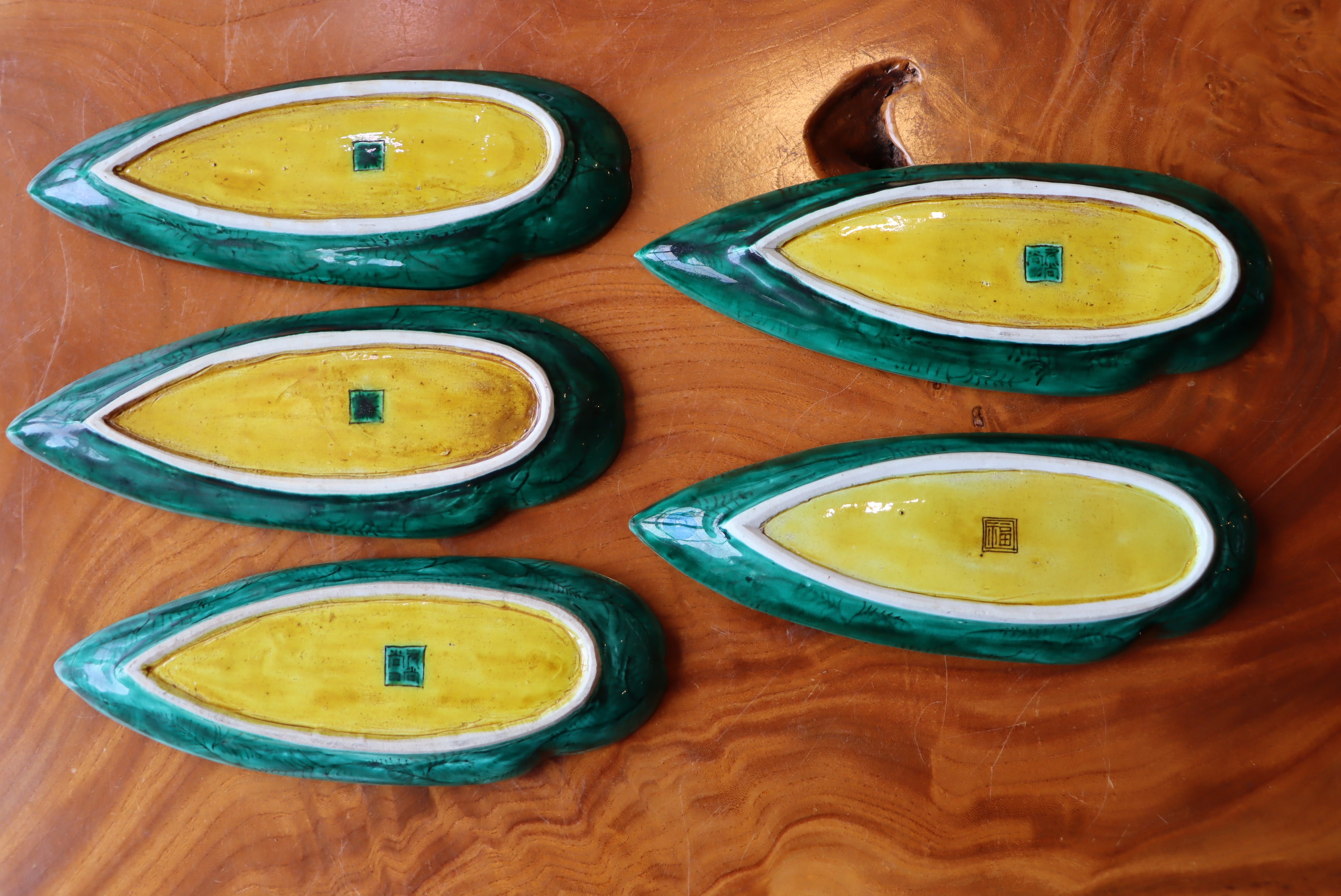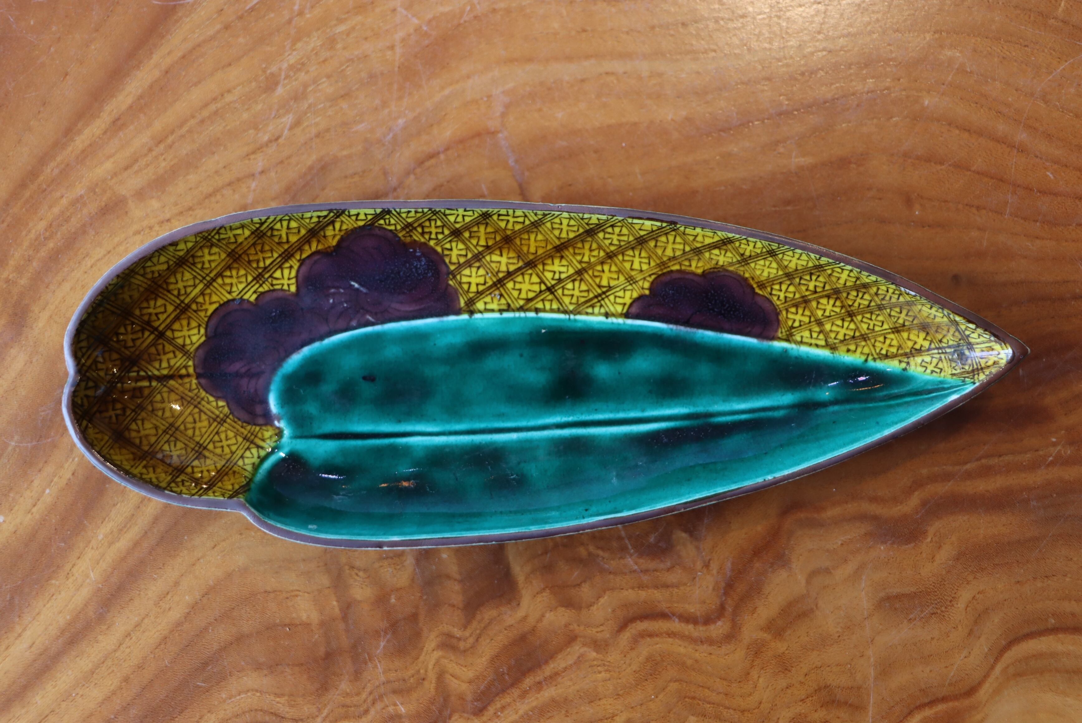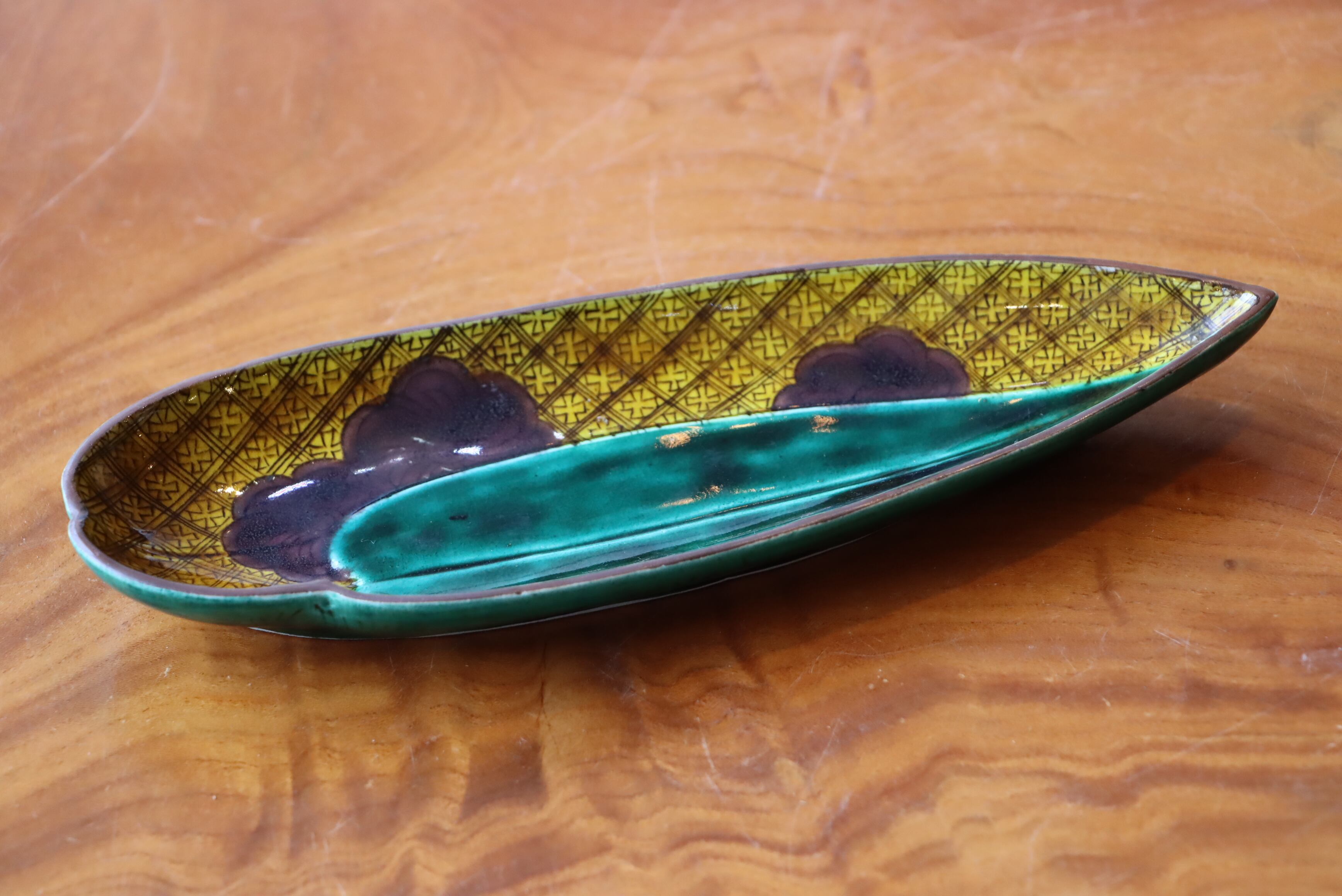 【Kutani bamboo leaf shaped plate in overglaze enamels, set of 10, with box.】