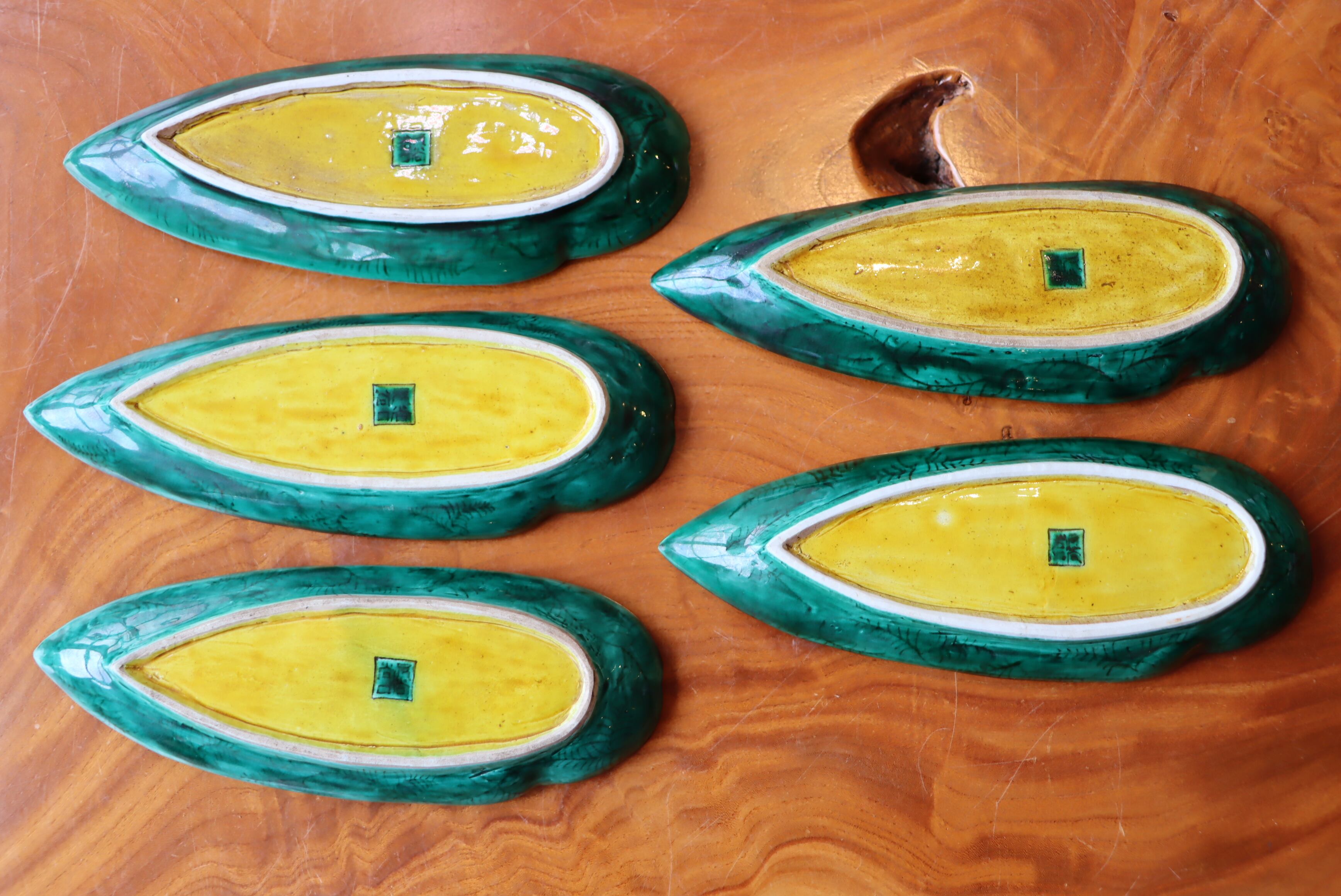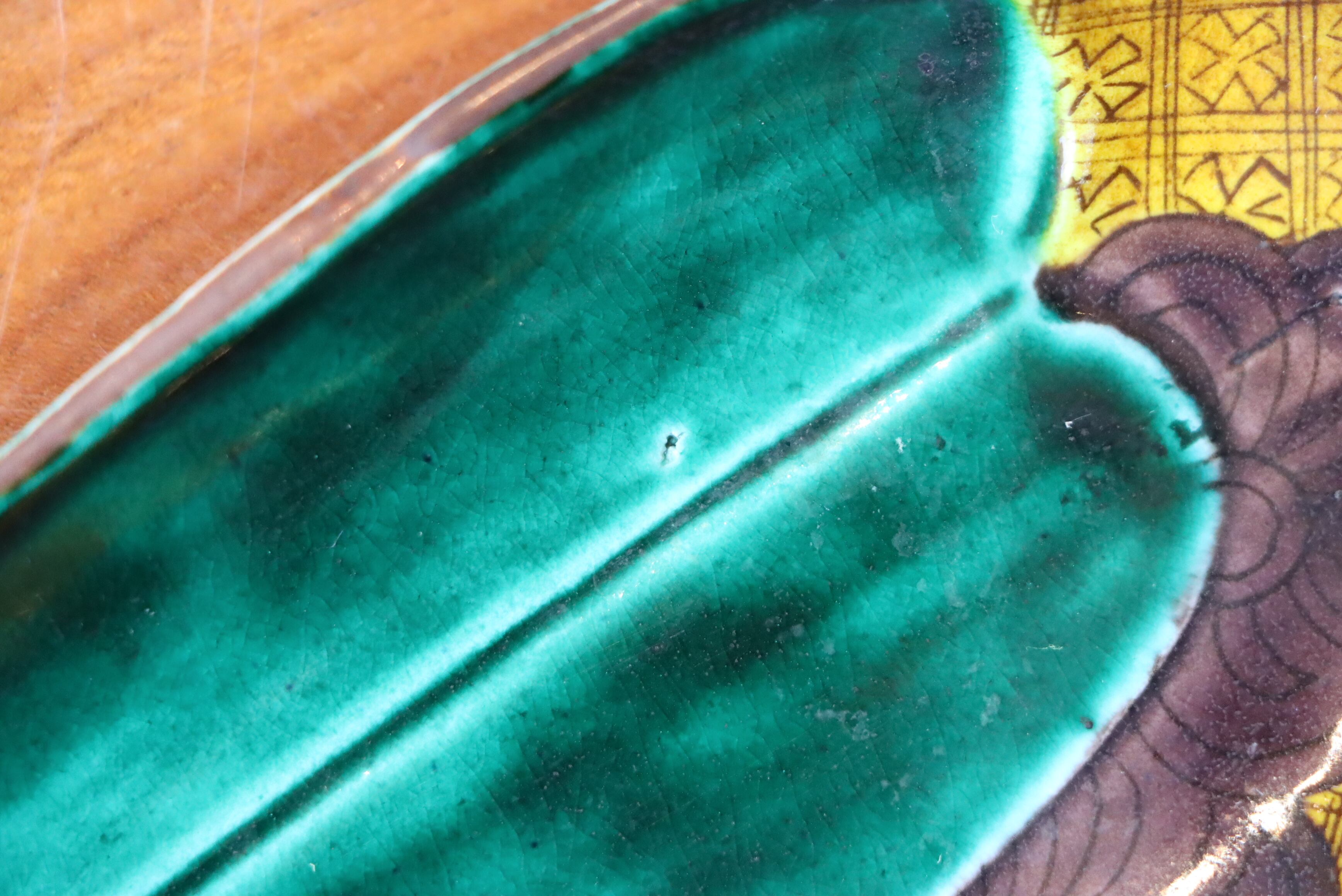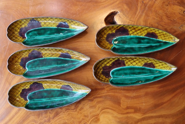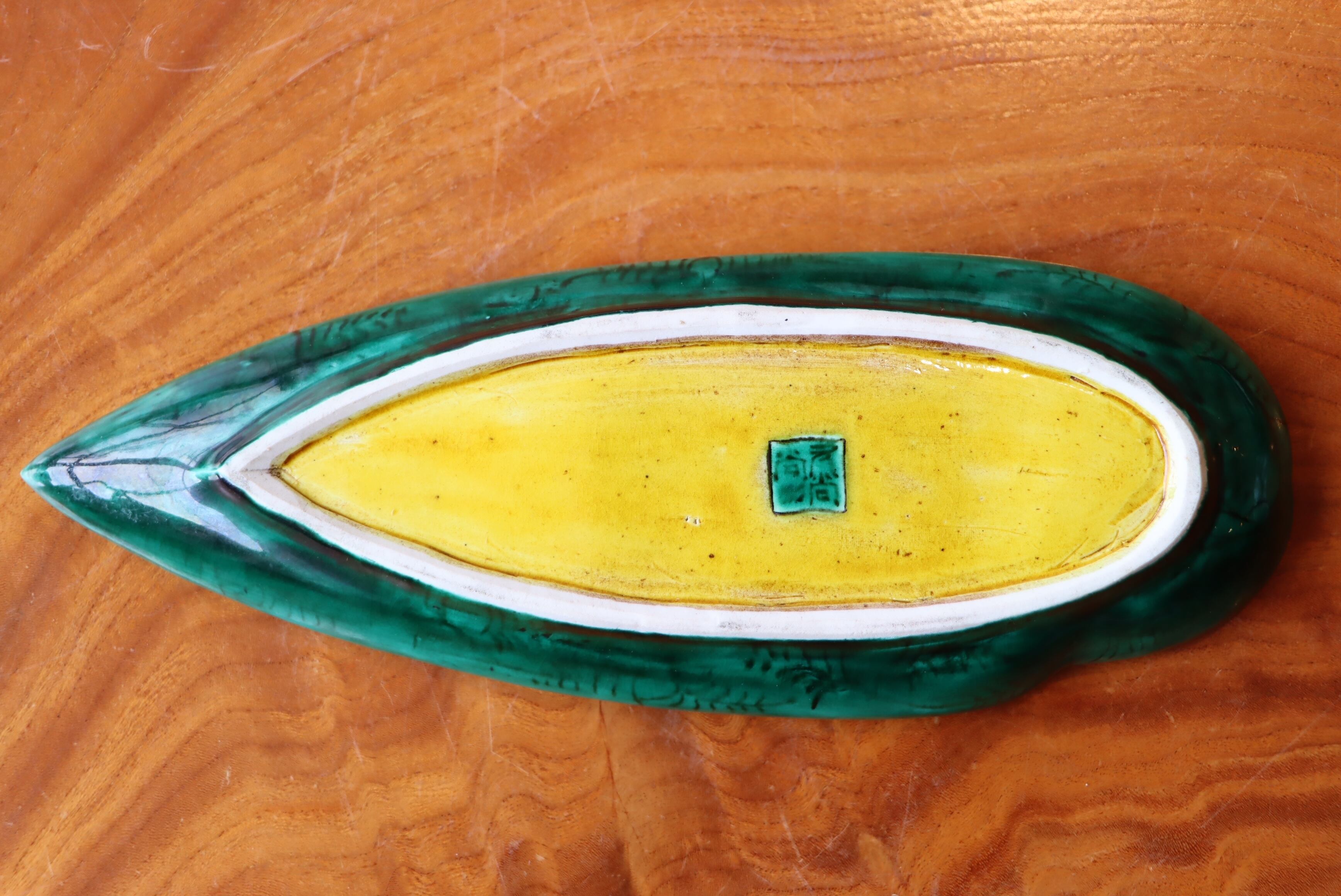 【Kutani bamboo leaf shaped plate in overglaze enamels, set of 10, with box.】