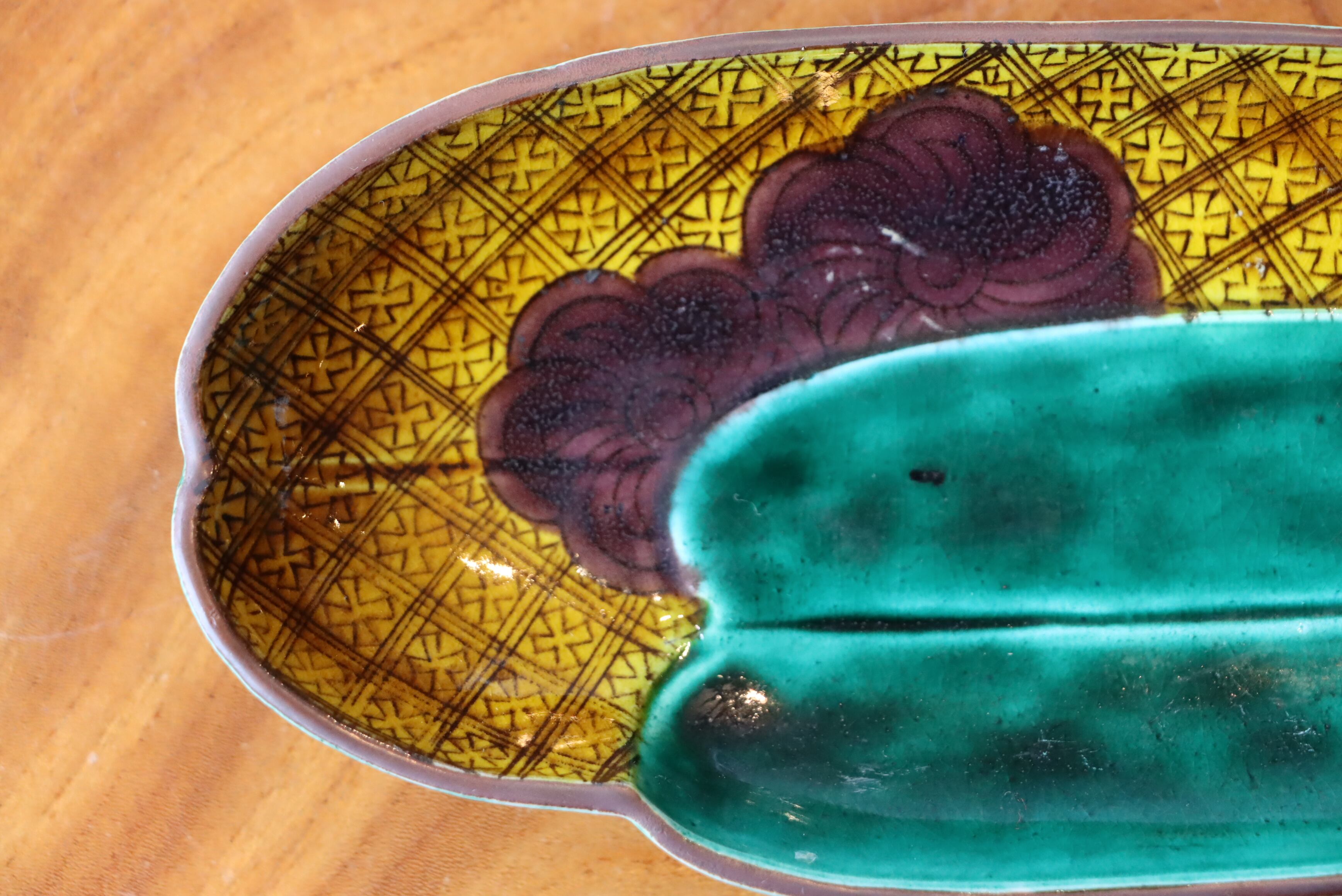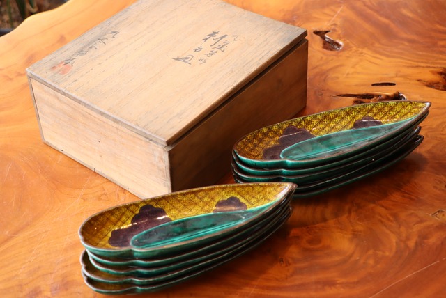 九谷焼 色絵 四方襷文 笹形皿 葉形皿 変形皿 十客組 共箱/Kutani plate,set of 10.