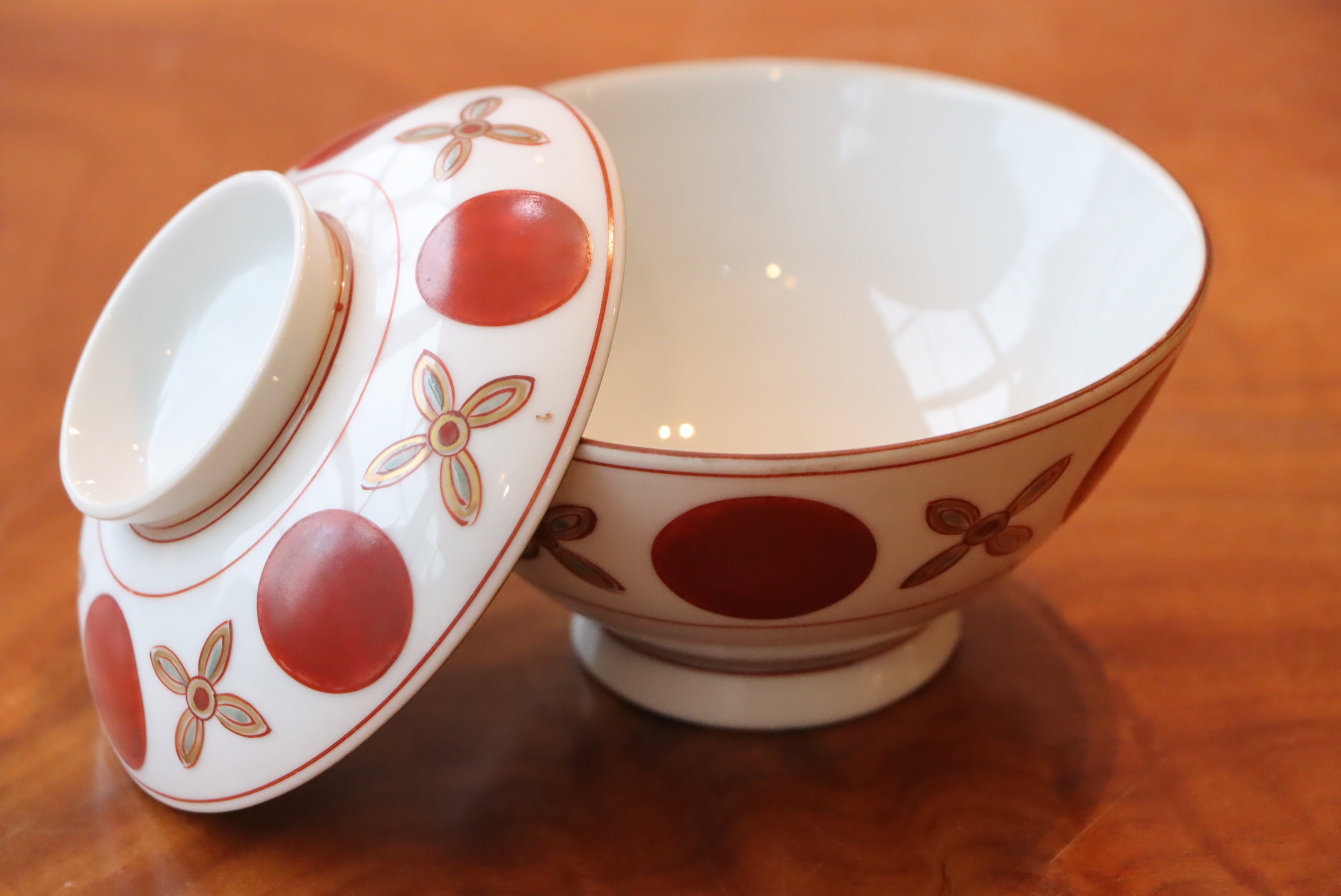 【Kutani covered bowl with "Akadama" and flower design in overglaze enamels.】