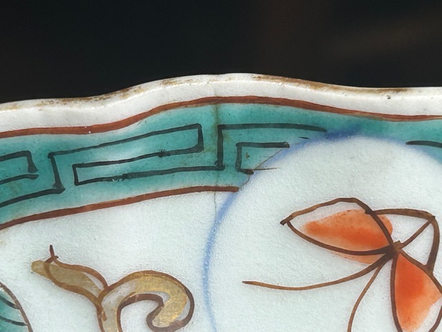 状態:ニュウ (約2cm)ございます。その他、縁ソゲ、金彩の薄れ、カマキズあり。気をつけて使用すれば普段使い可能。または金継ぎ用に。お写真にて状態をご確認ください。