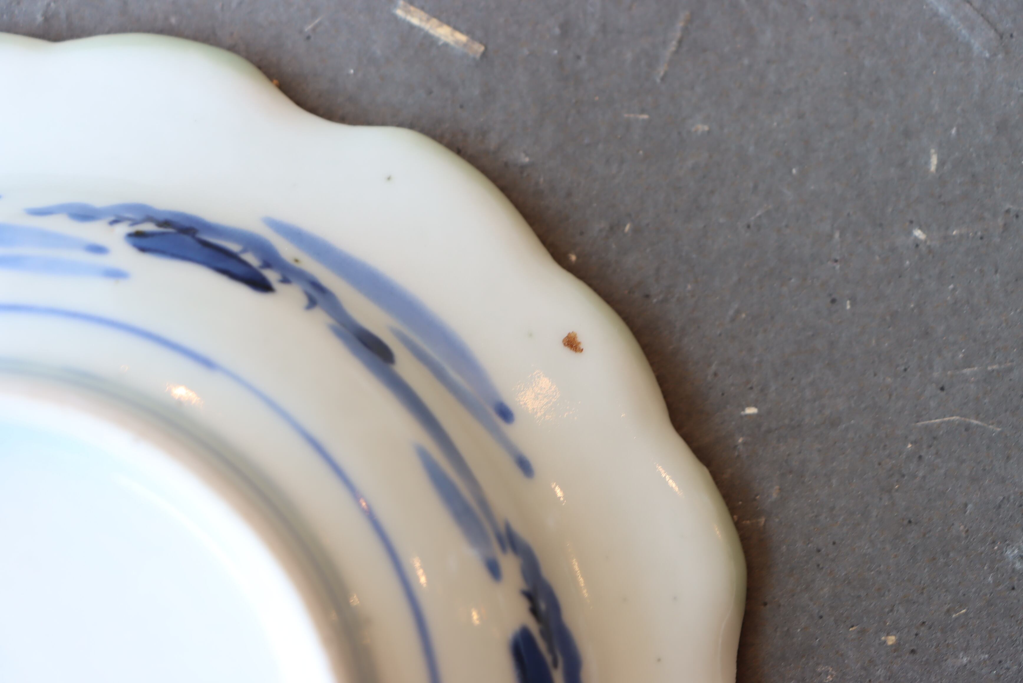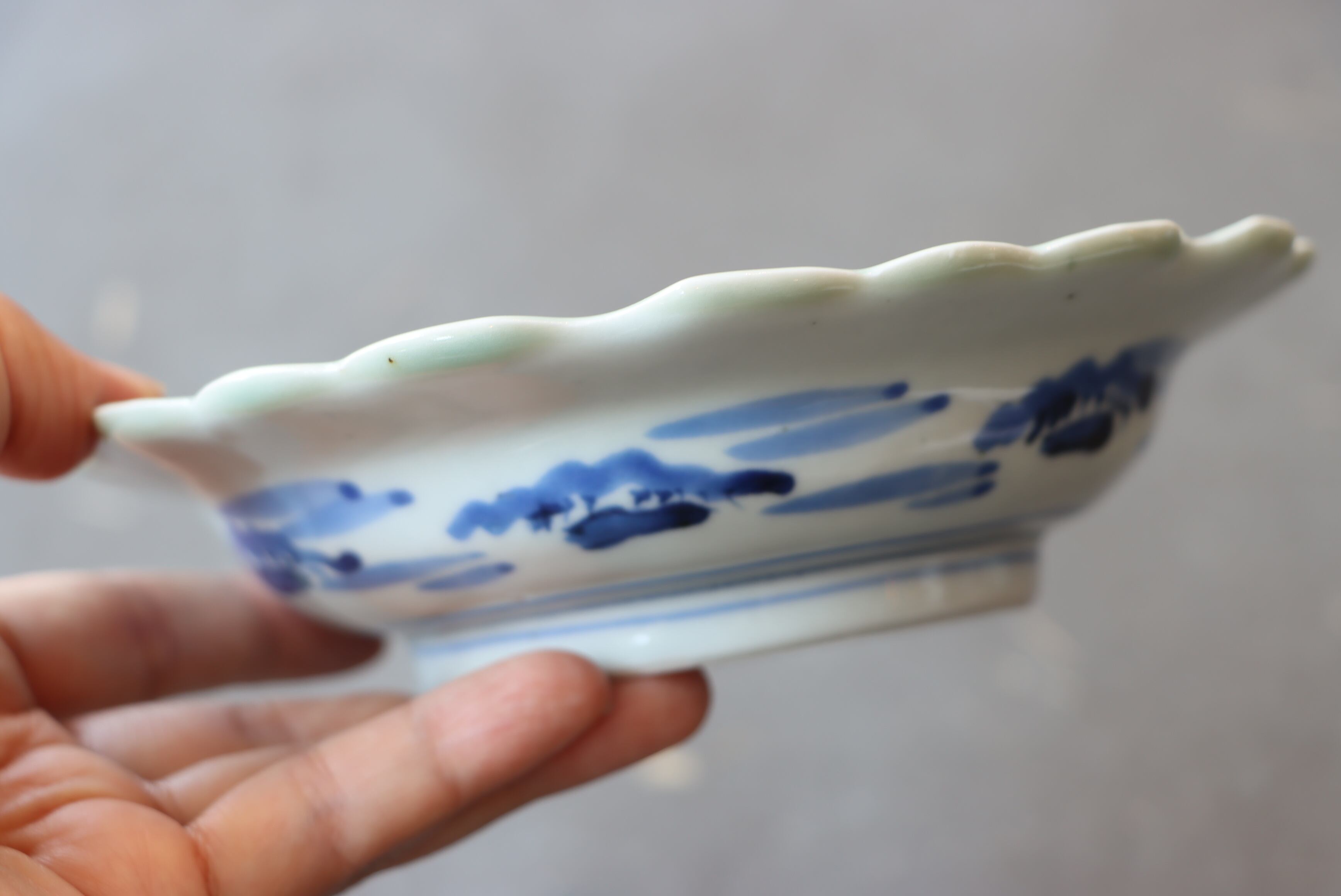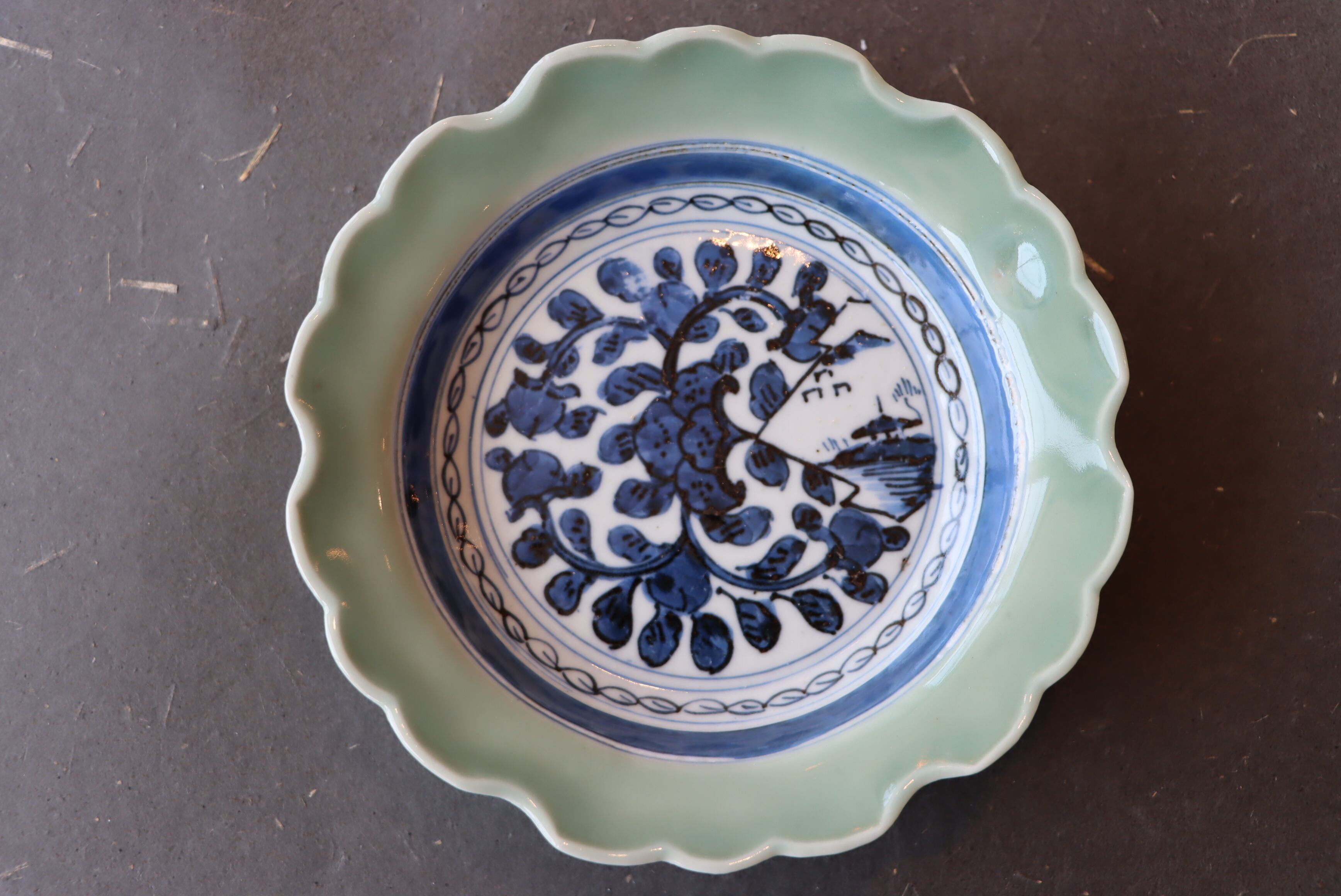 古伊万里 青磁 楼閣山水牡丹文 雪輪形 平向付 A/Old Imari plate A
