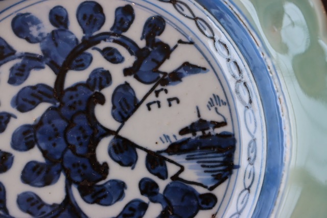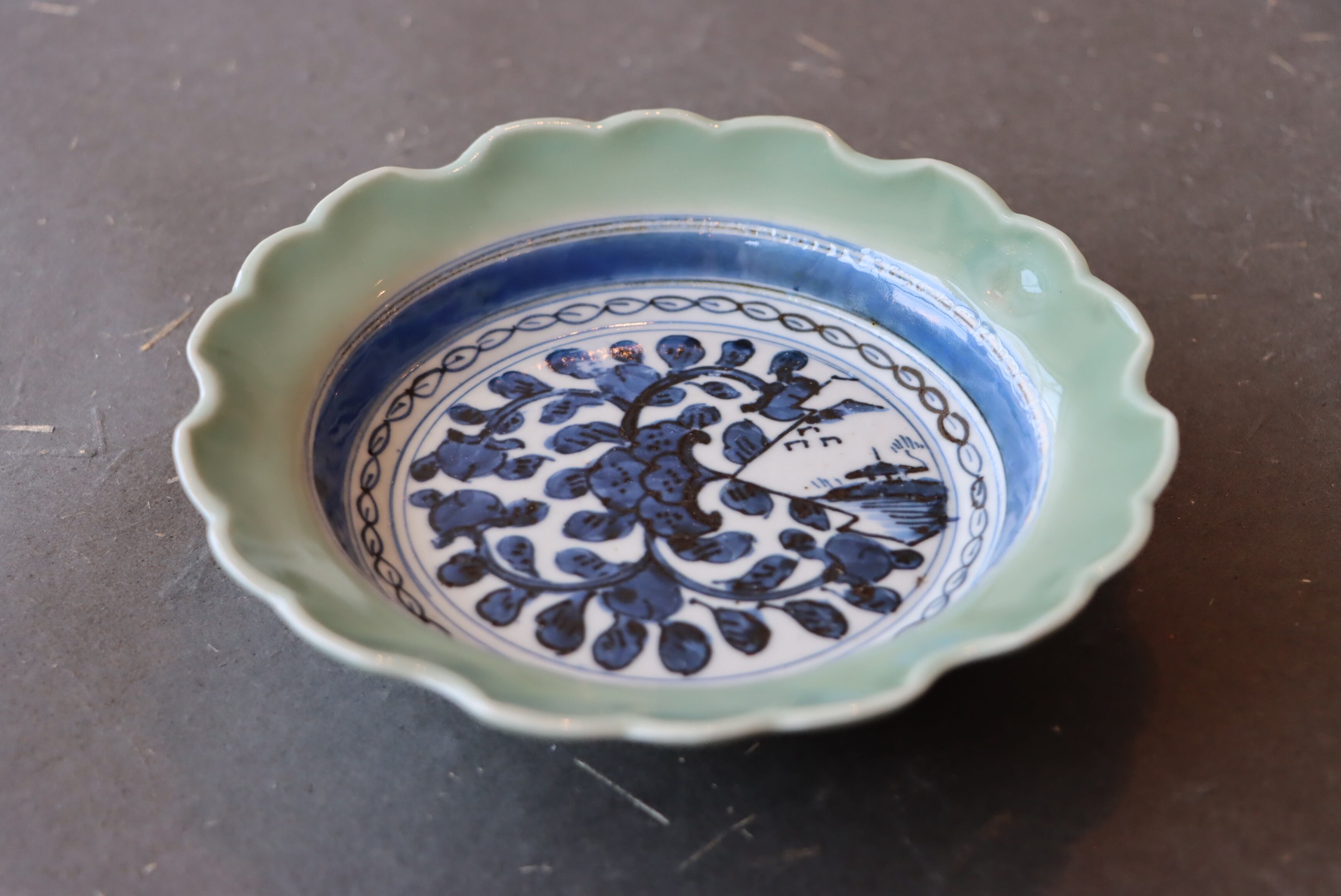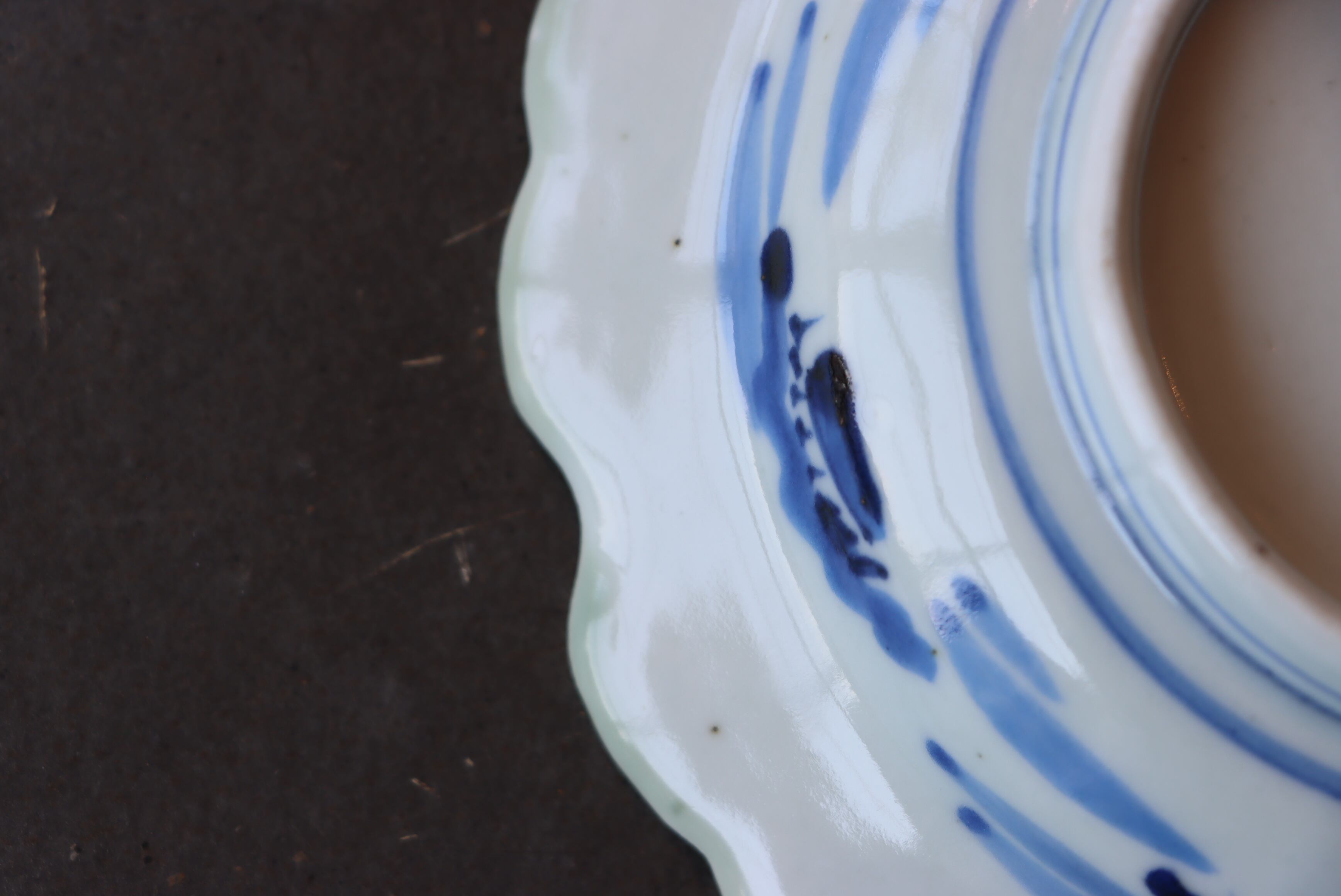 古伊万里 青磁 楼閣山水牡丹文 雪輪形 平向付 A/Old Imari plate A