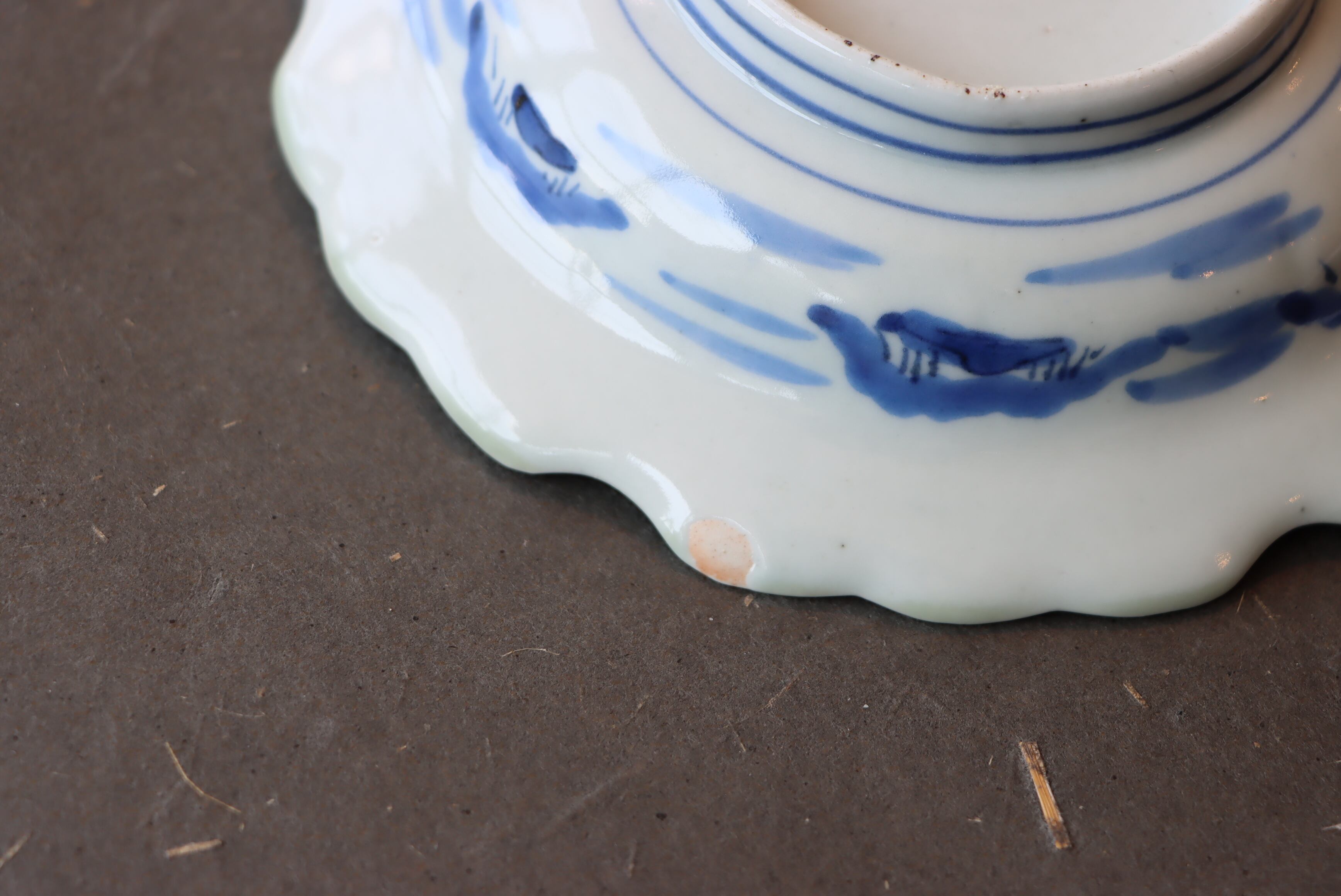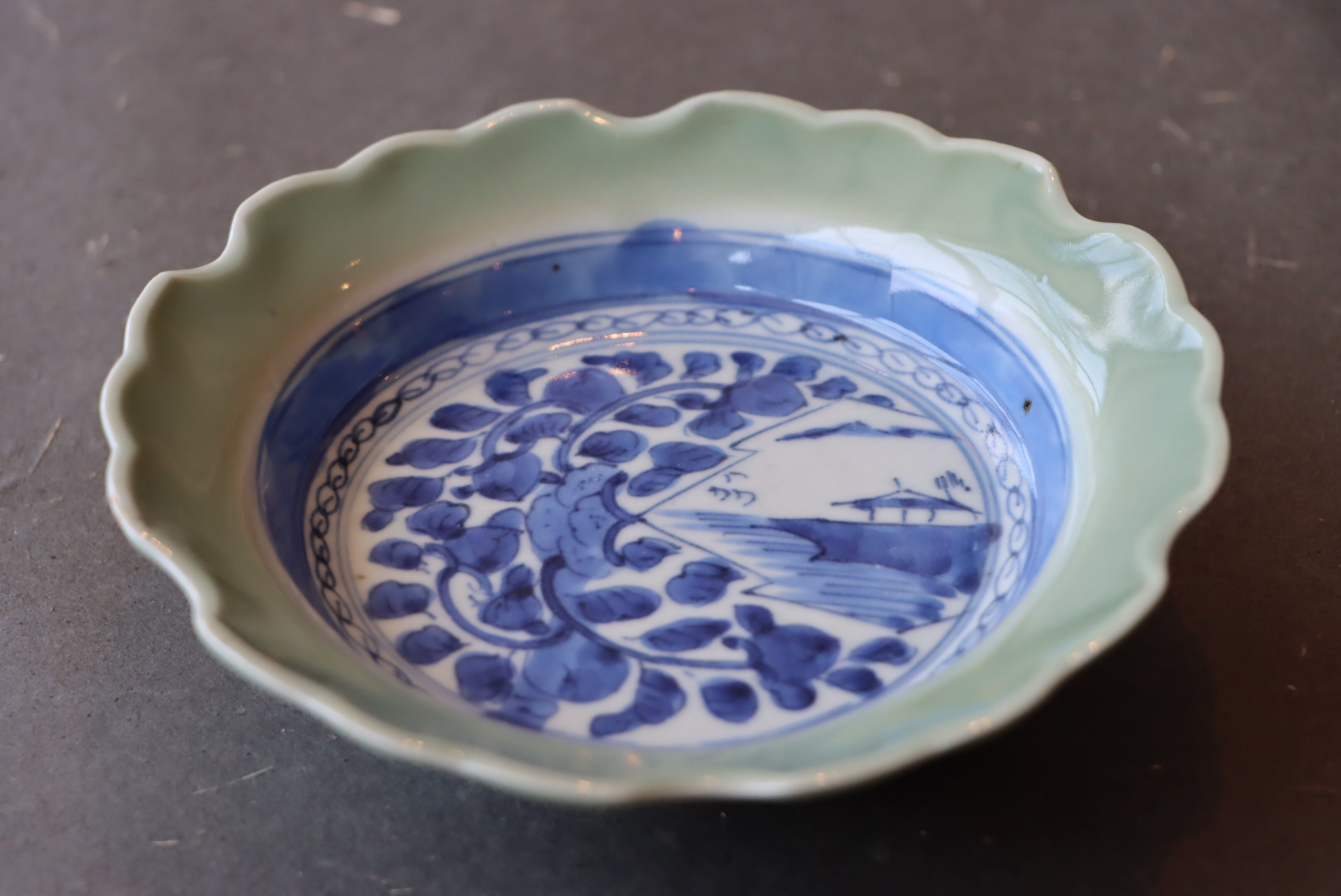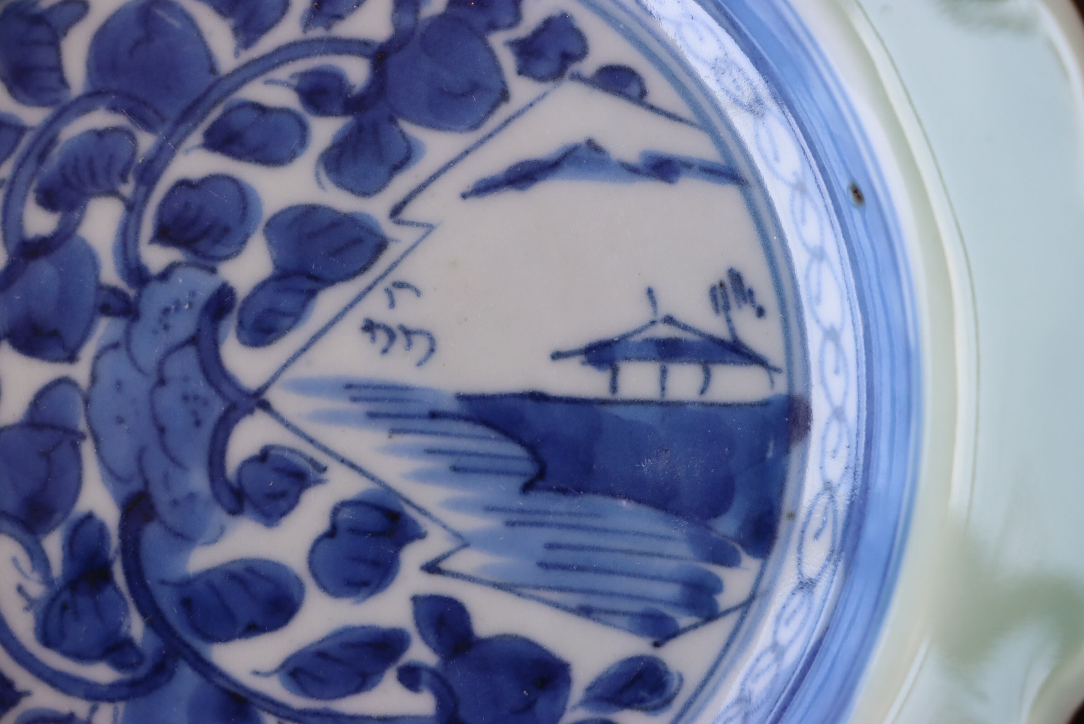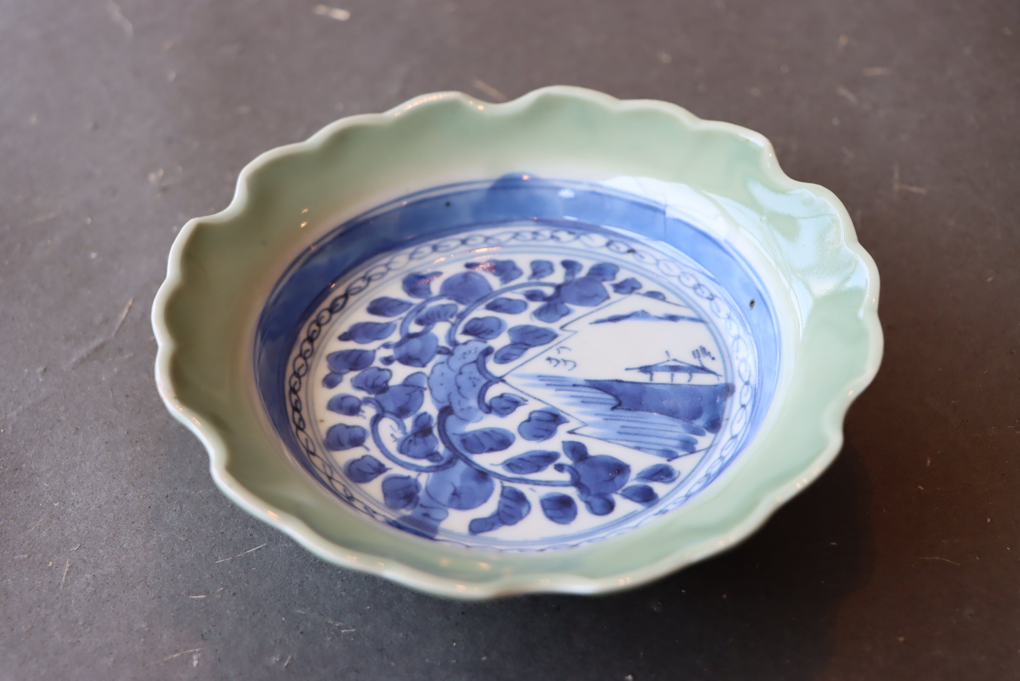 古伊万里 青磁 楼閣山水牡丹文 雪輪形 平向付 B/Old Imari plate B