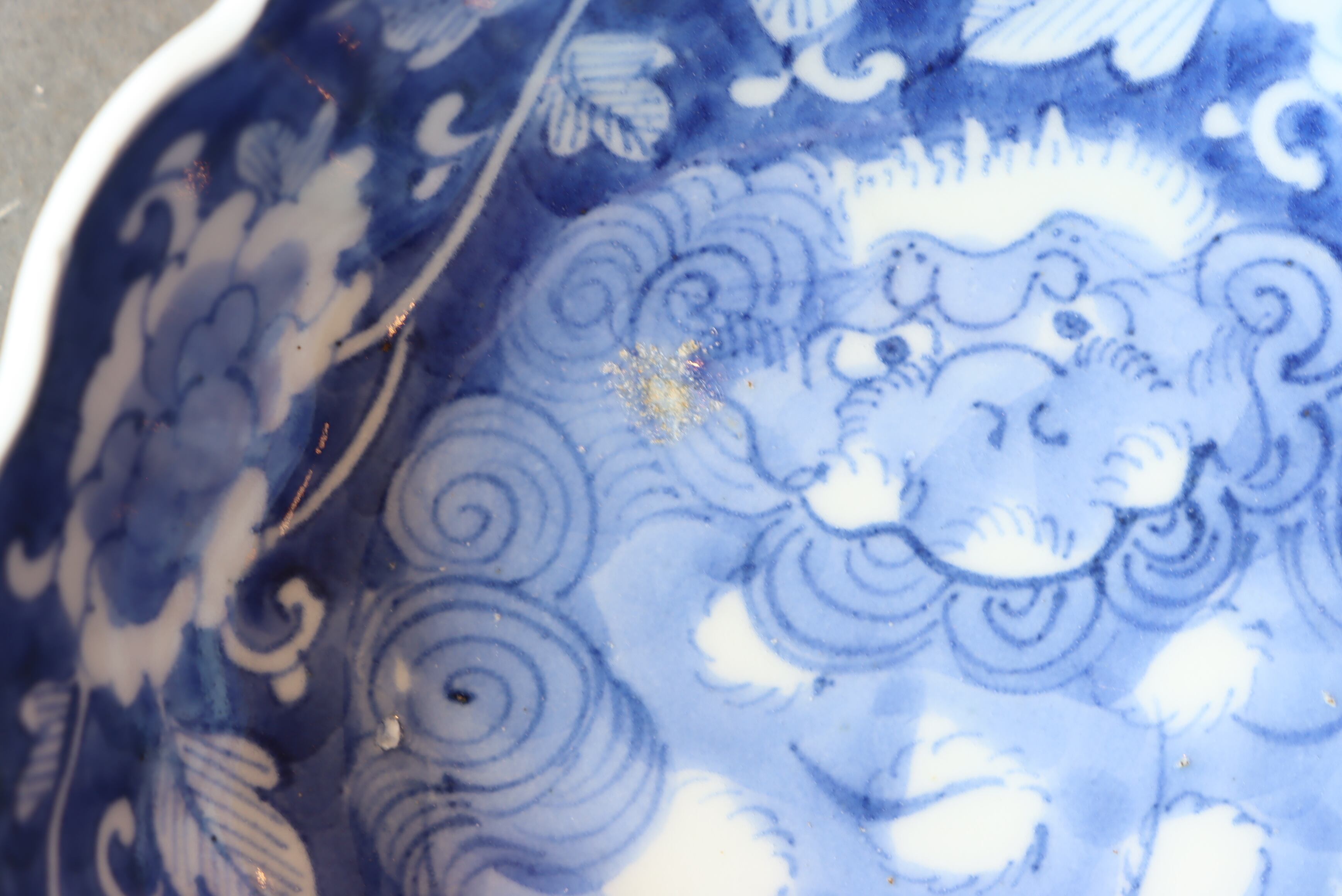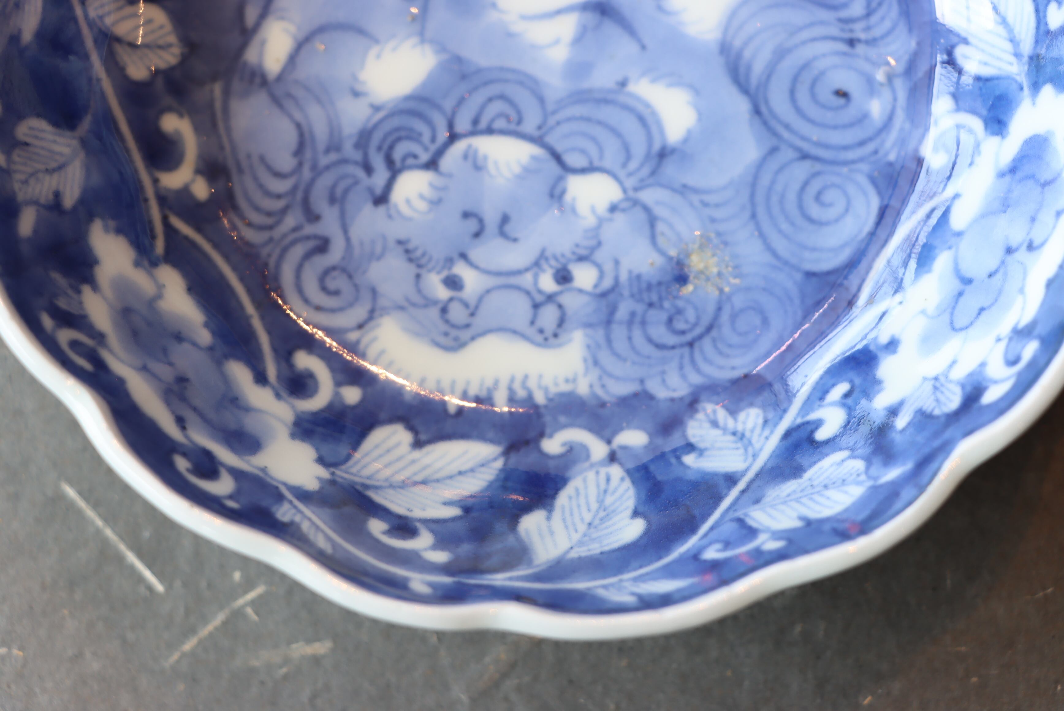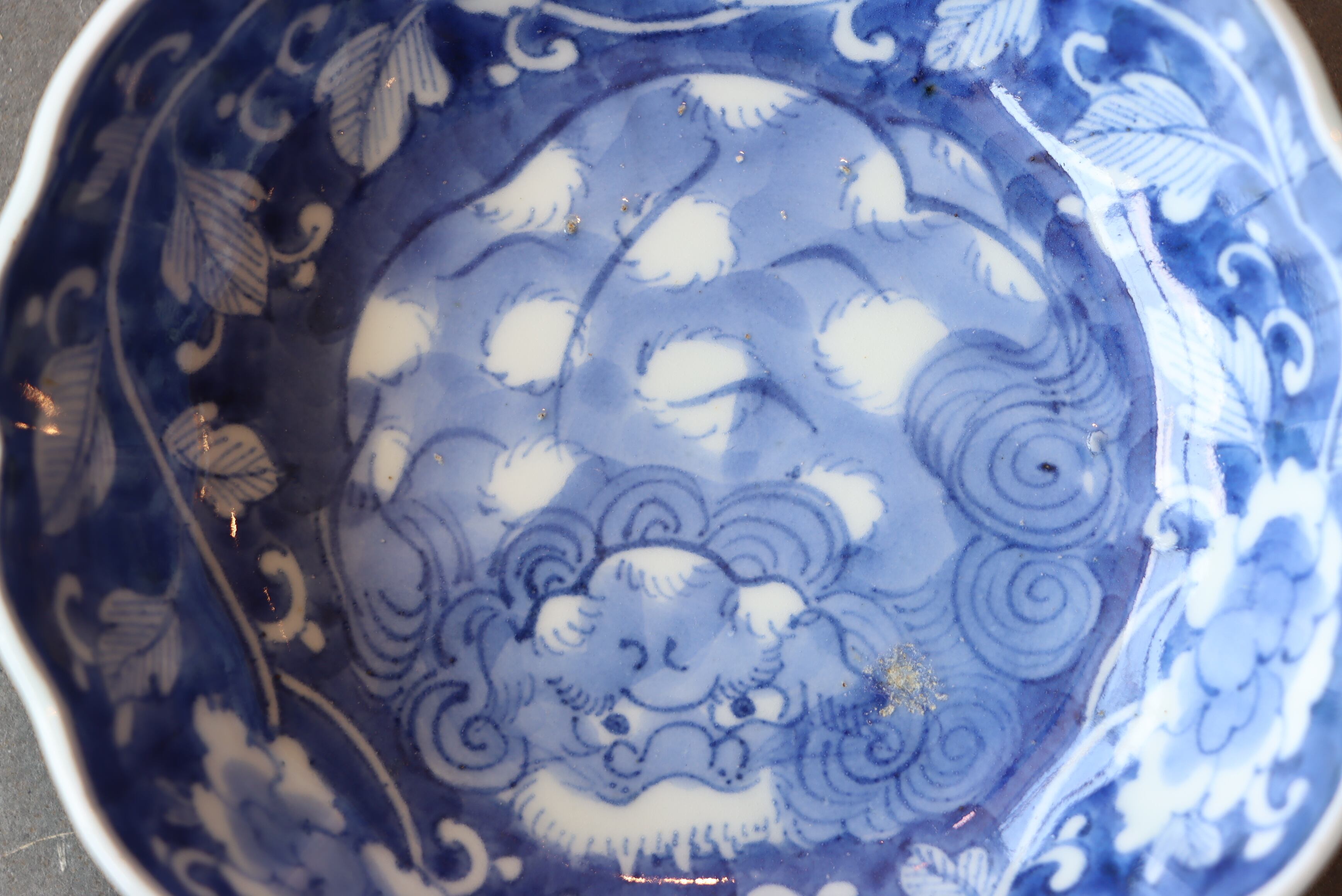 【Old Imari blue and white "Namasu" bowl with lion and peony design C.】