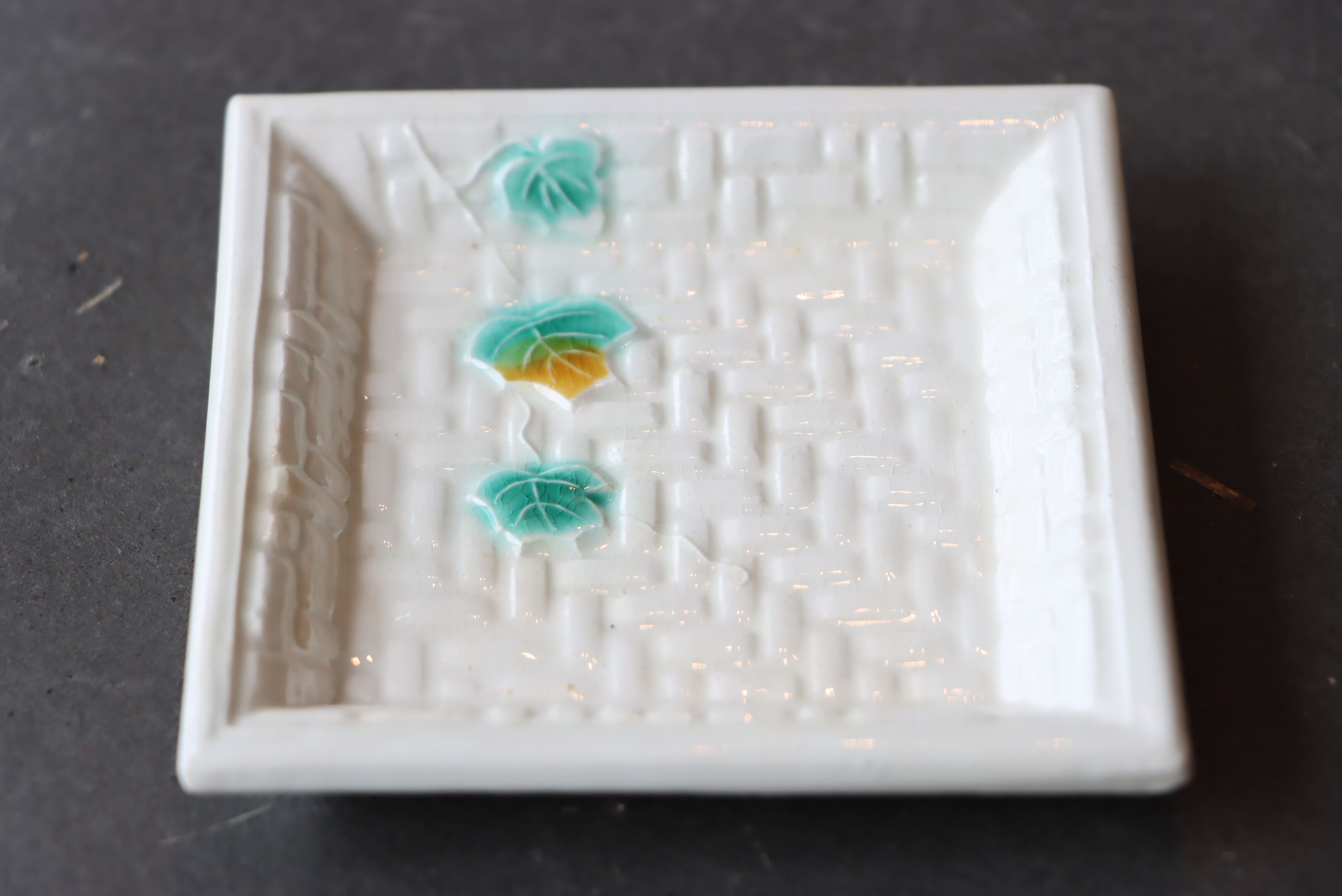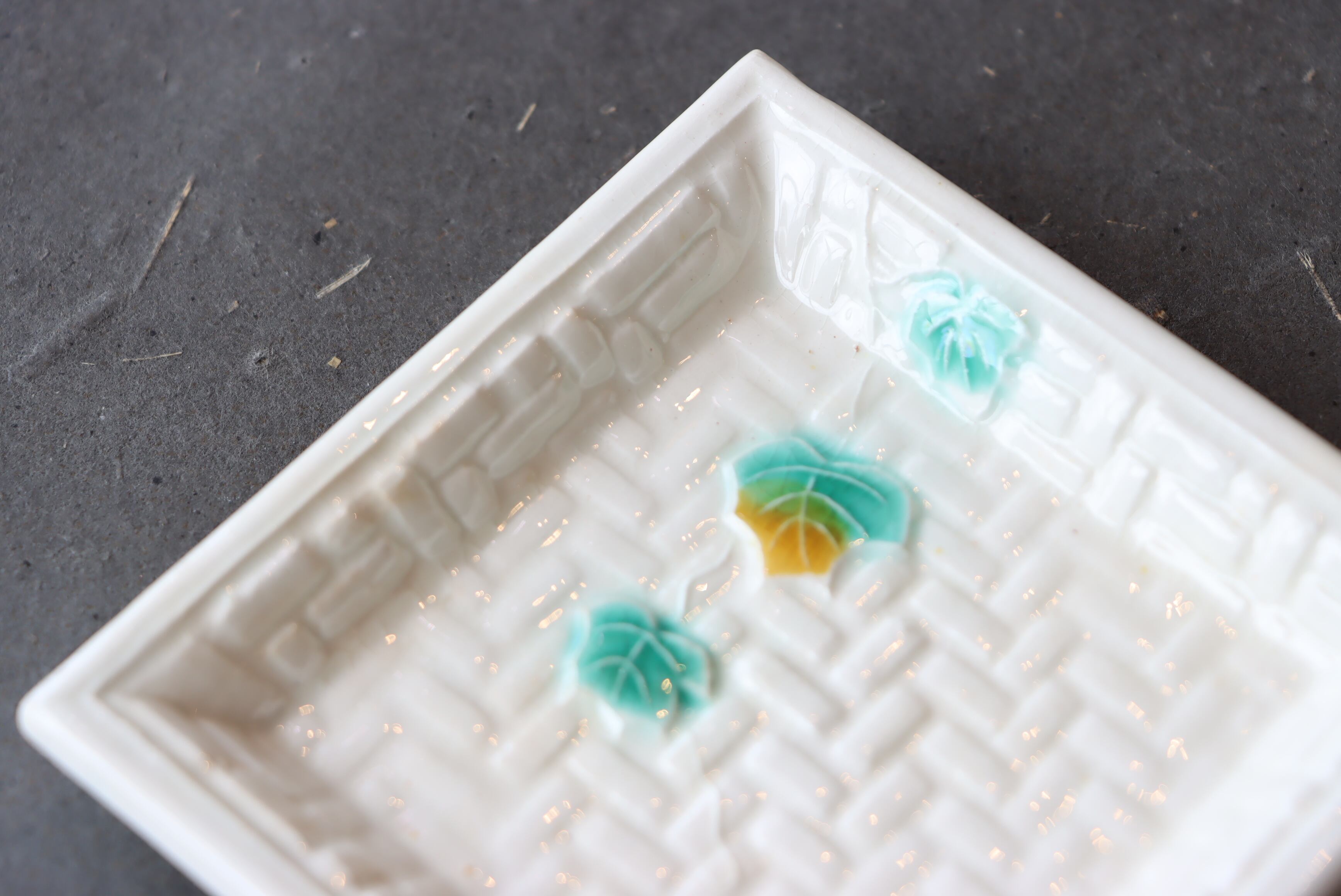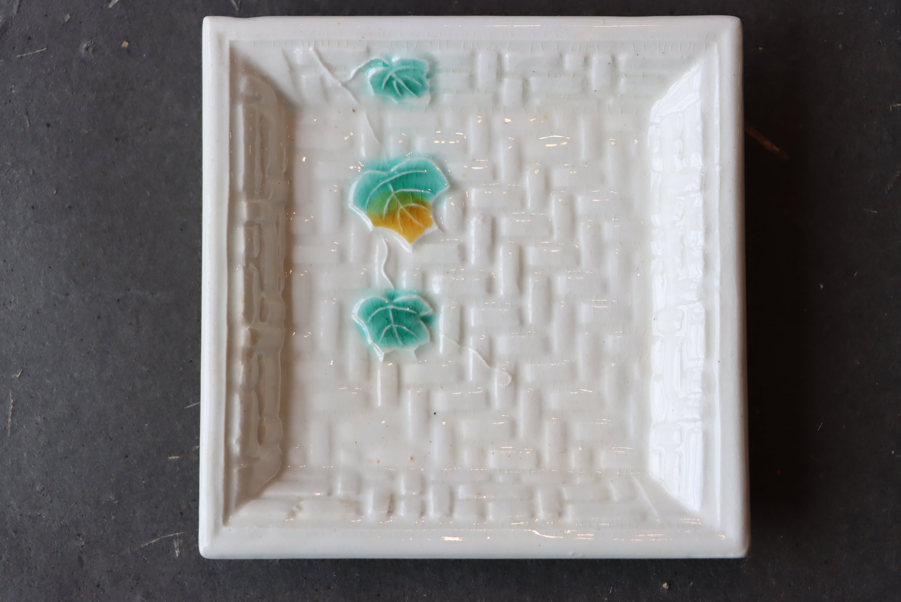 珉平焼 白釉 蔦文 角小皿/Minpei ware small plate.
