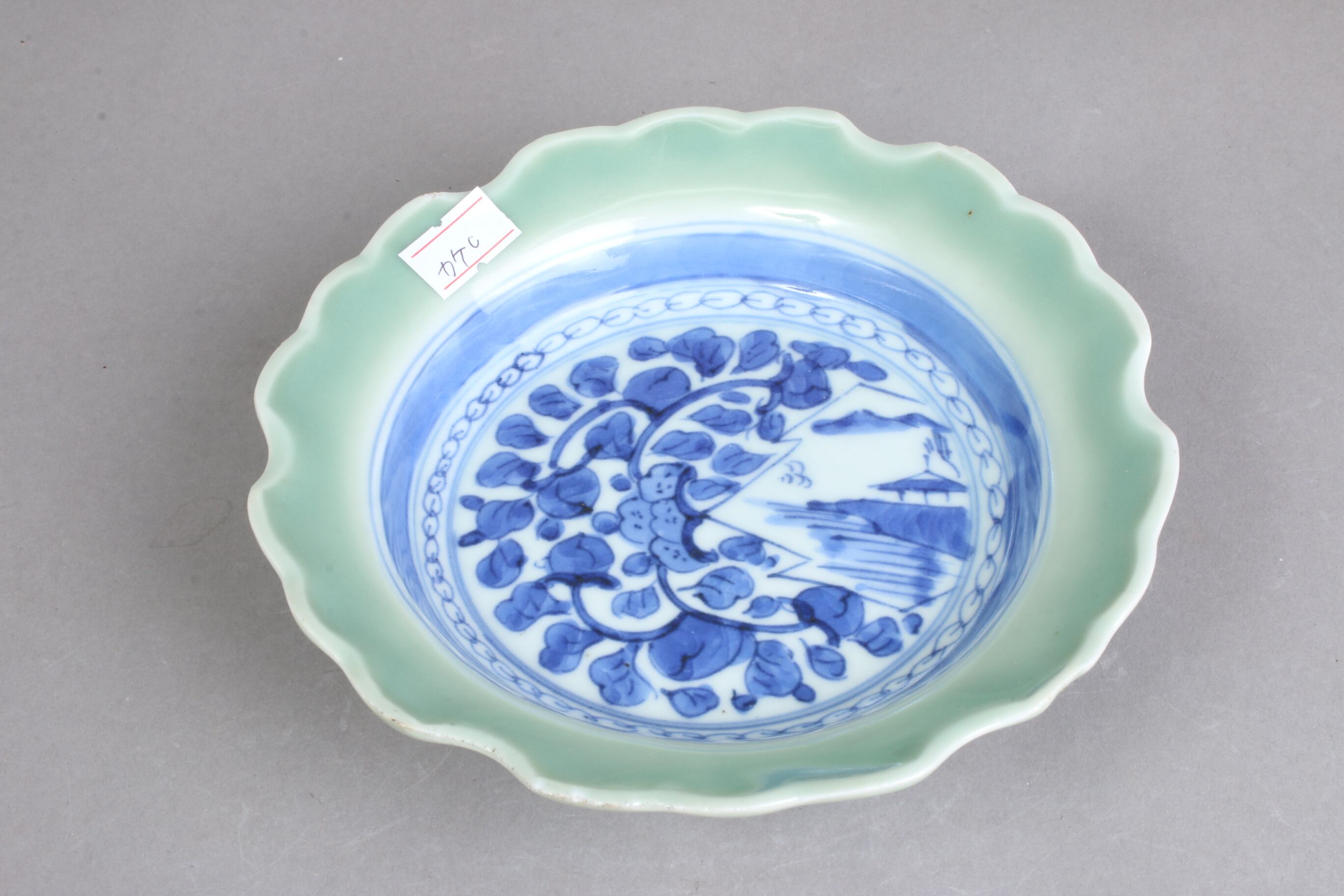 カケ×4 古伊万里 青磁 楼閣山水牡丹文 雪輪形 平向付 C