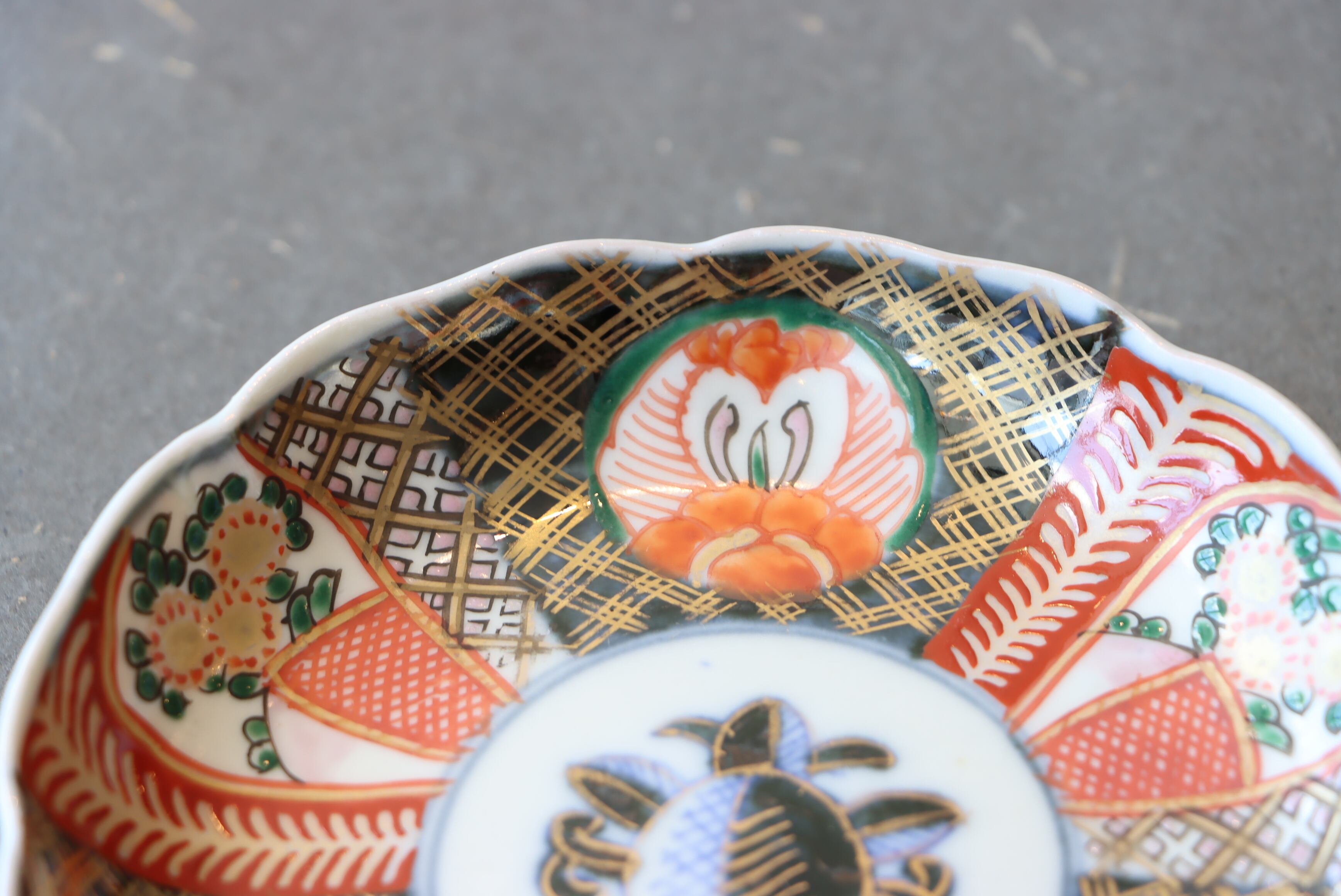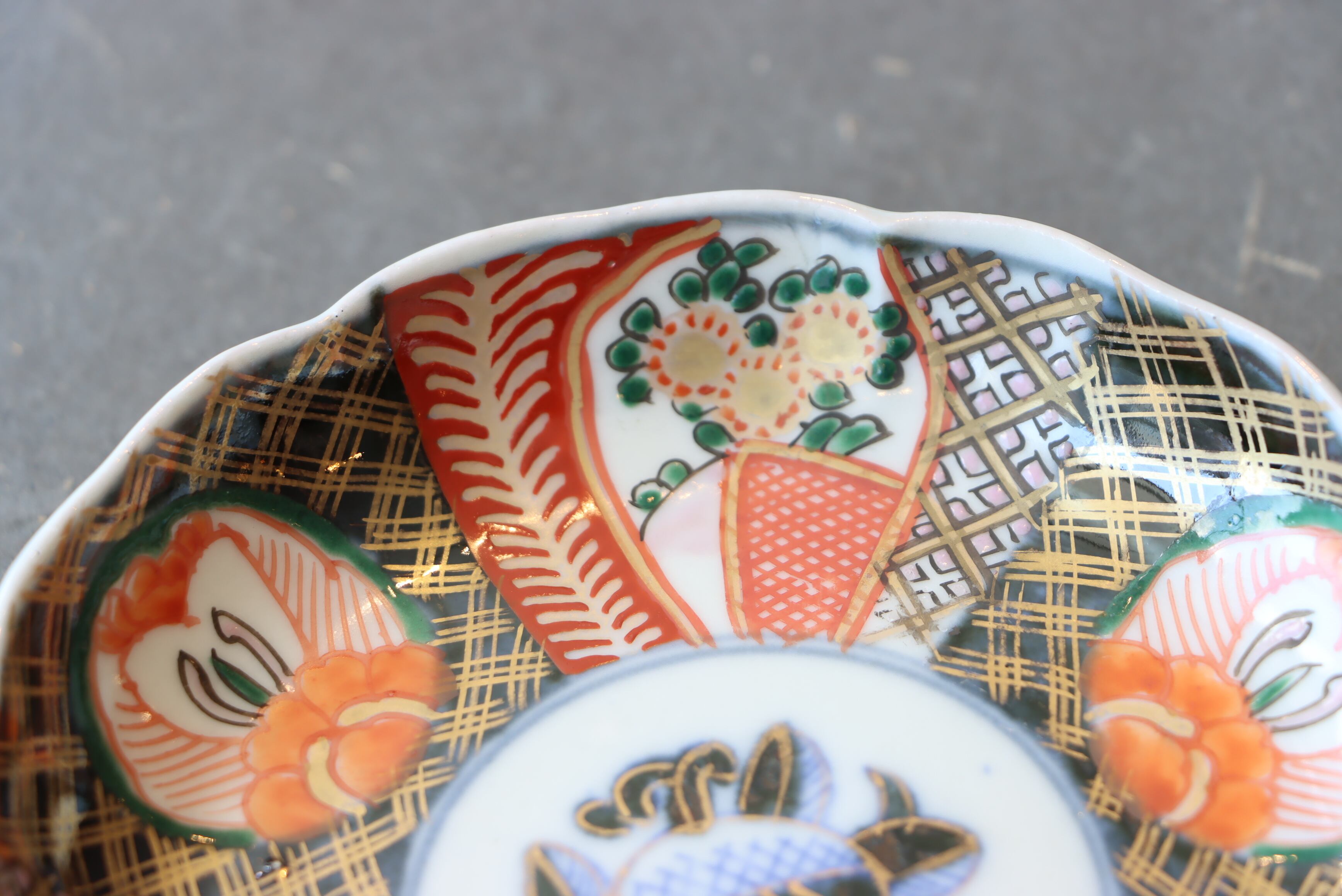 赤絵・金彩・染付の見事な割り付けに、華やかな花文が彩られた一枚✨