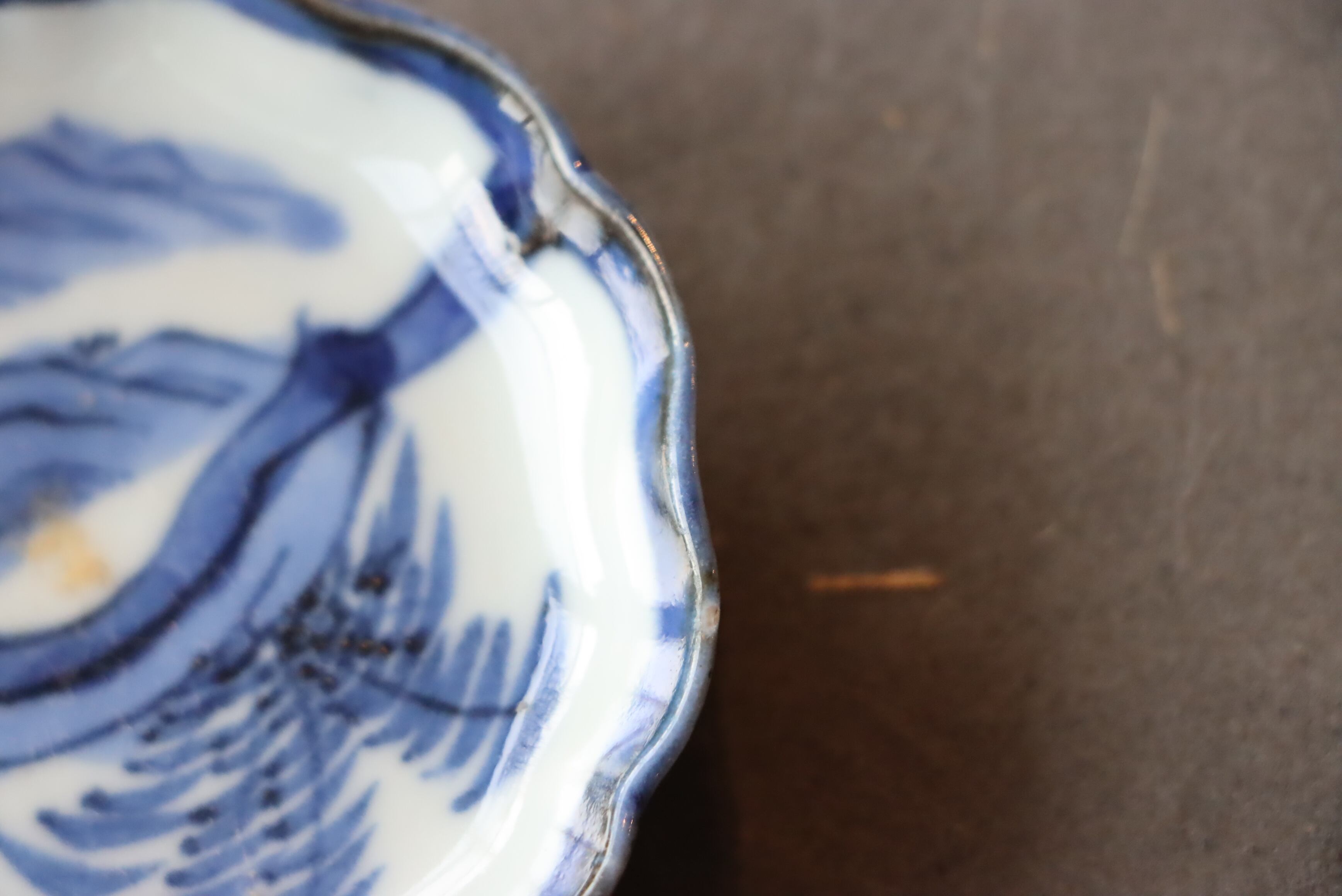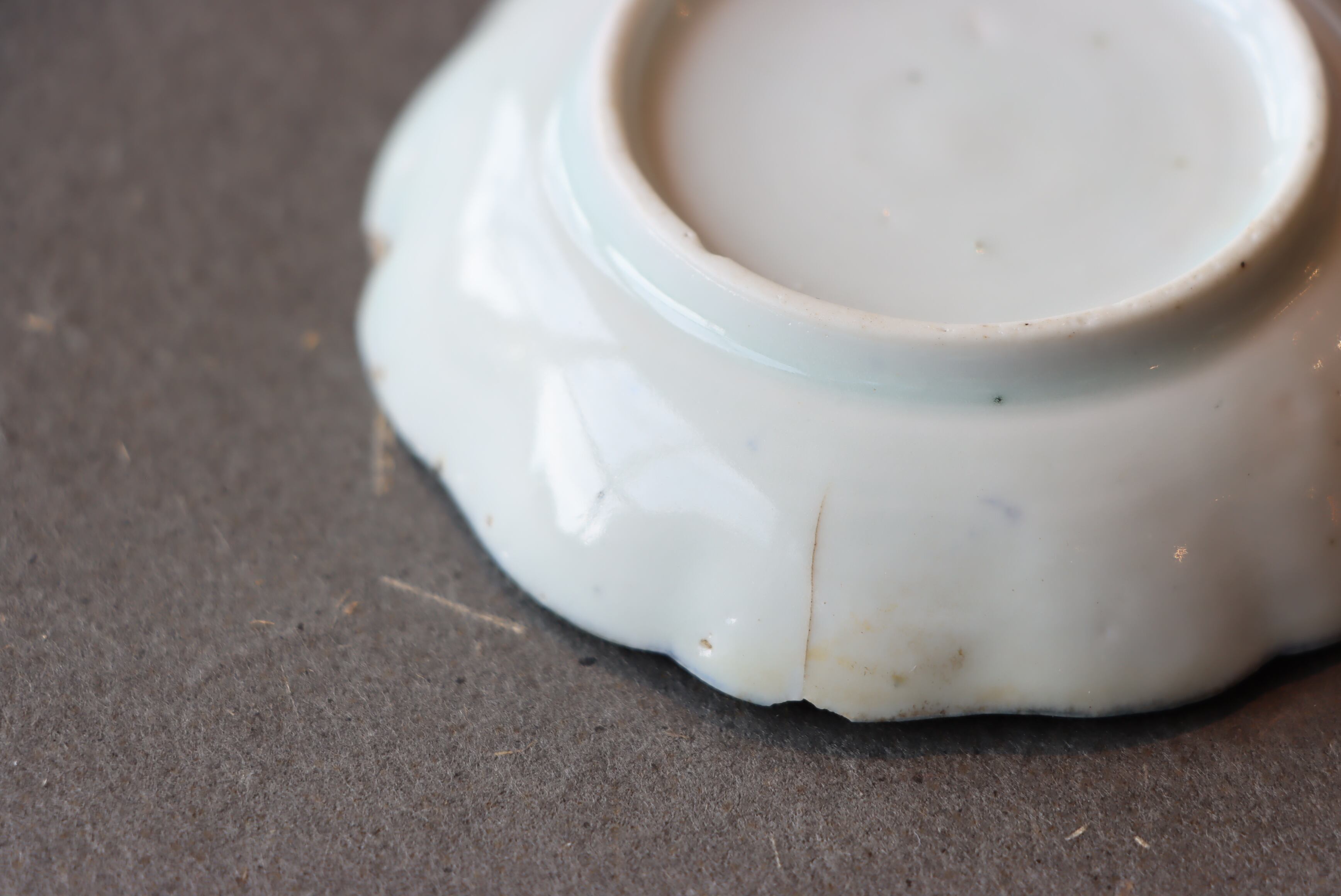 状態:カケ、ニュウ(約1.5センチ)、フチソゲあり。金継ぎ用に。