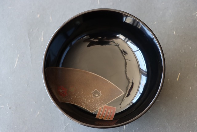 【Lacquered soup bowl with fan and "Genjiko" design.】