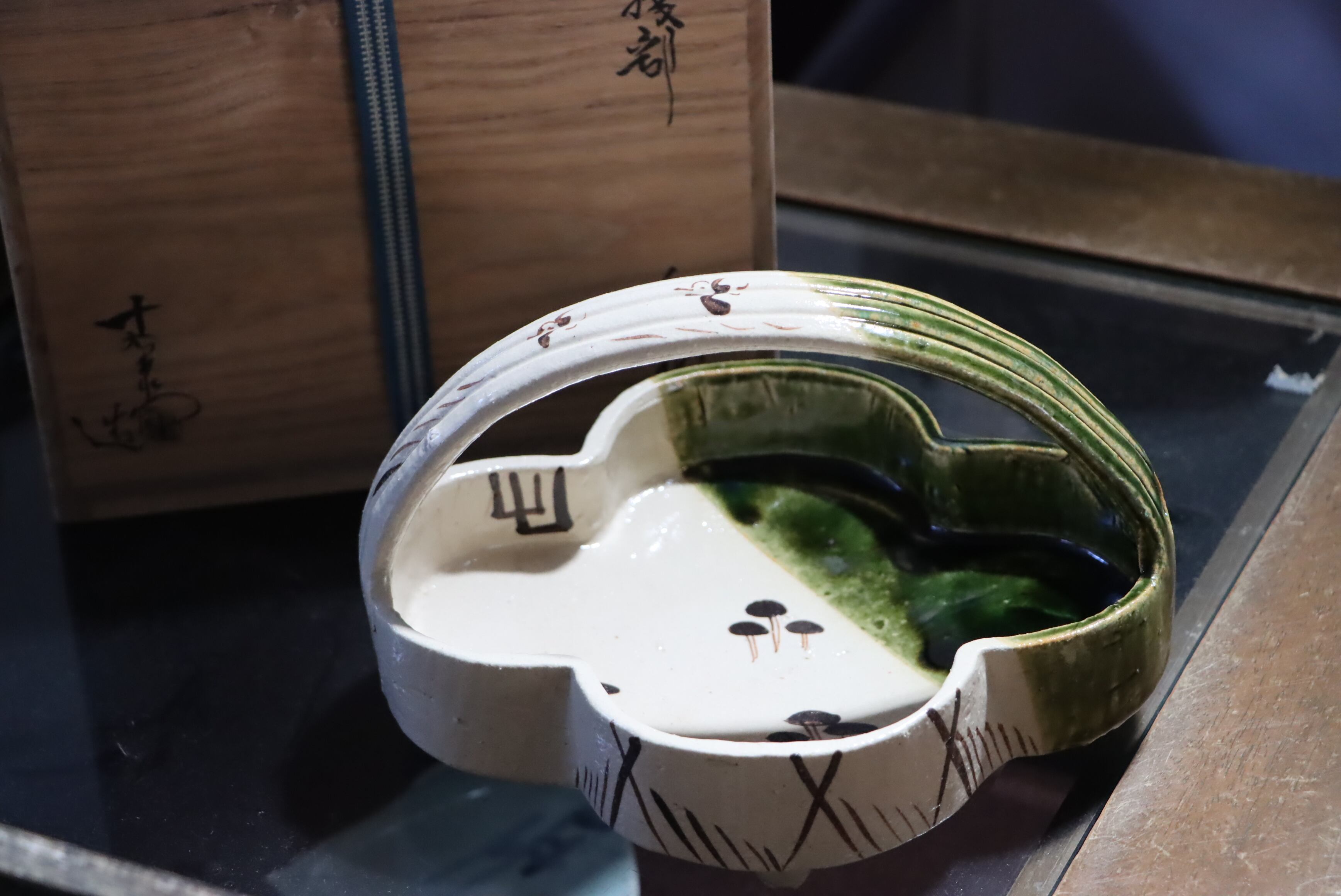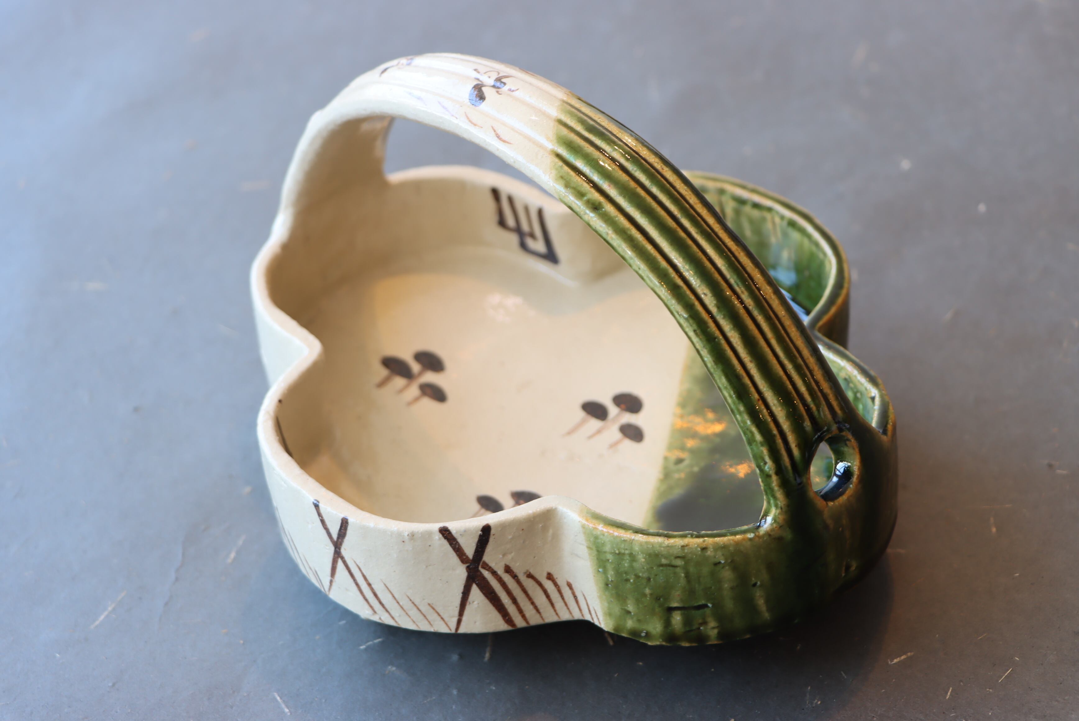 ご紹介する器は、力強い造形と深い緑釉が美しい 織部の手付き鉢‼