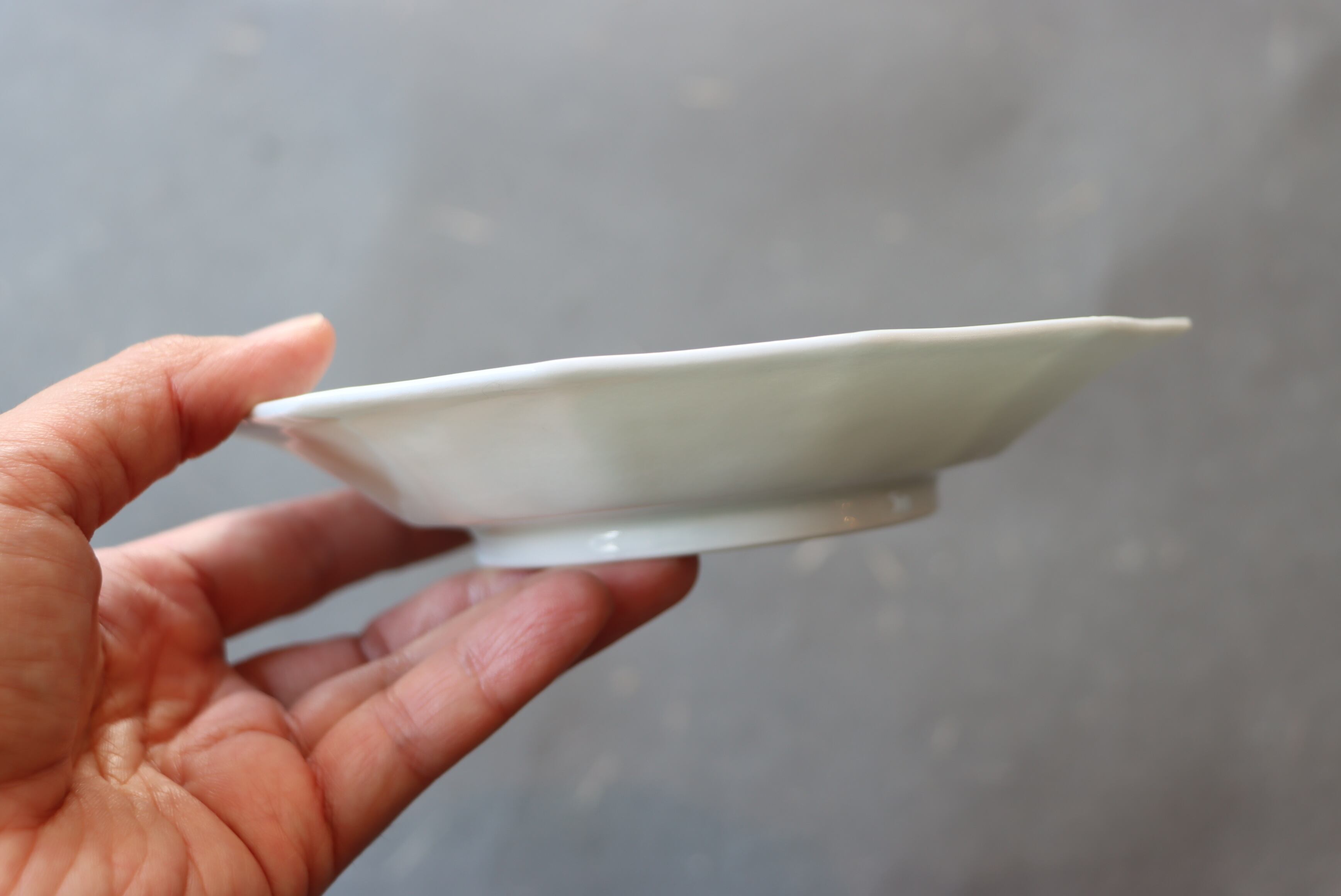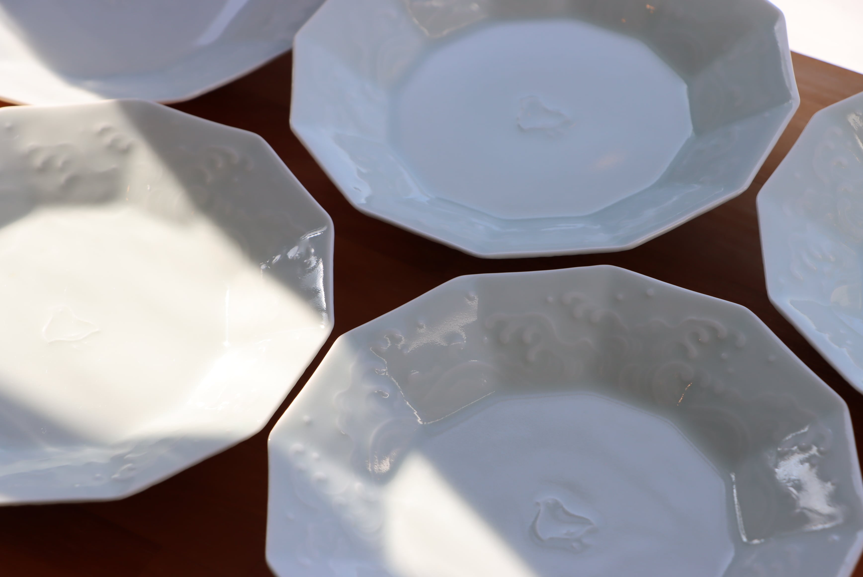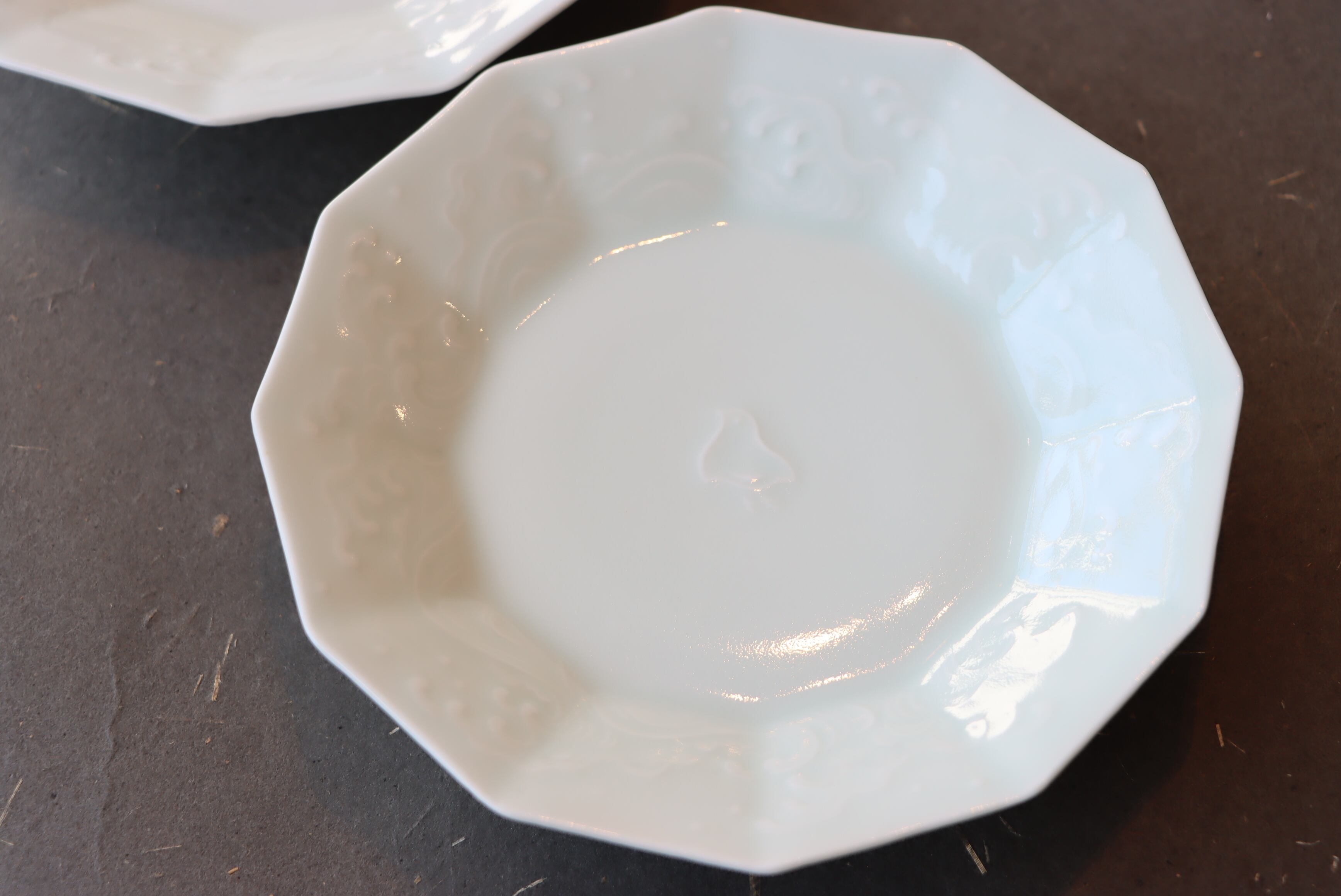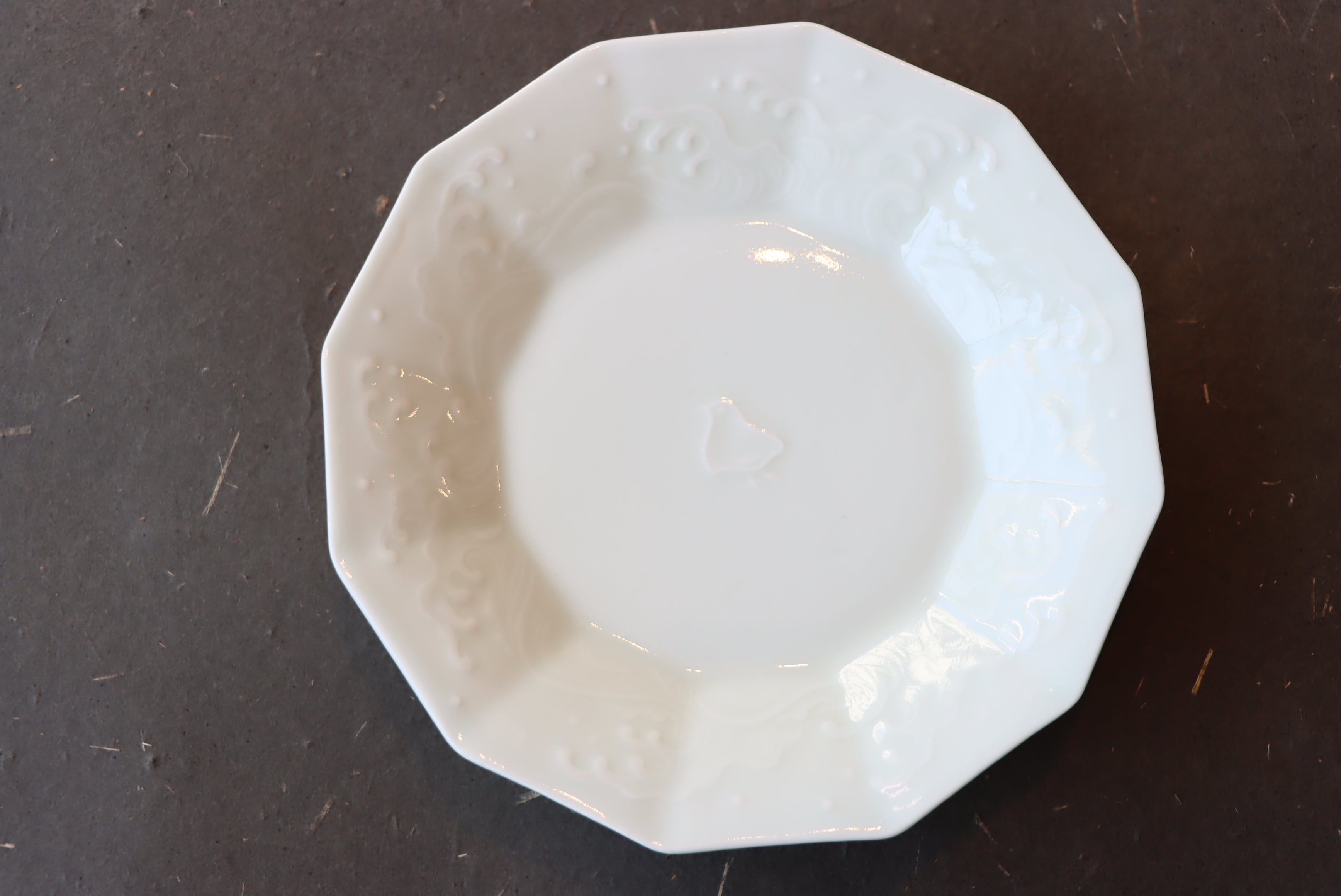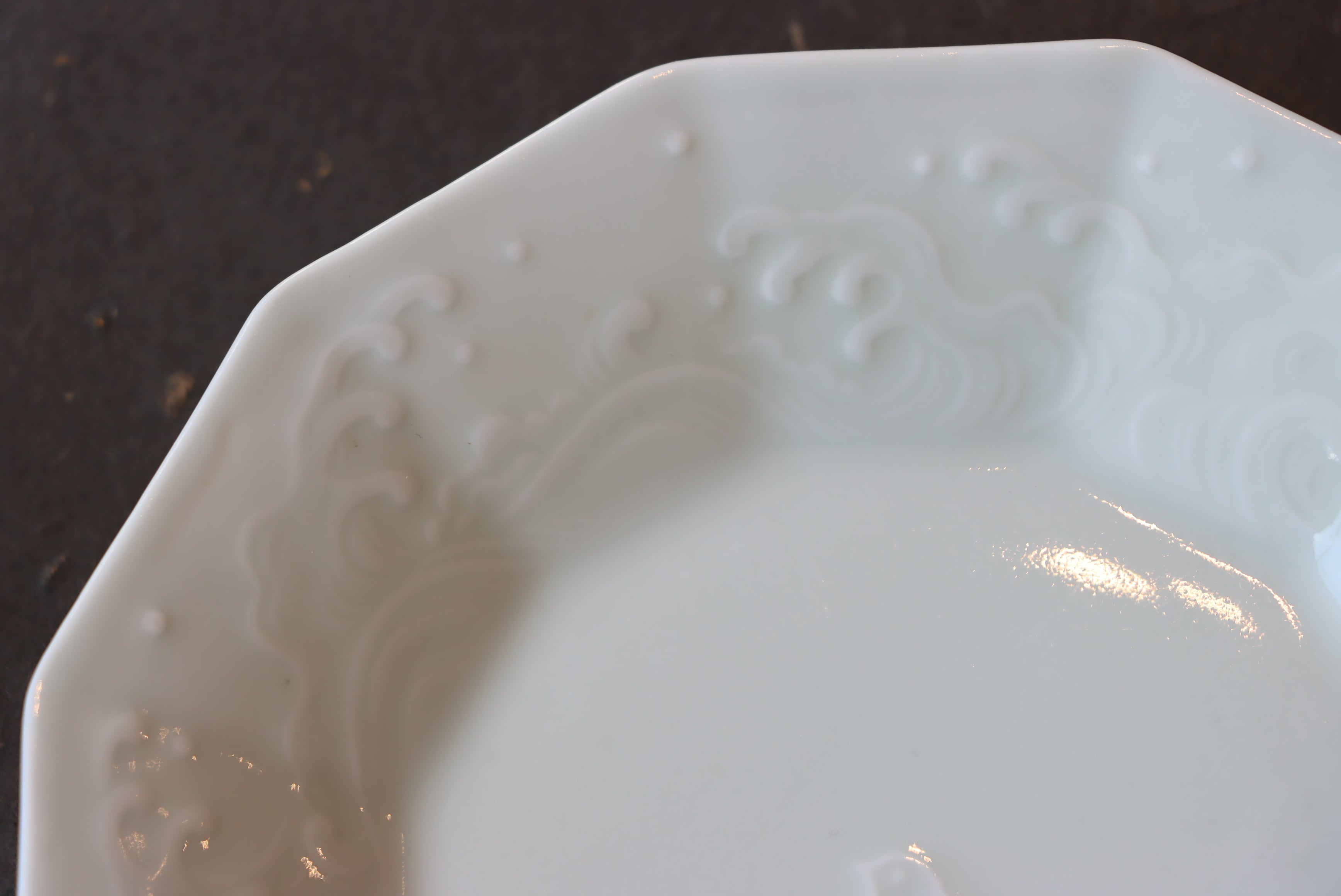 平戸焼 太白 浮彫 波千鳥文 十二角 中皿 五寸/Hirado ware medium size plate