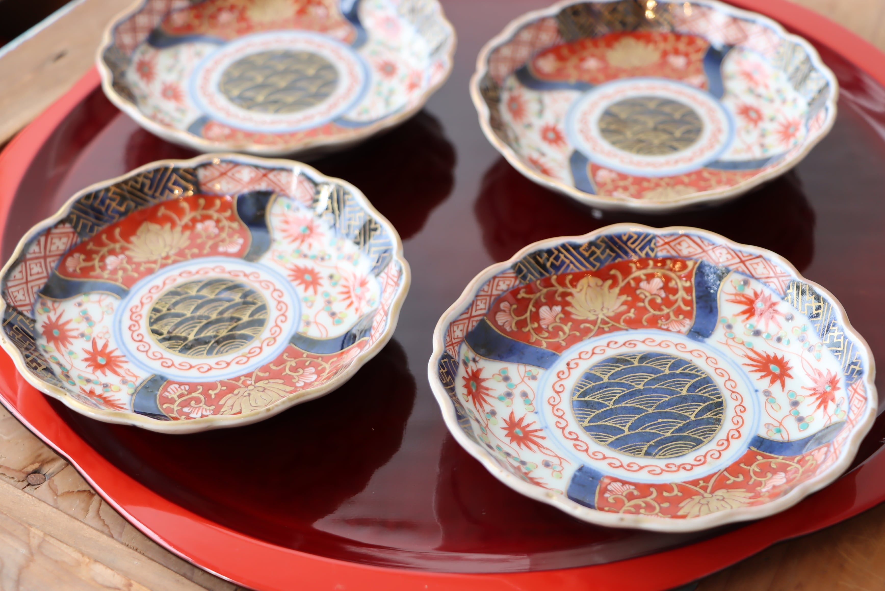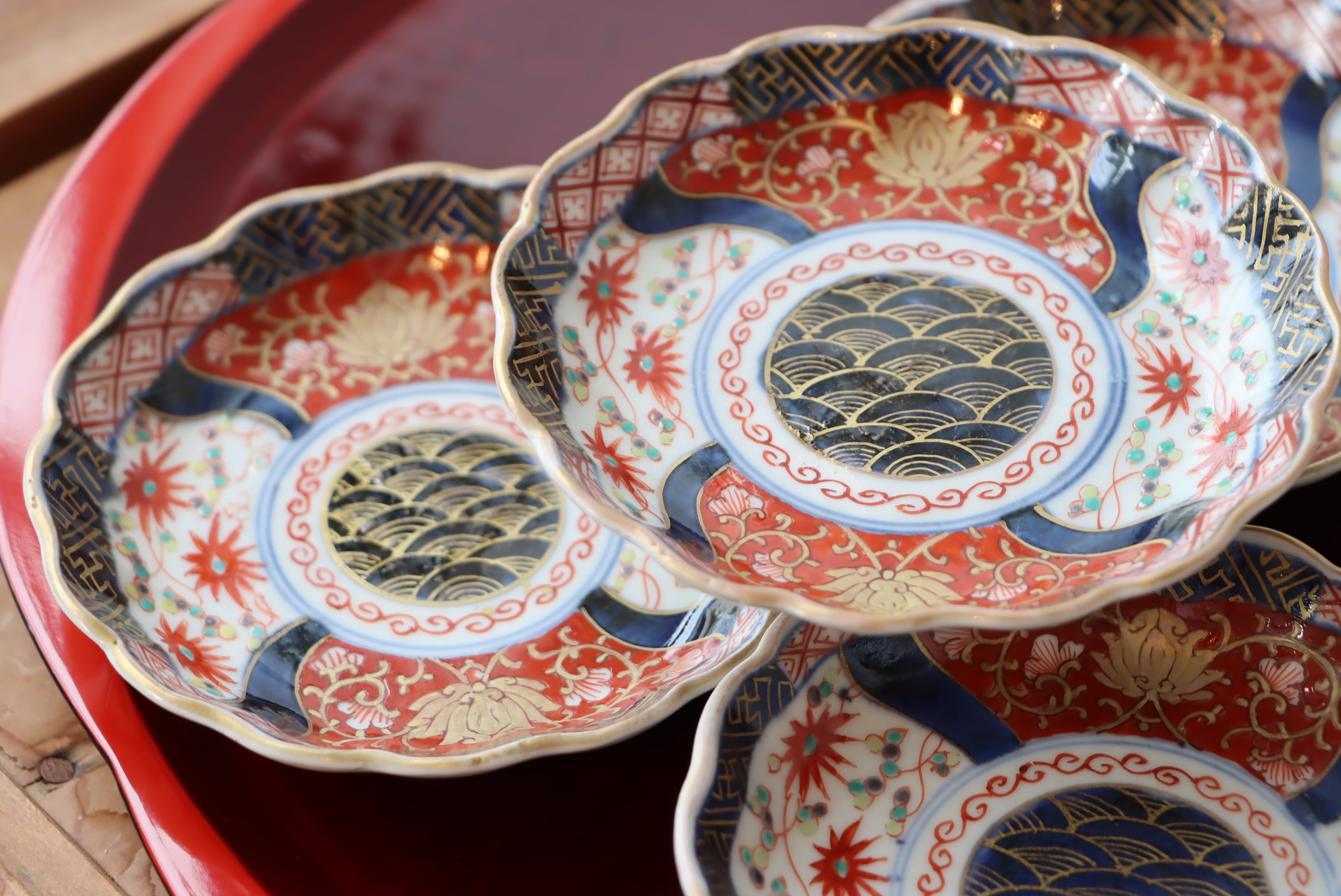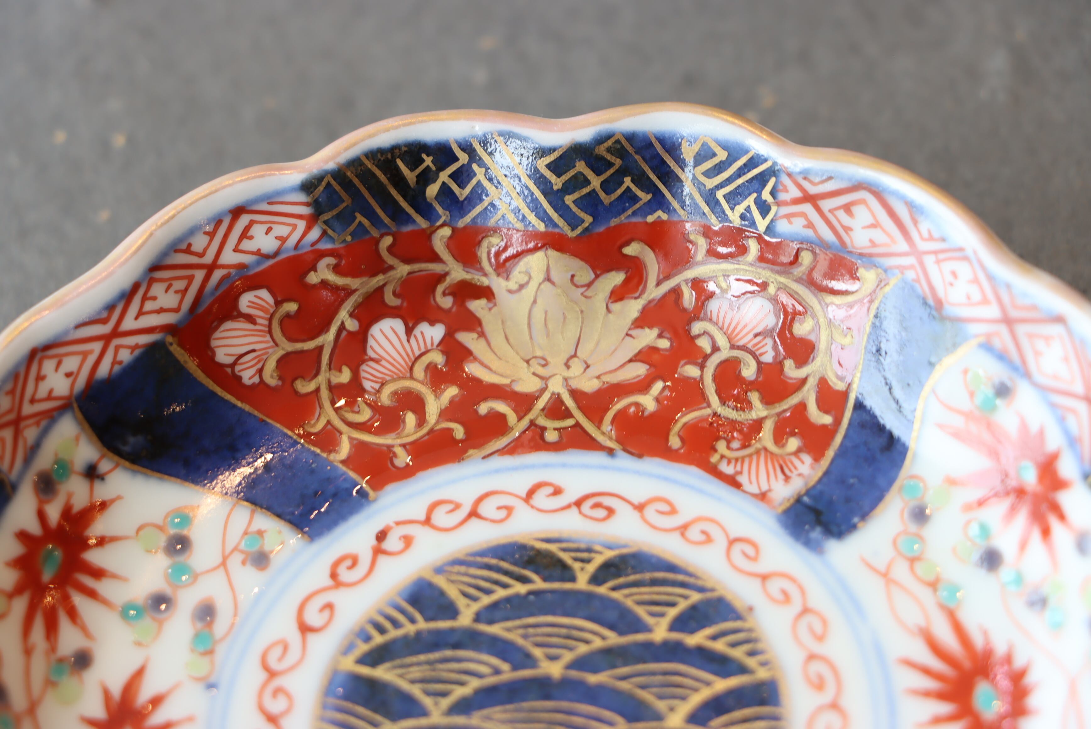 見込み中央には、金彩で緻密に描かれた青海波文――穏やかな波が永遠に続くような吉祥の意匠です。