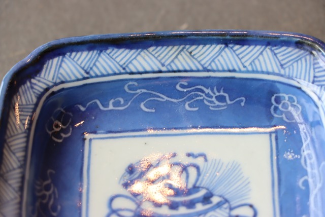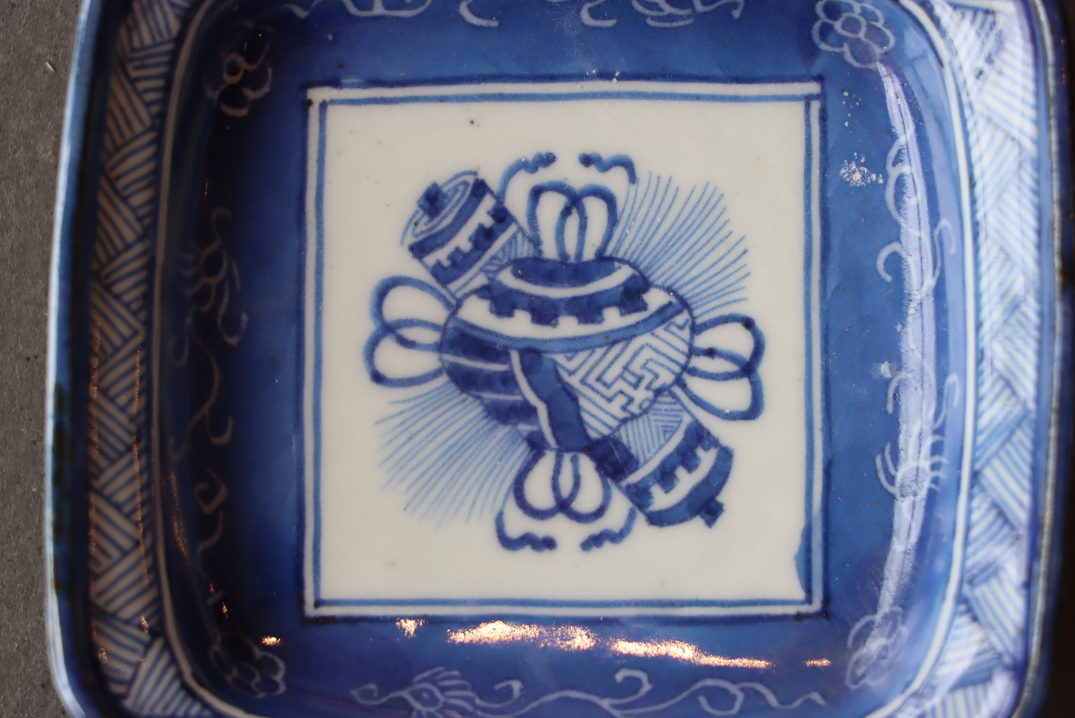 【Imari blue and white square shaped plate with treasure scroll motif.】