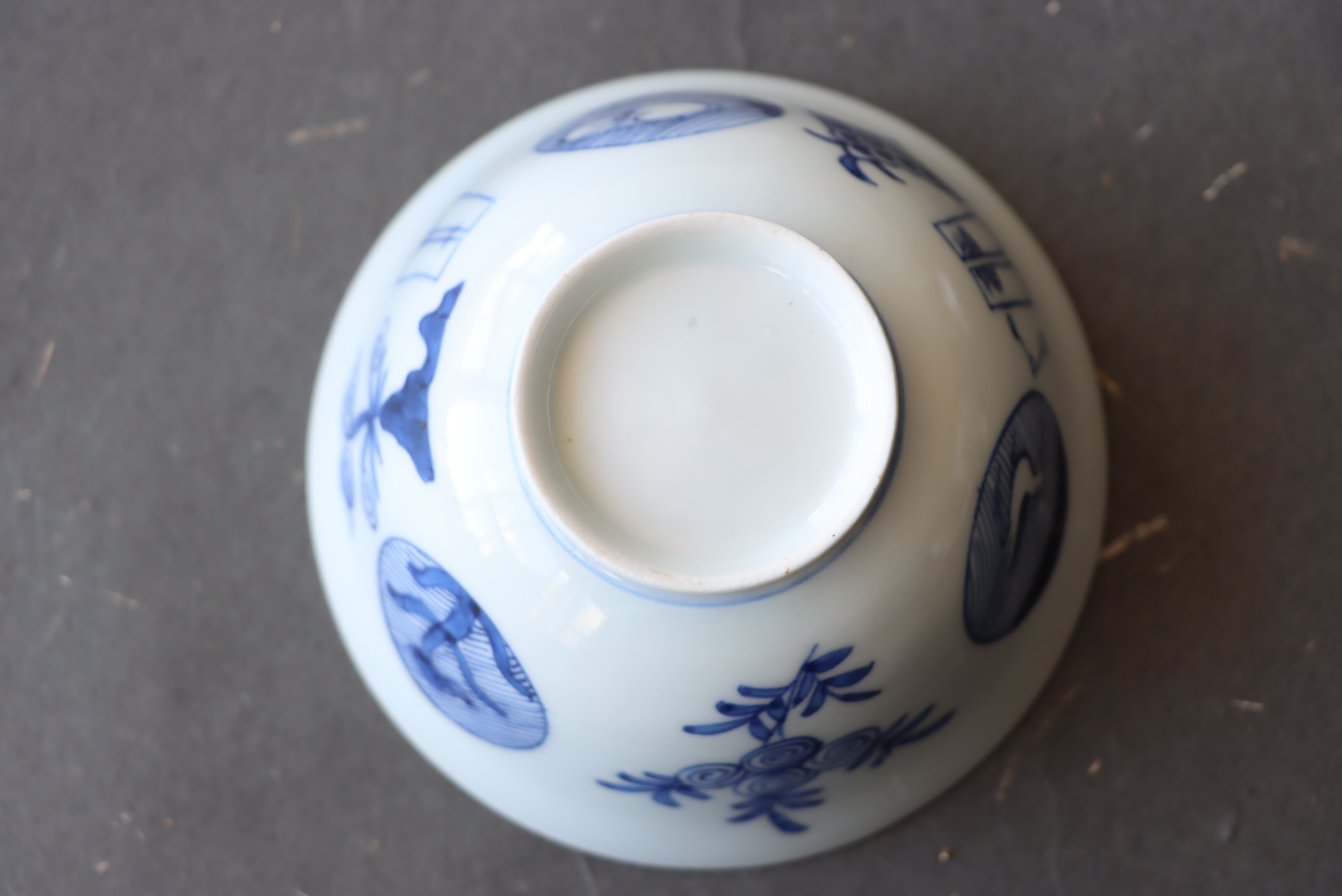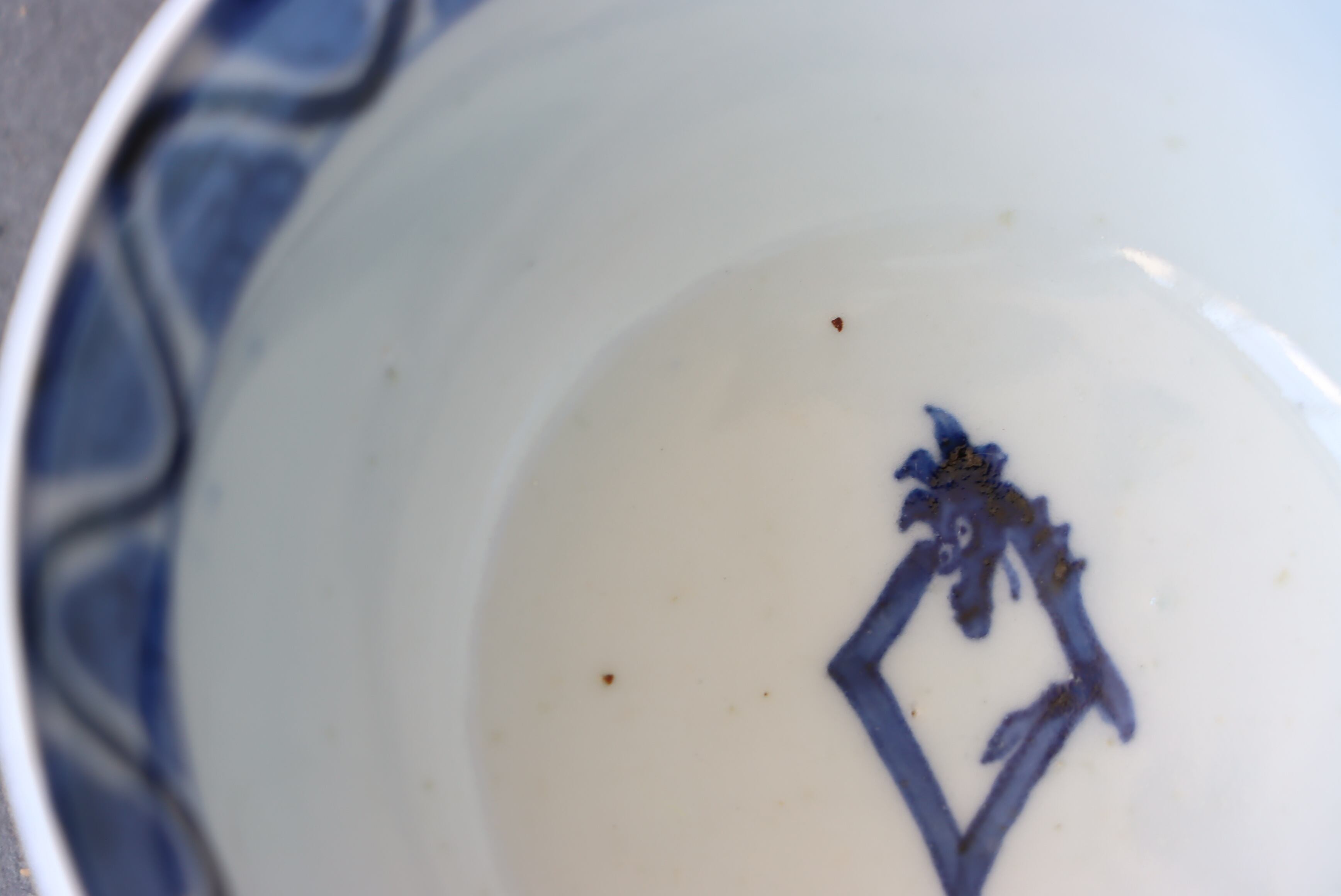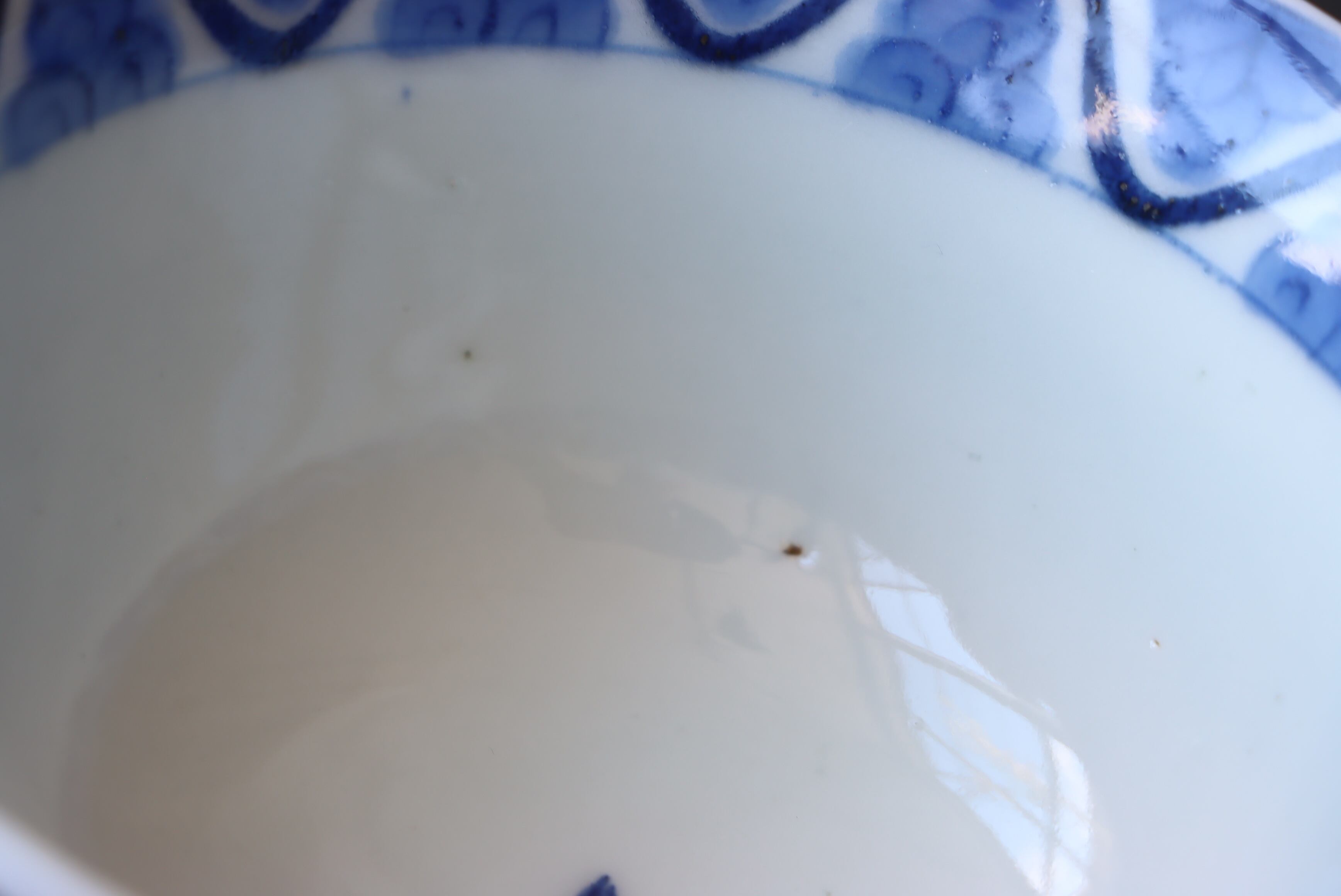 【Old Imari blue and white covered bowl with rabbit, bird and dragon design.】