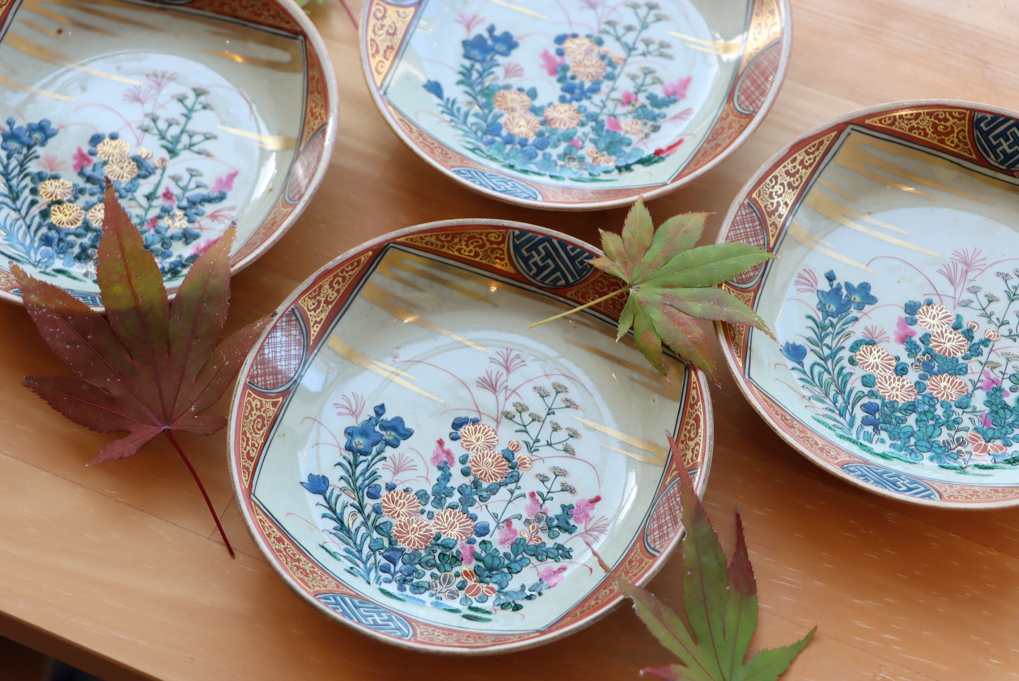 【Kutani small plate with autumn flower design in overglaze enamels.】