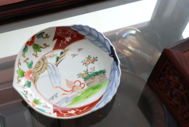 伊万里焼 色絵 山水瓢文 桃形 変形皿/Imari peach shaped plate