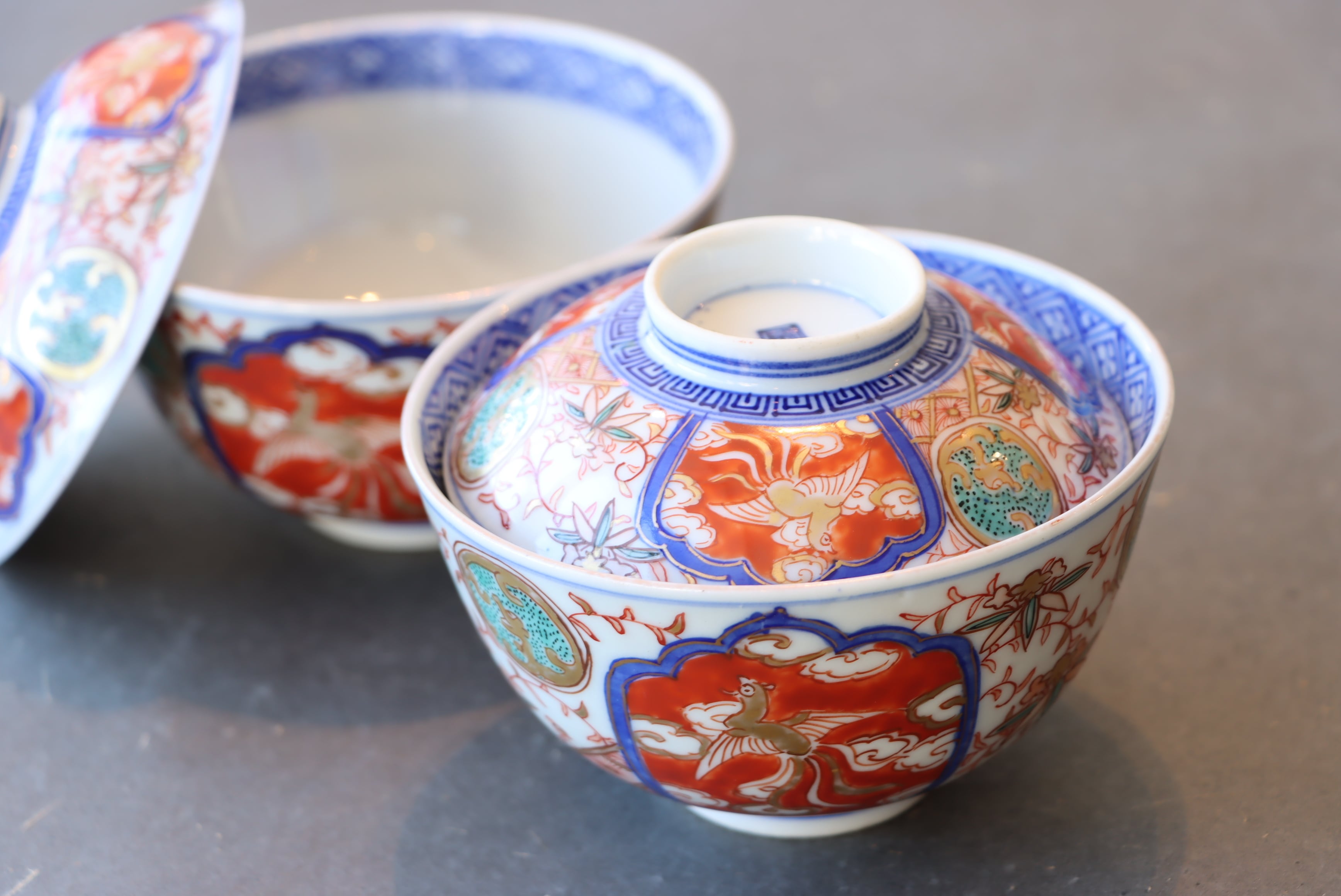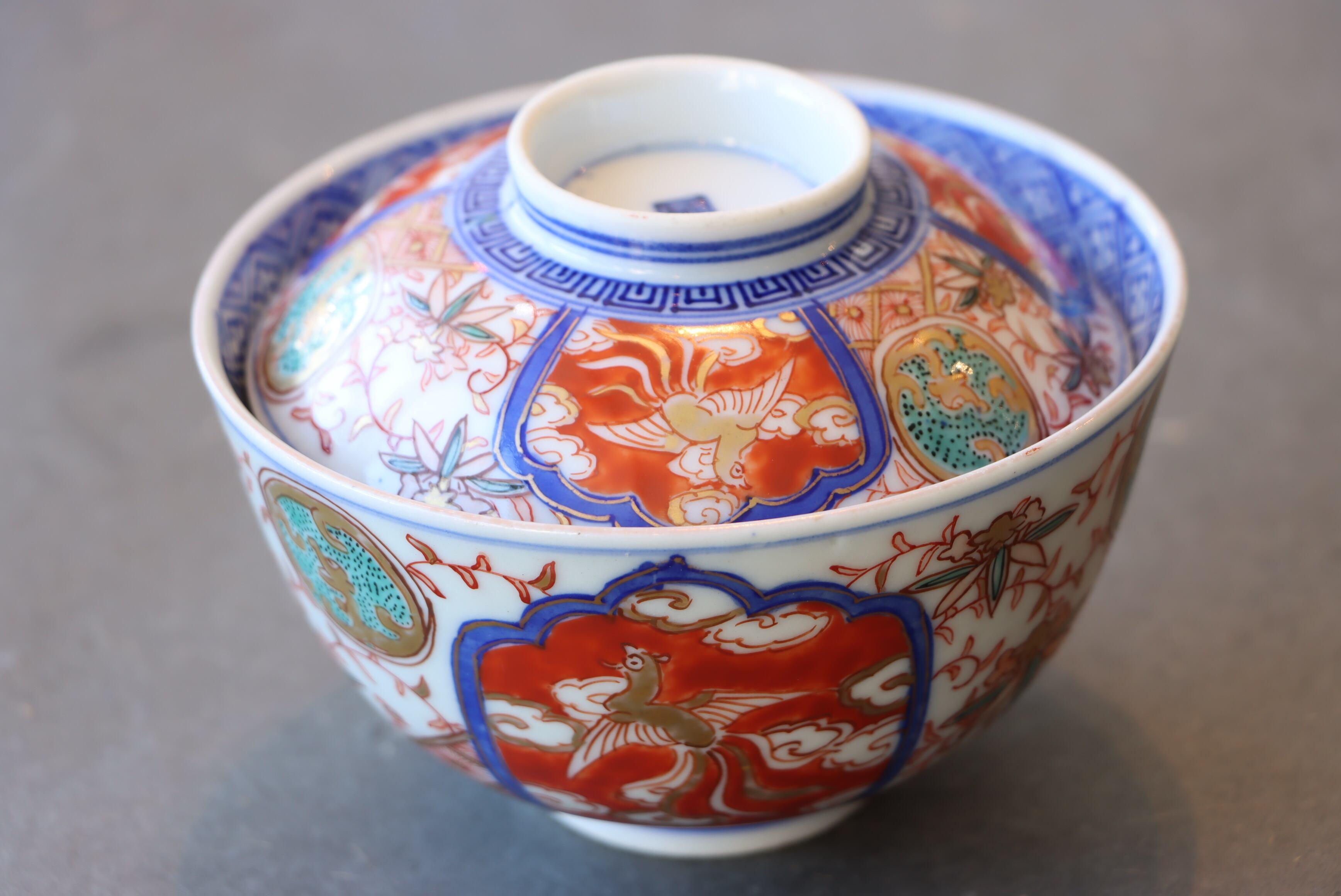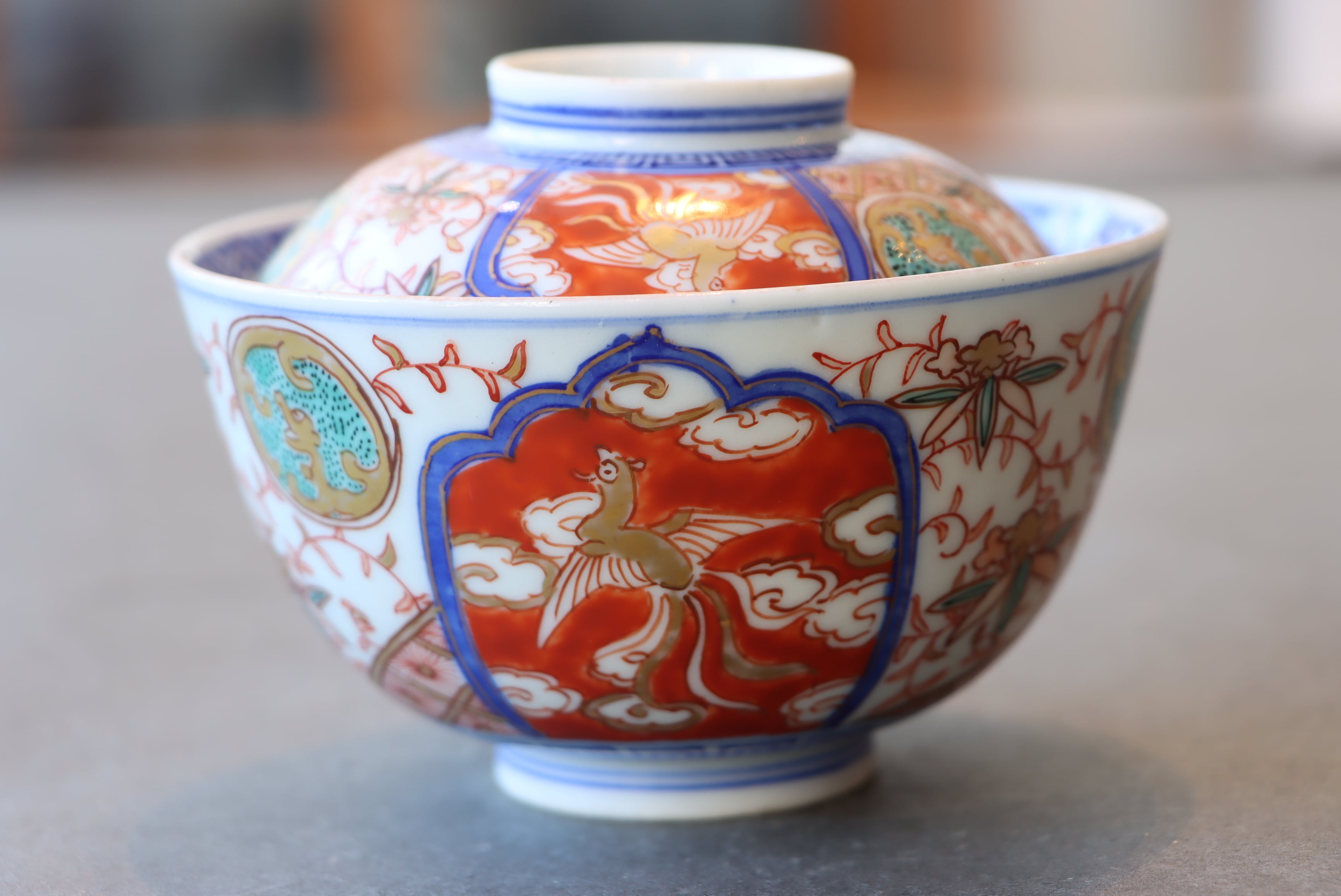 【Imari covered bowl with phoenix design in overglaze enamels.】