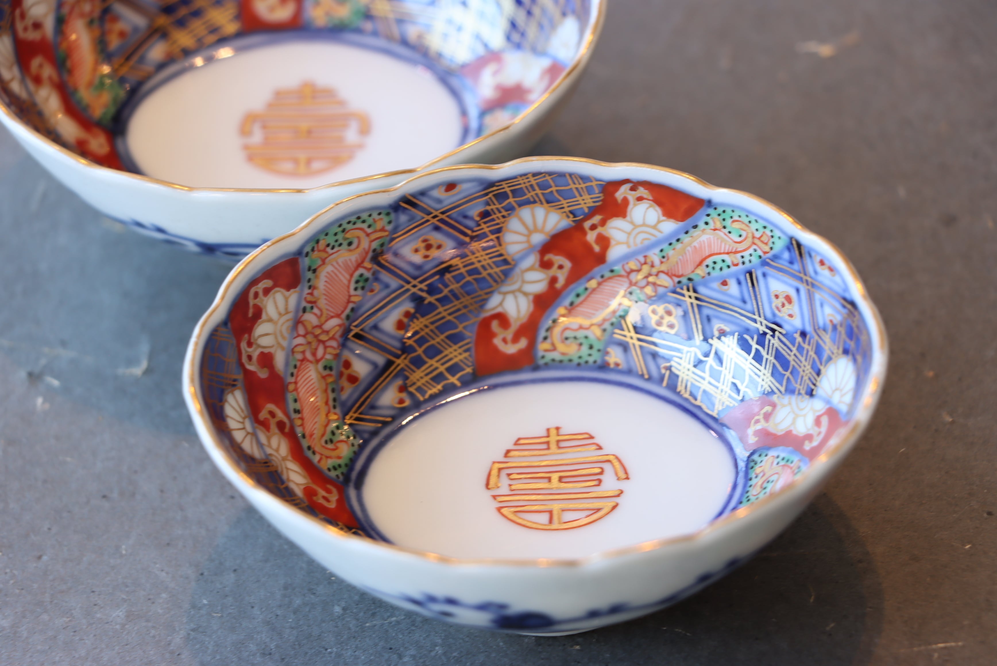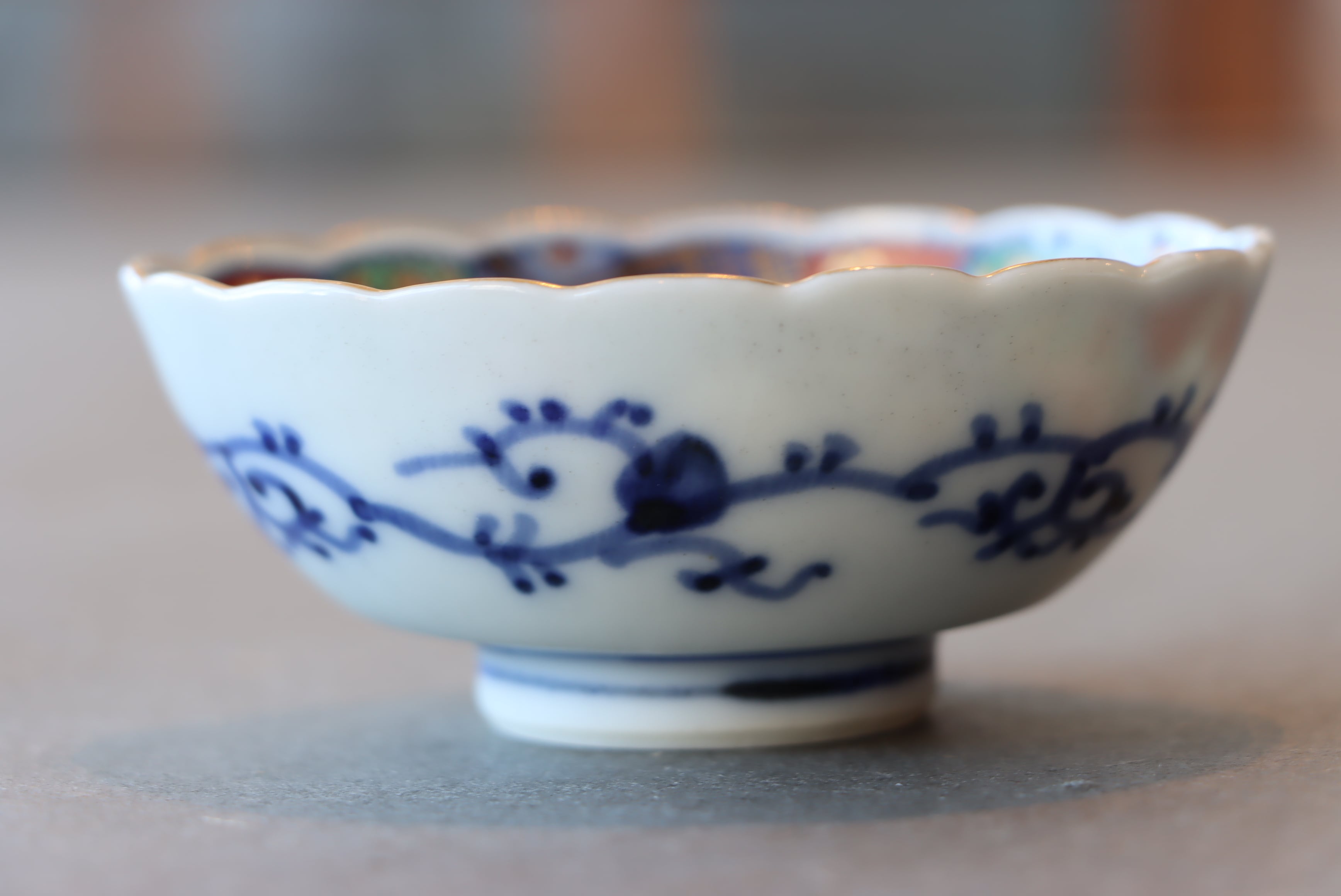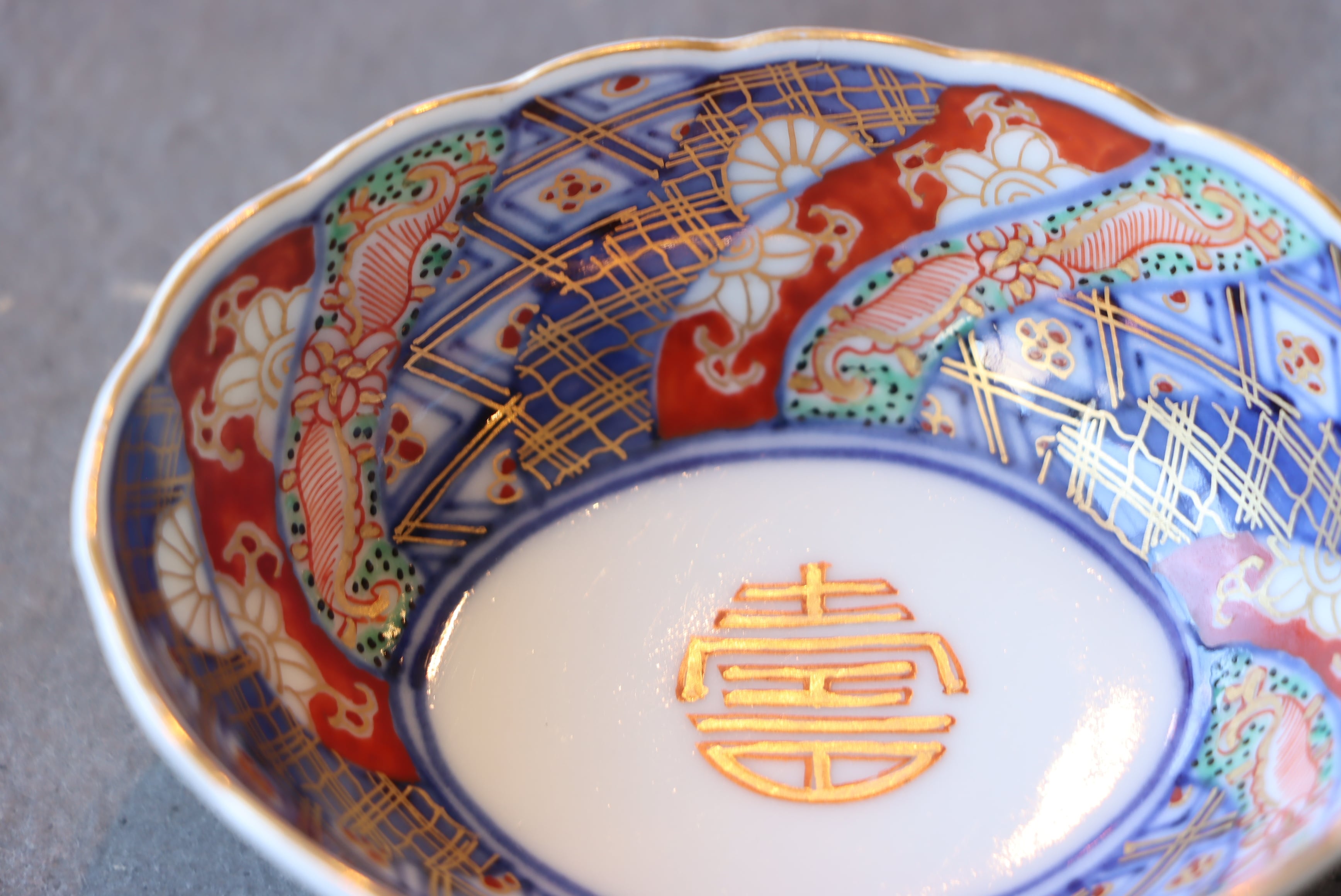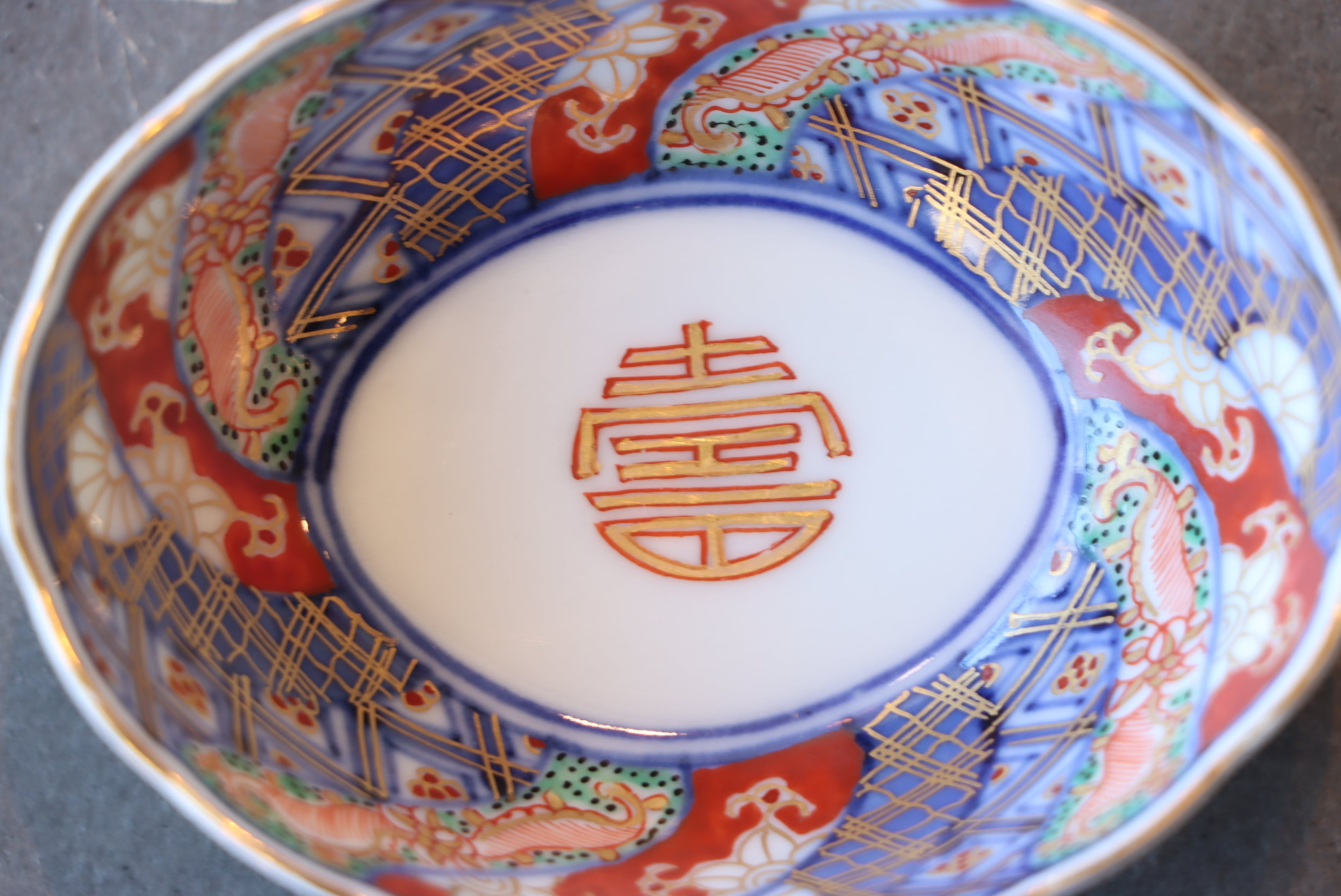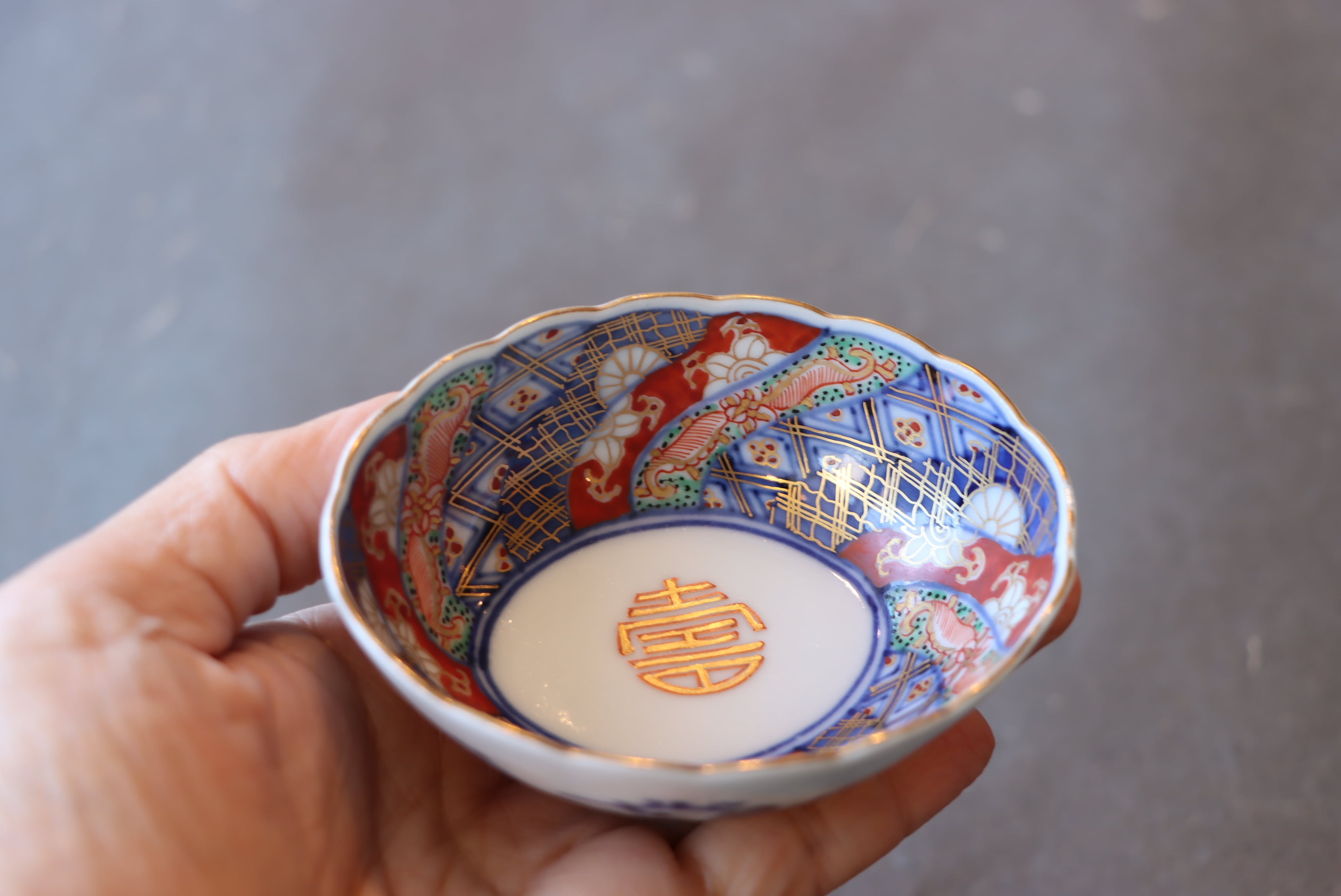 大聖寺伊万里 色絵 捻り壽文 輪花 楕円形 変形豆皿 通りもの/Daisyo-ji Imari oval shaped small plate