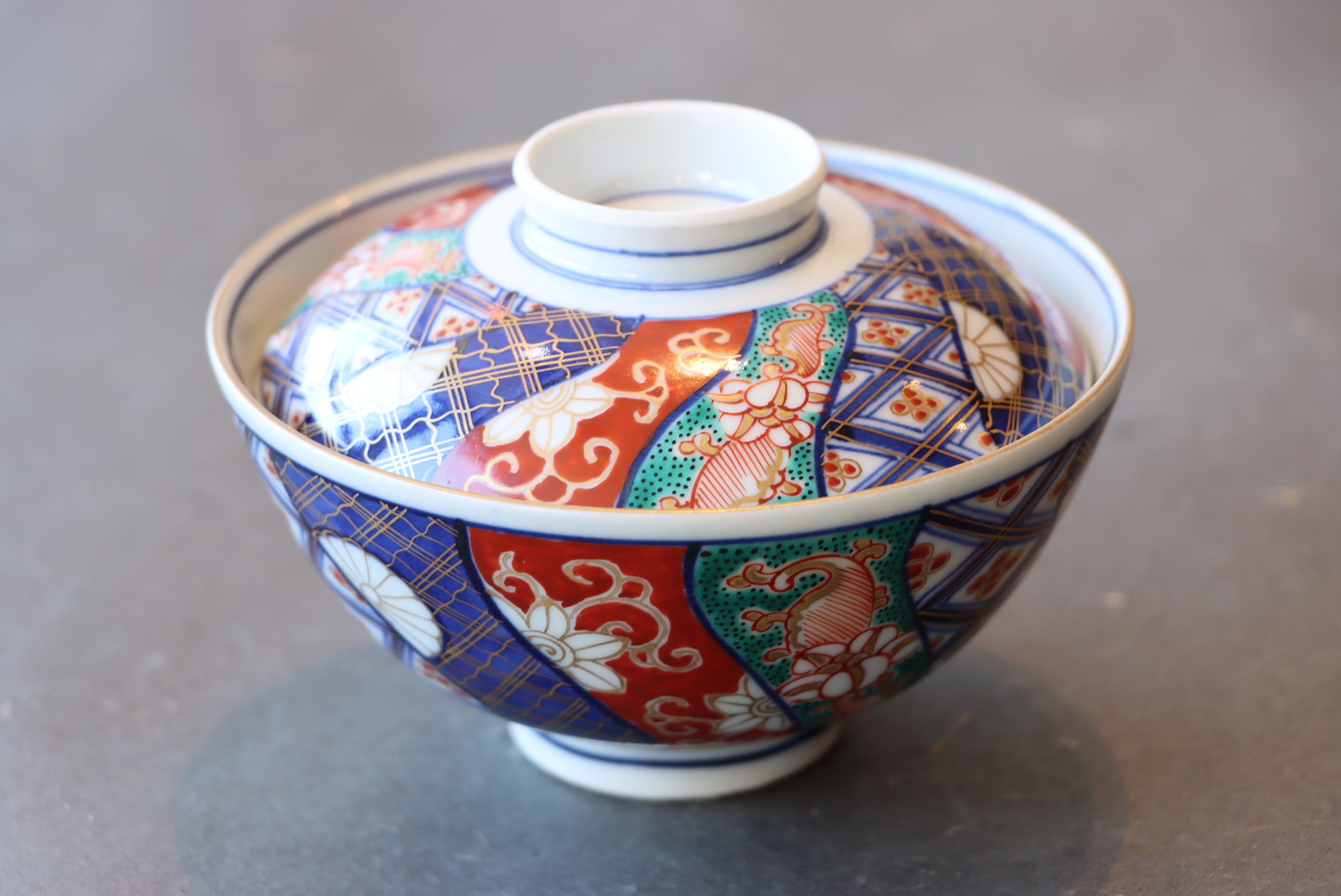 【Daisho-ji Imari covered bowl with twist pattern in overglaze enamels.】