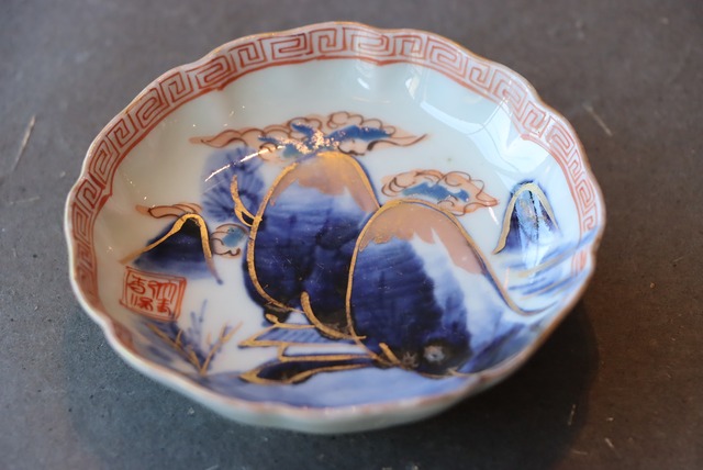 伊万里焼 色絵 楼閣山水文 輪花 豆皿/Imari small plate
