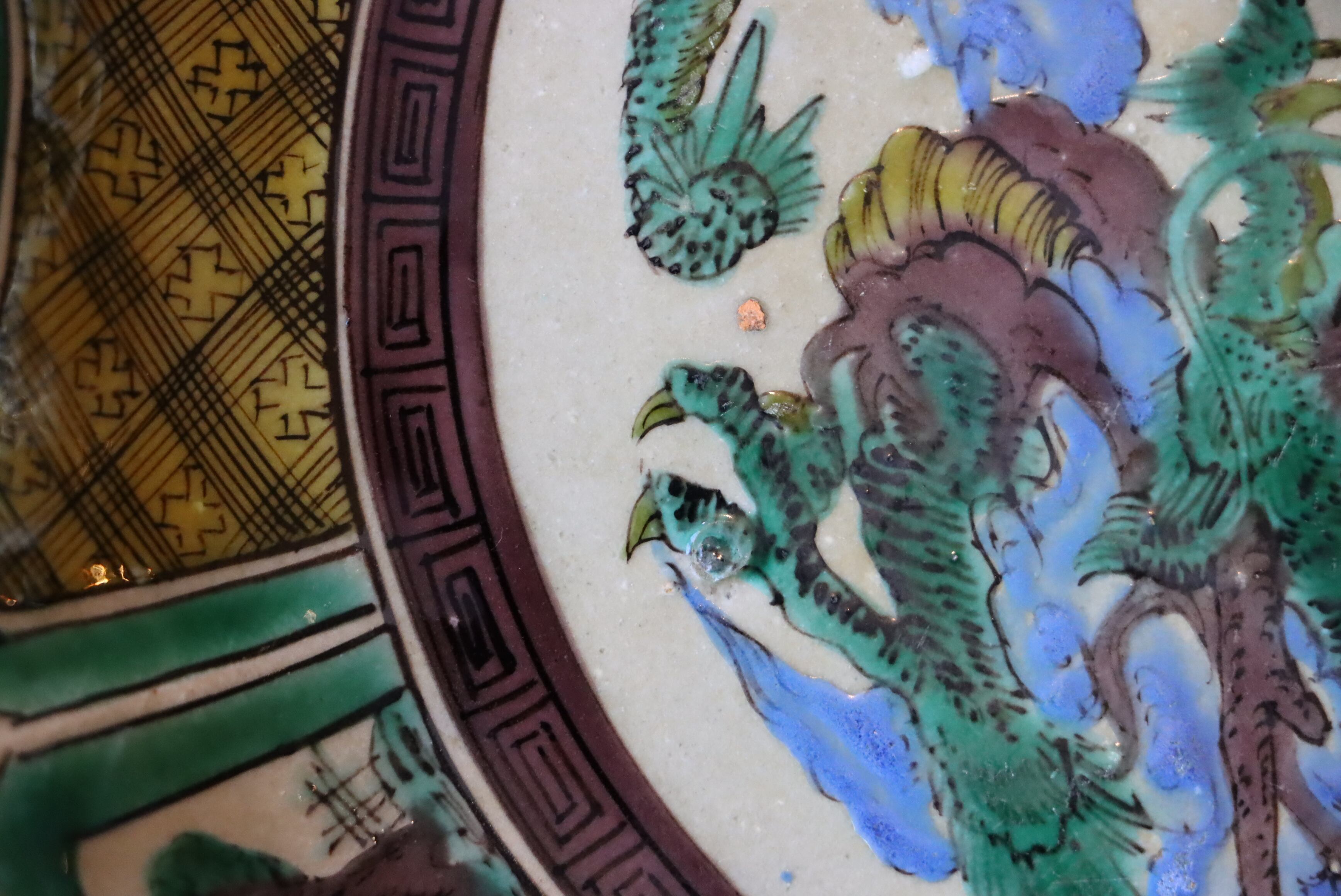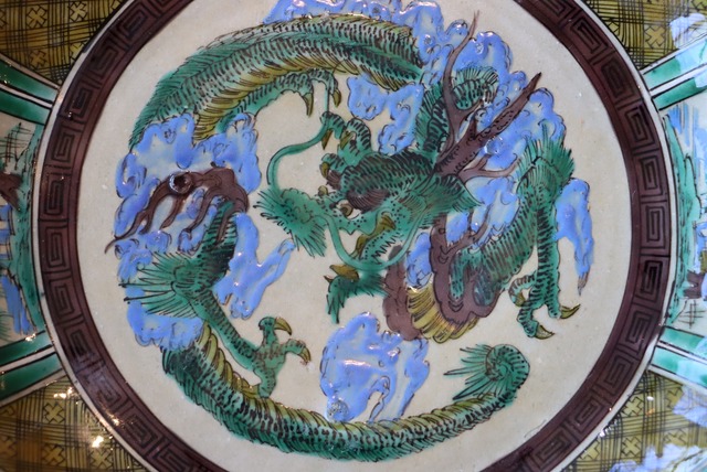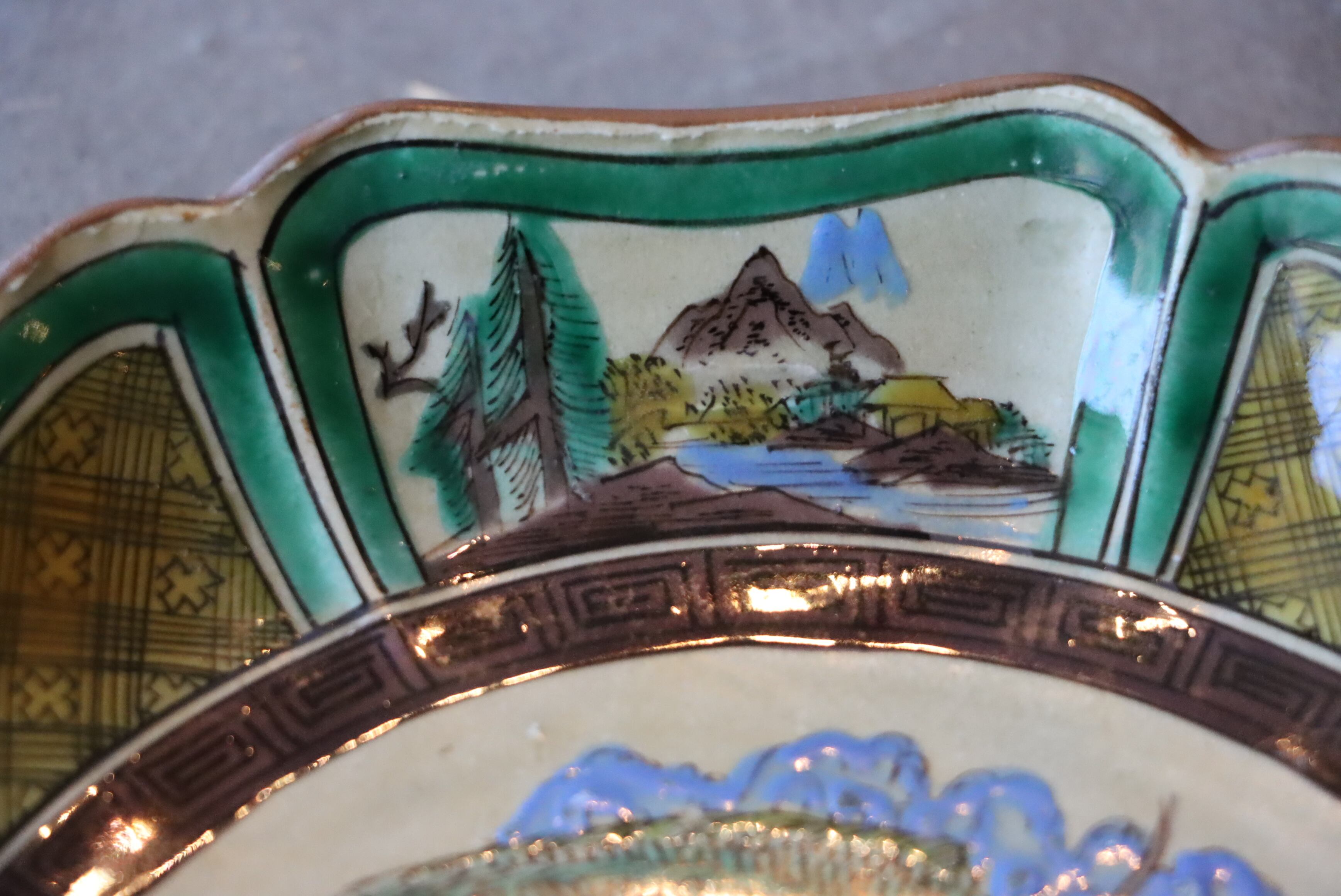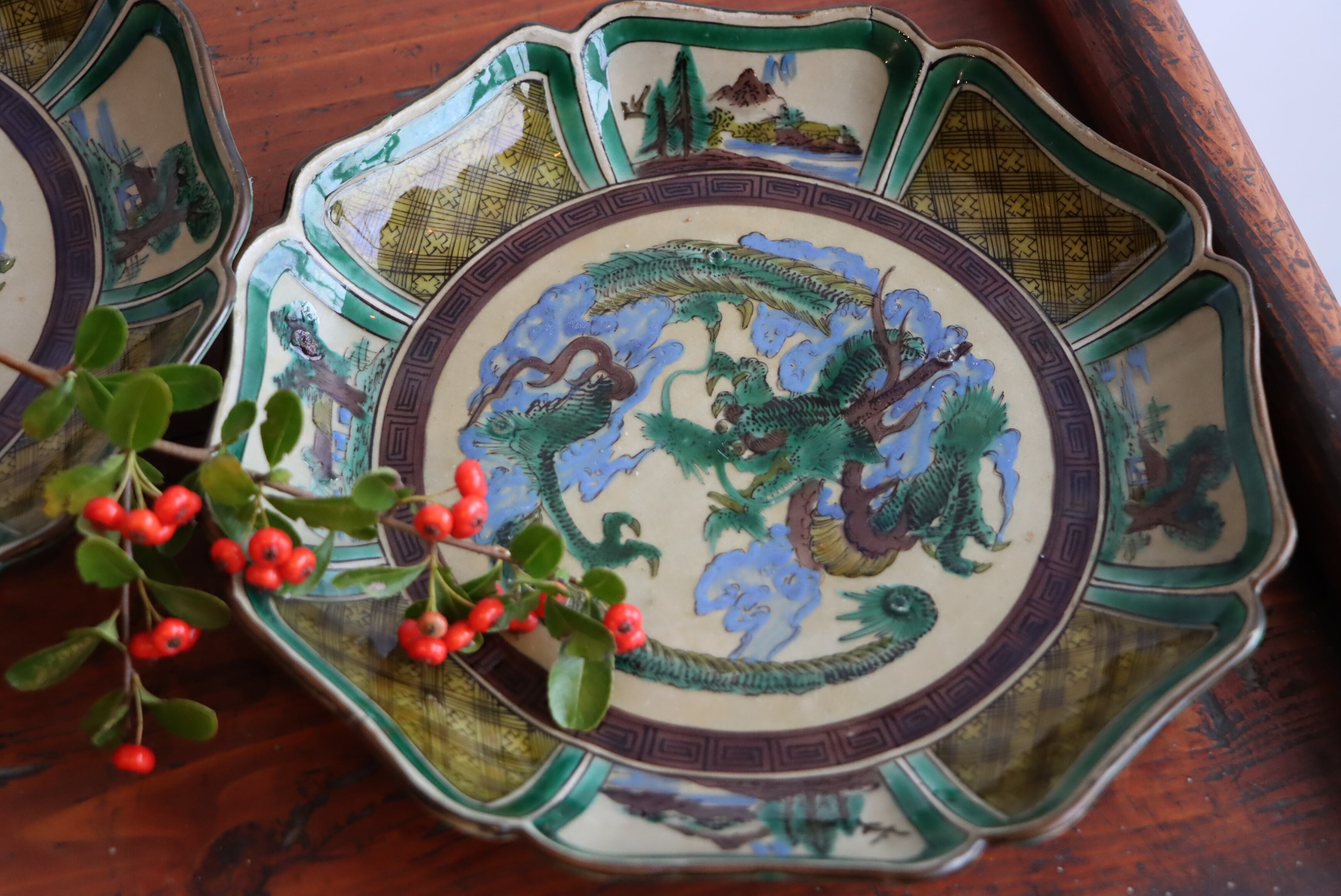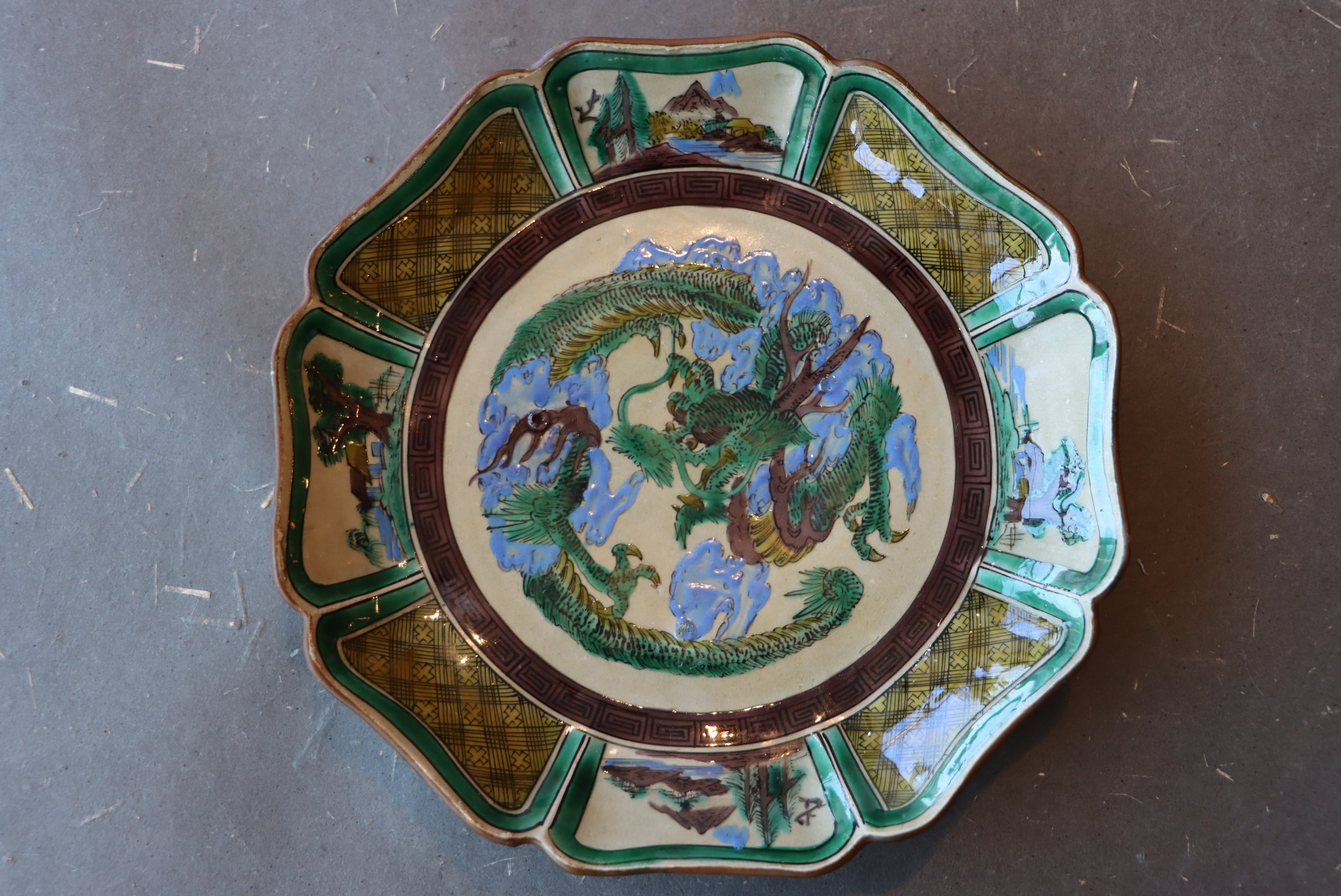 【Kutani medium size plate with dragon and landscape design in overgalze enamels.】