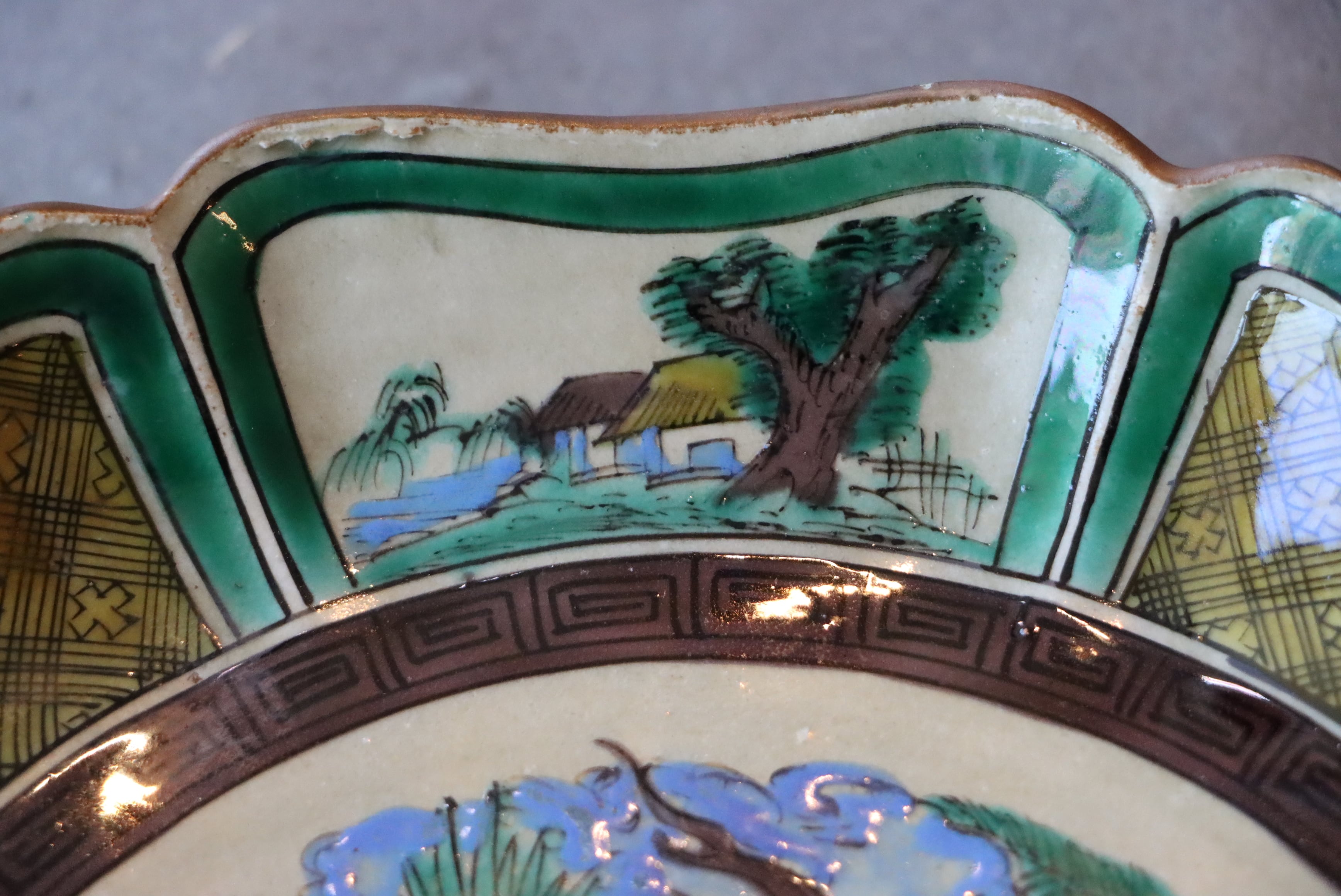 青九谷 龍楼閣山水文 輪花 中皿 七寸/Kutani medium size plate