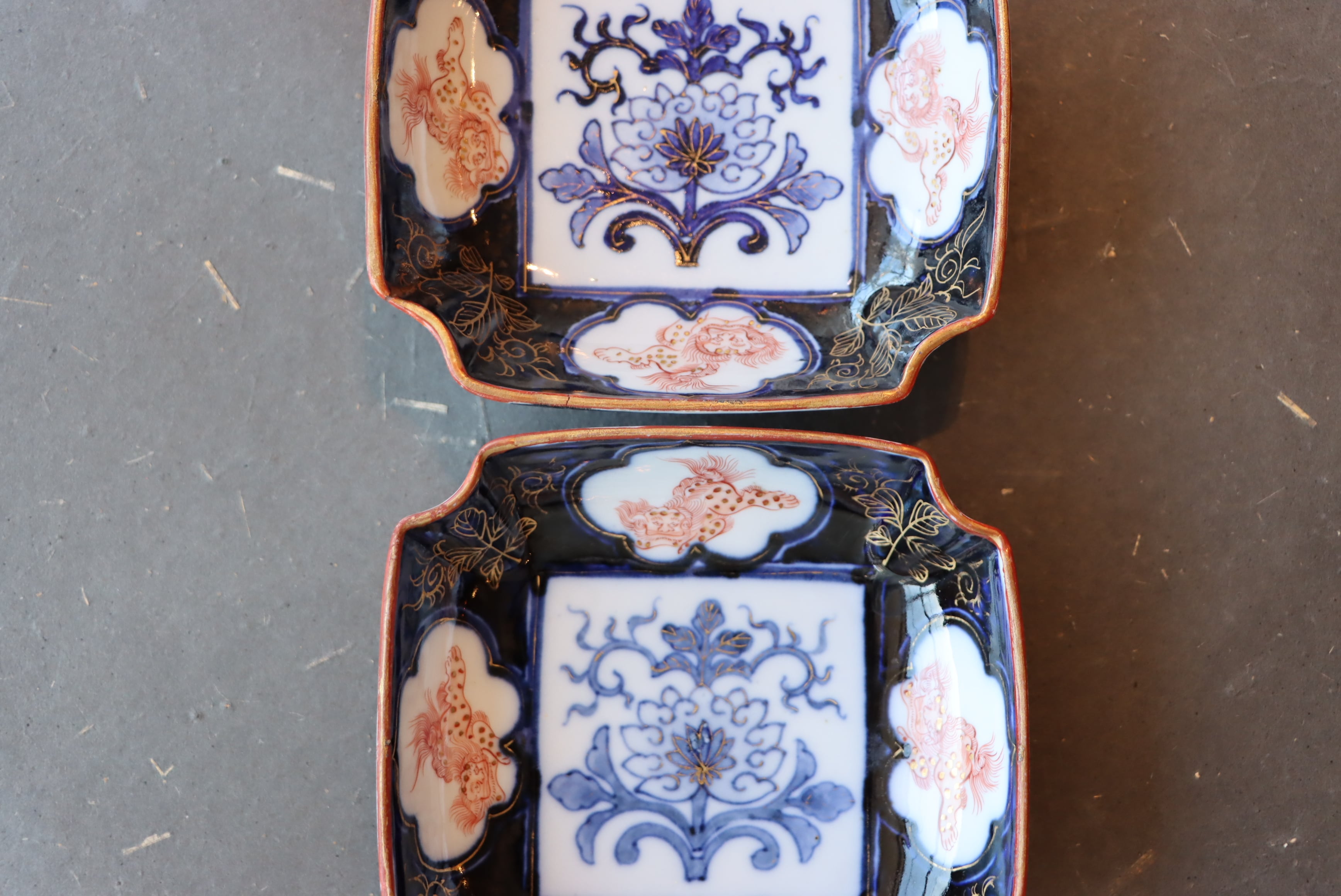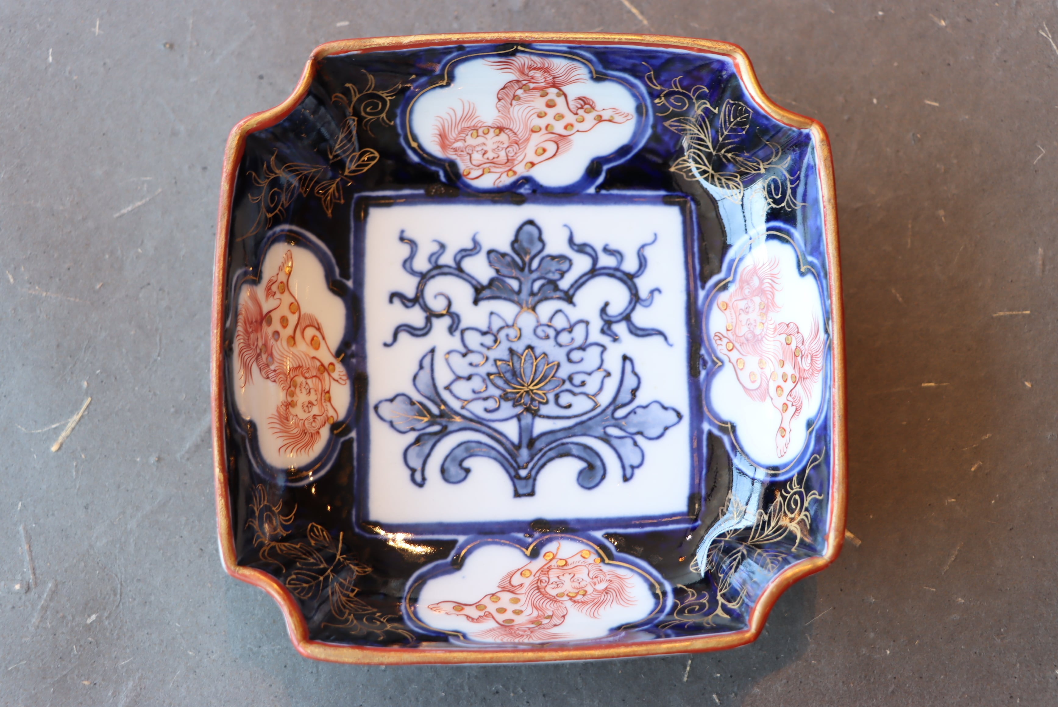 伊万里焼 色絵 花獅子文 隅切 平向付/Imari plate