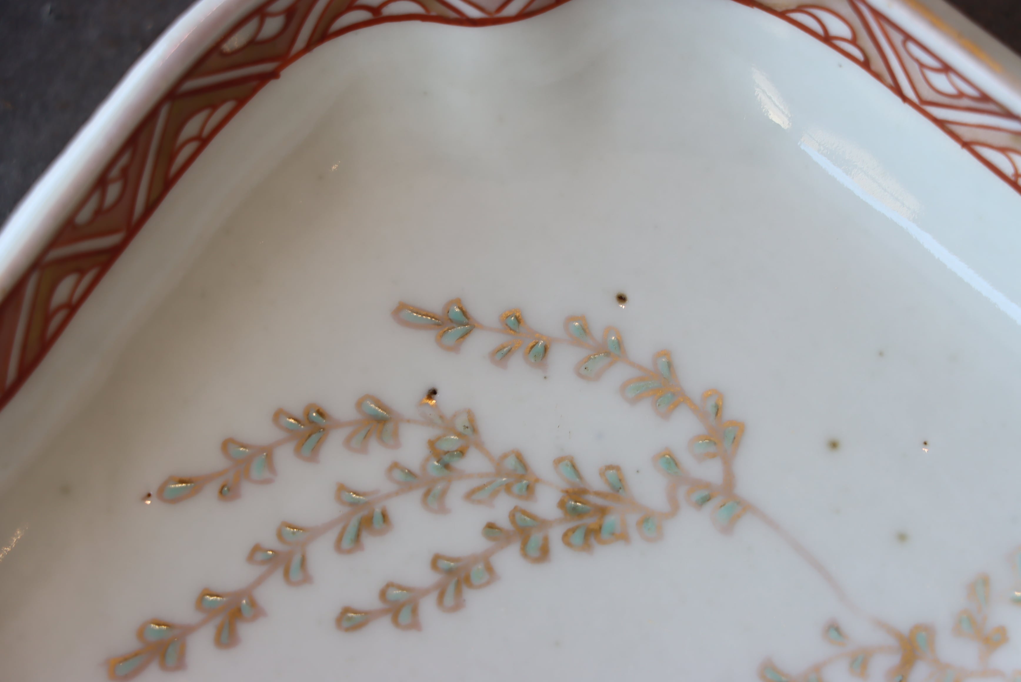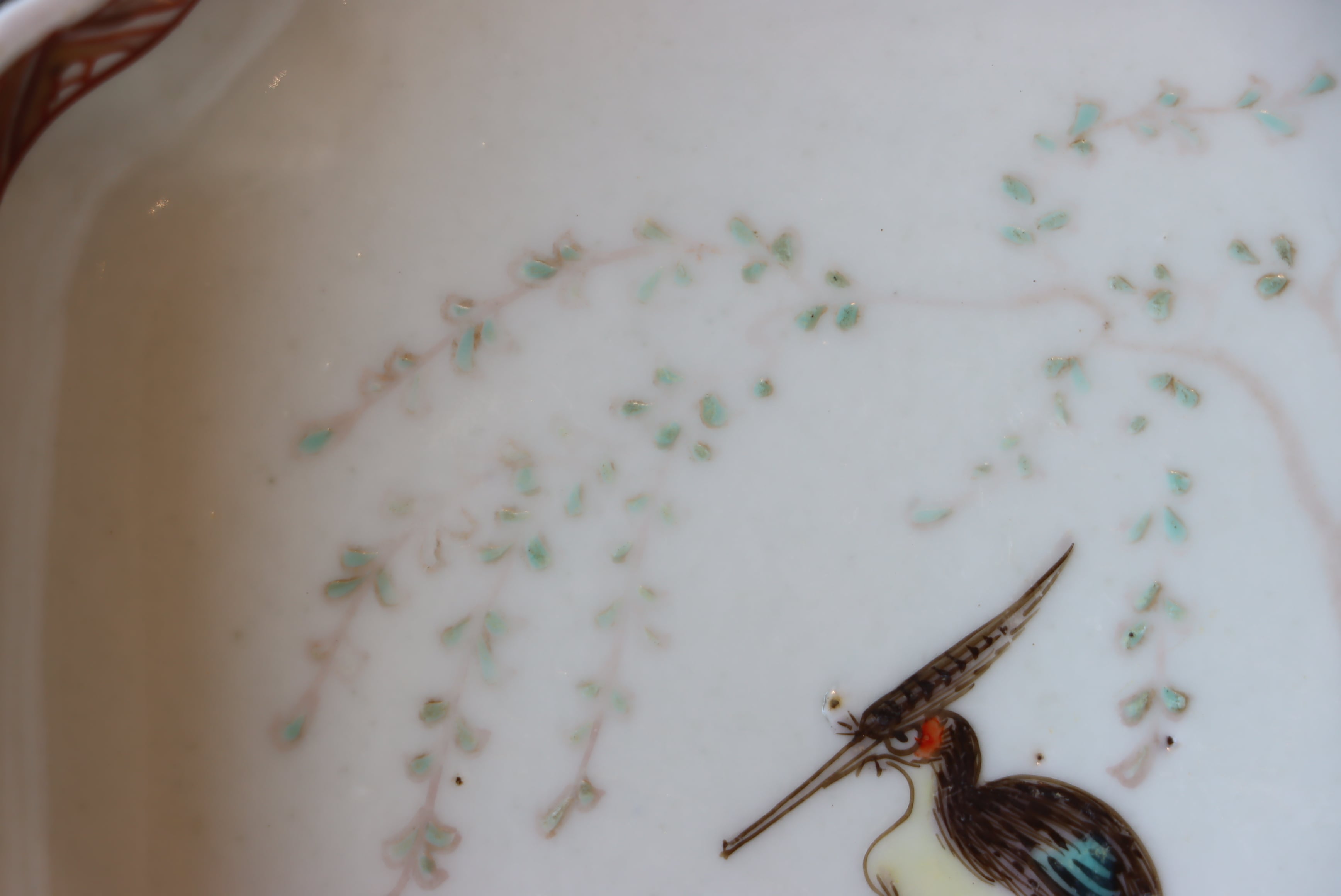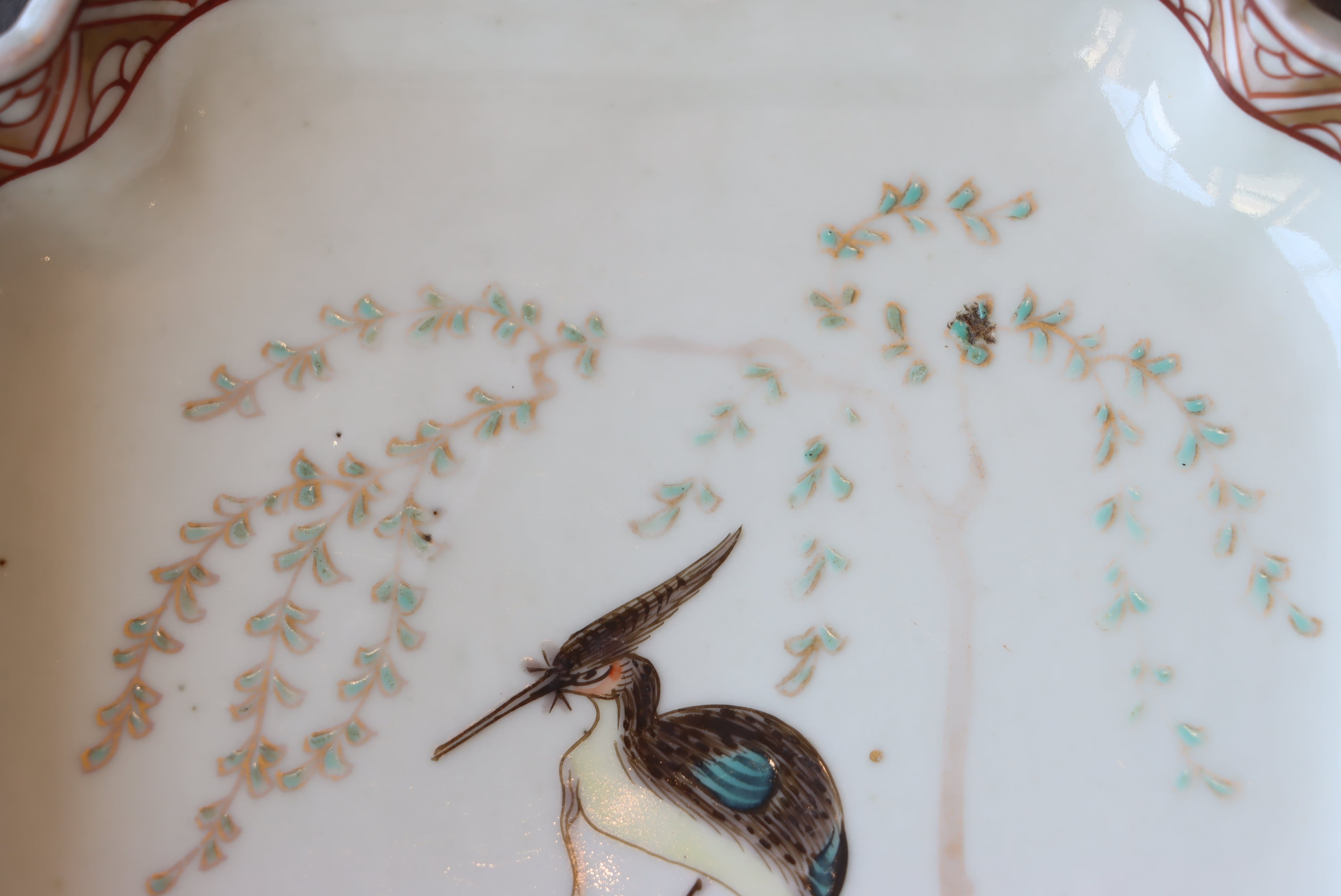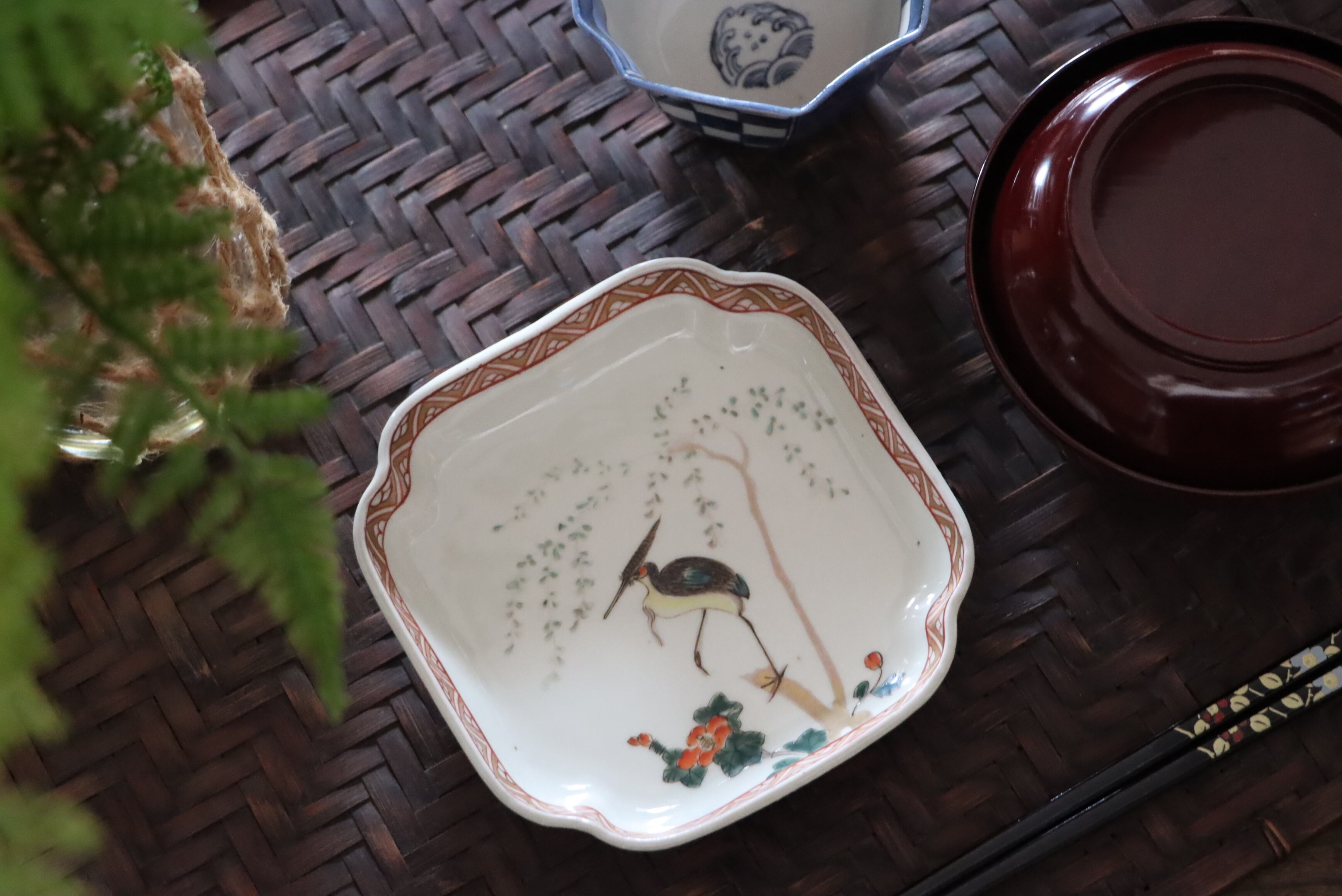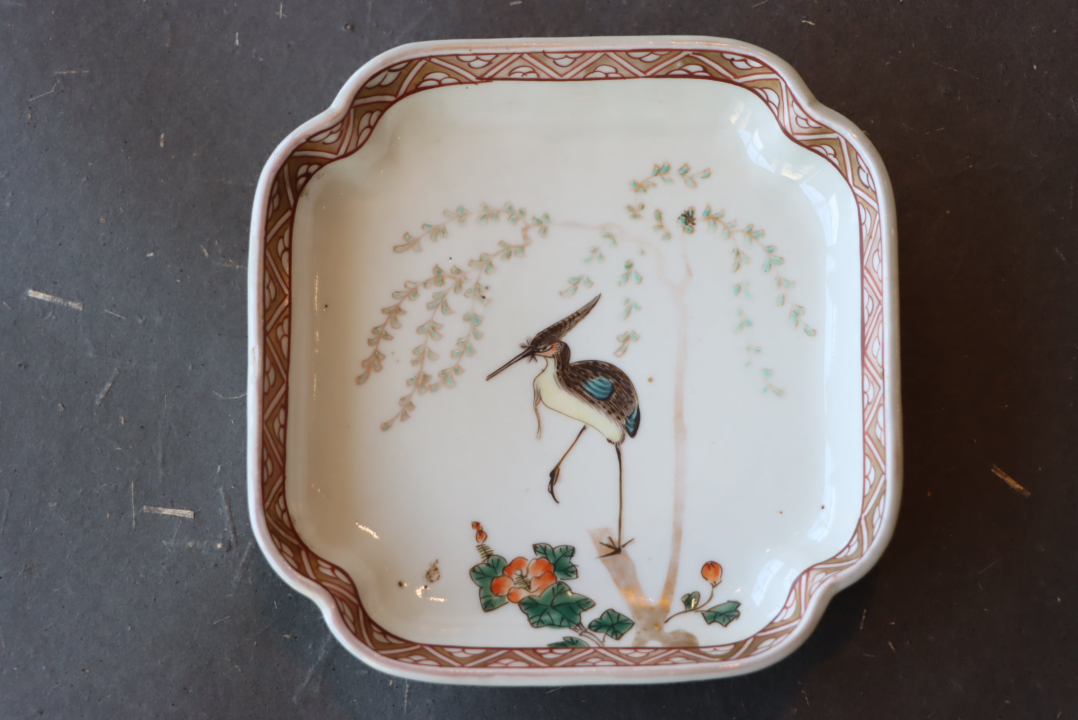 【Square shaped plate with willow and heron design in overglaze enamels.】
