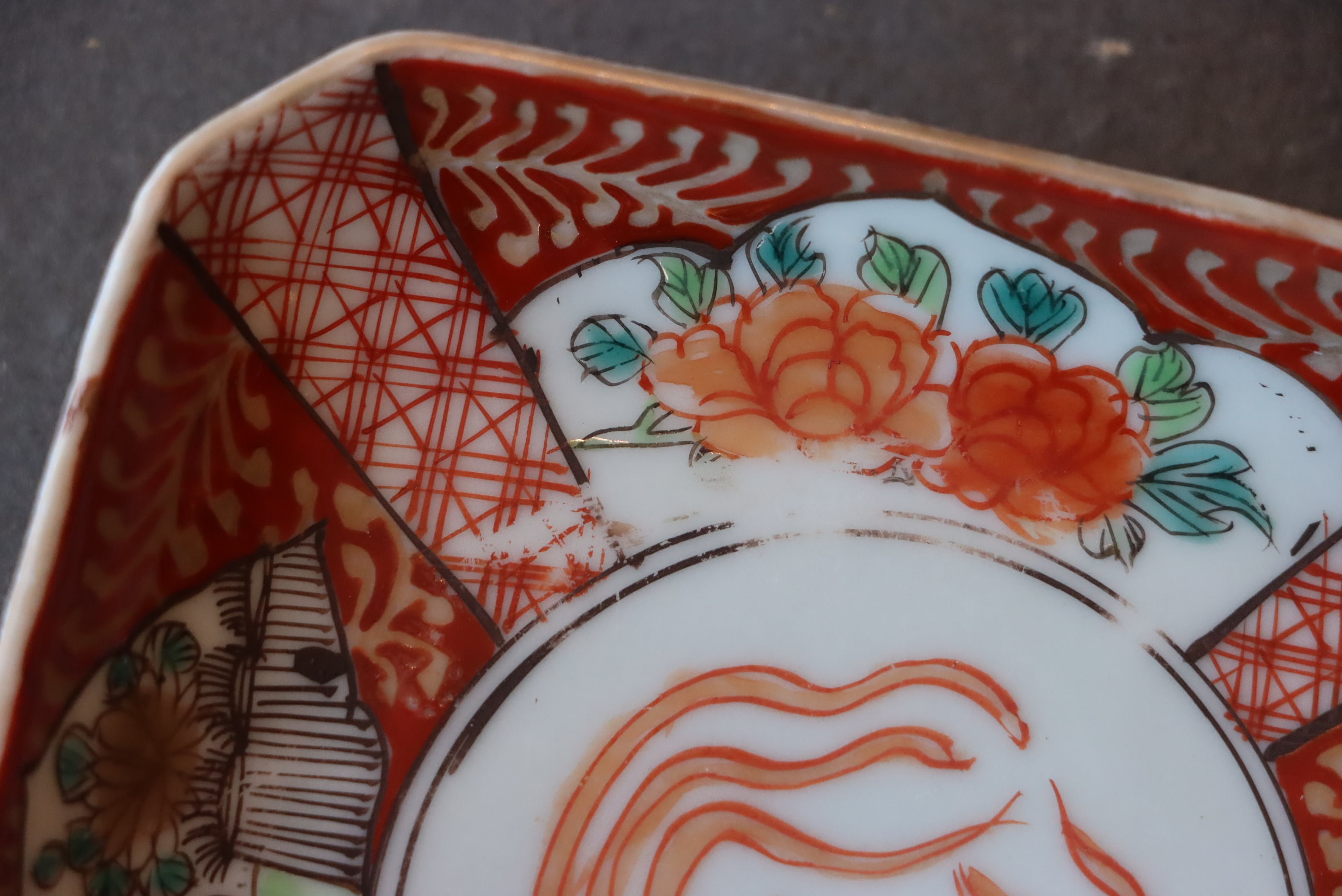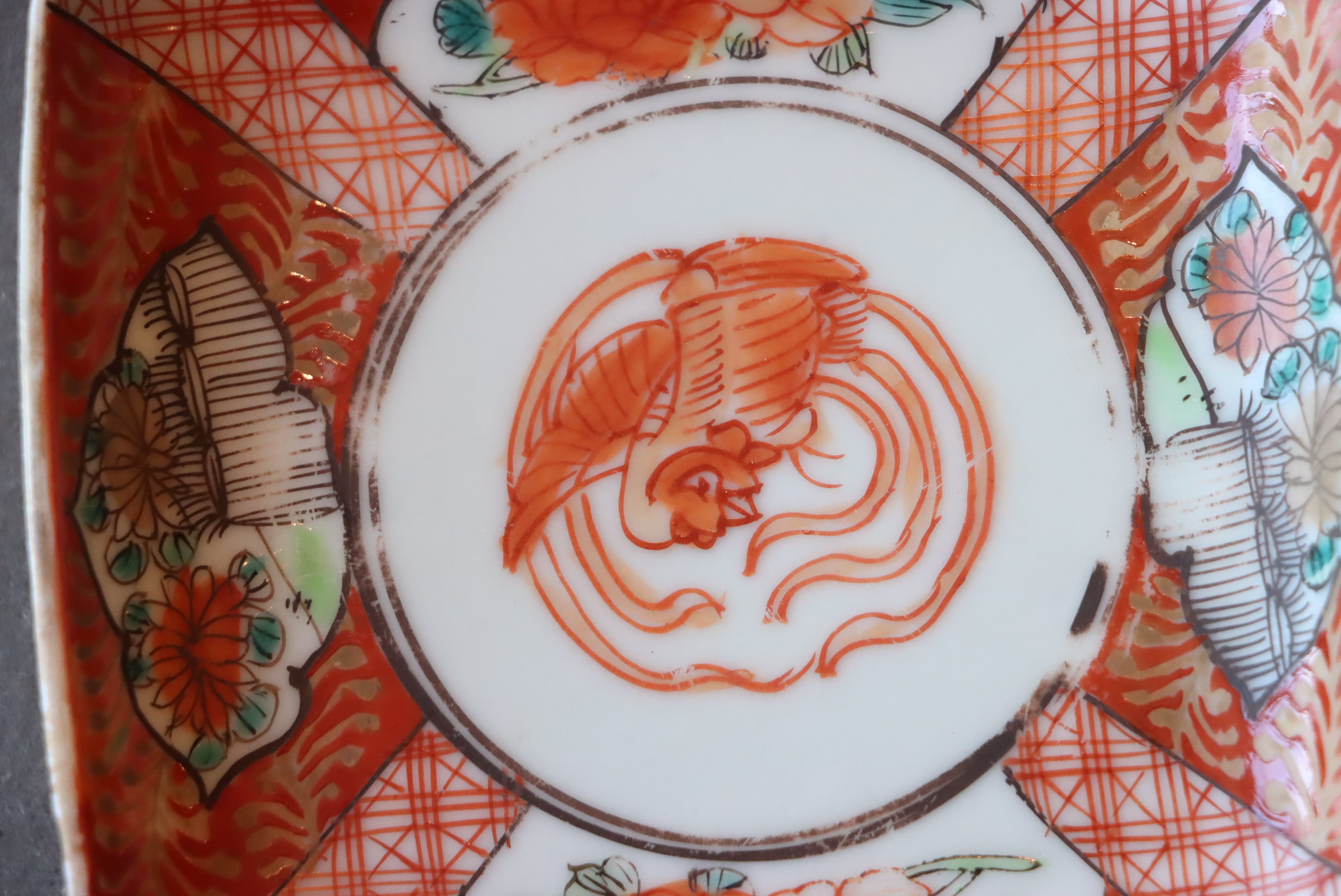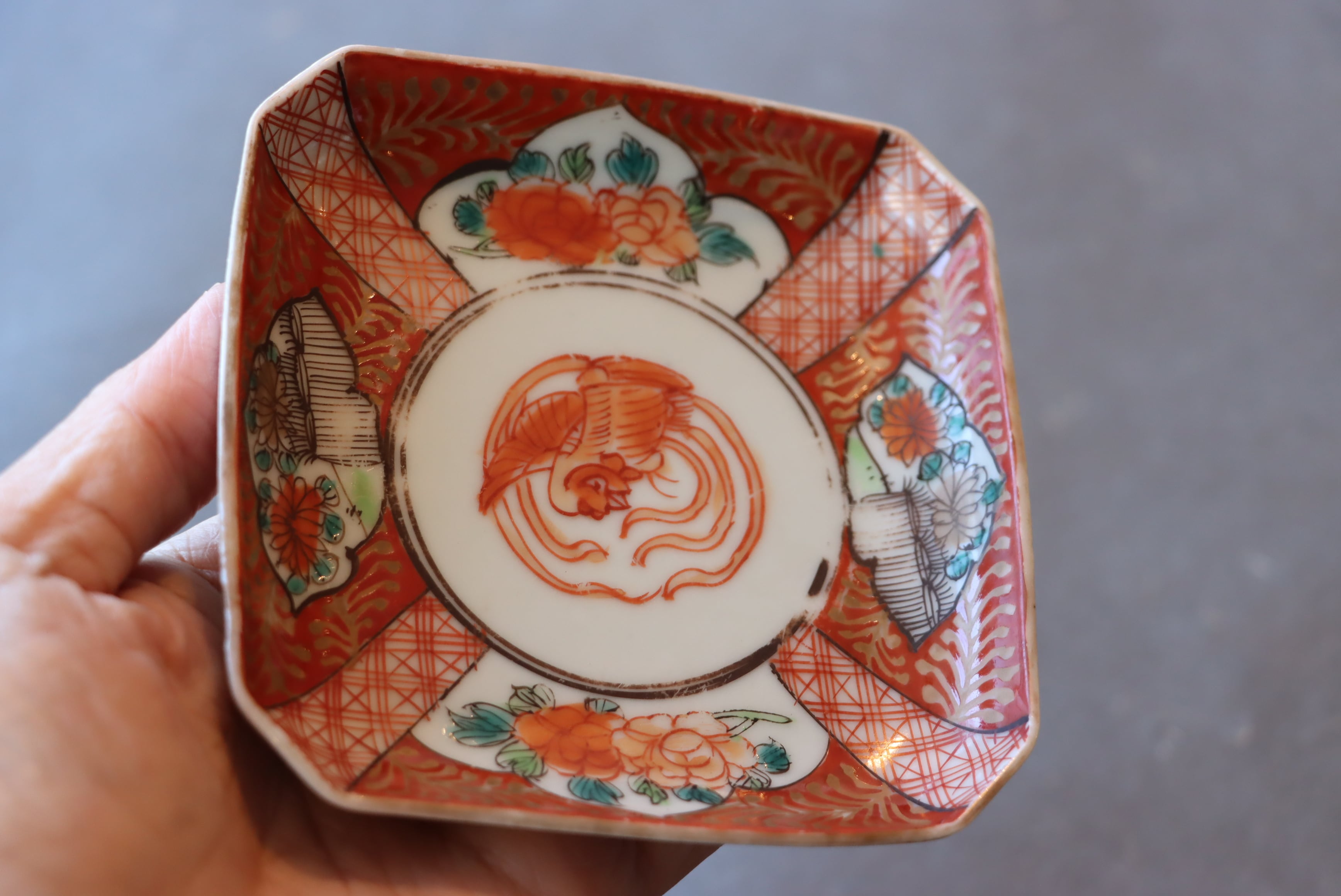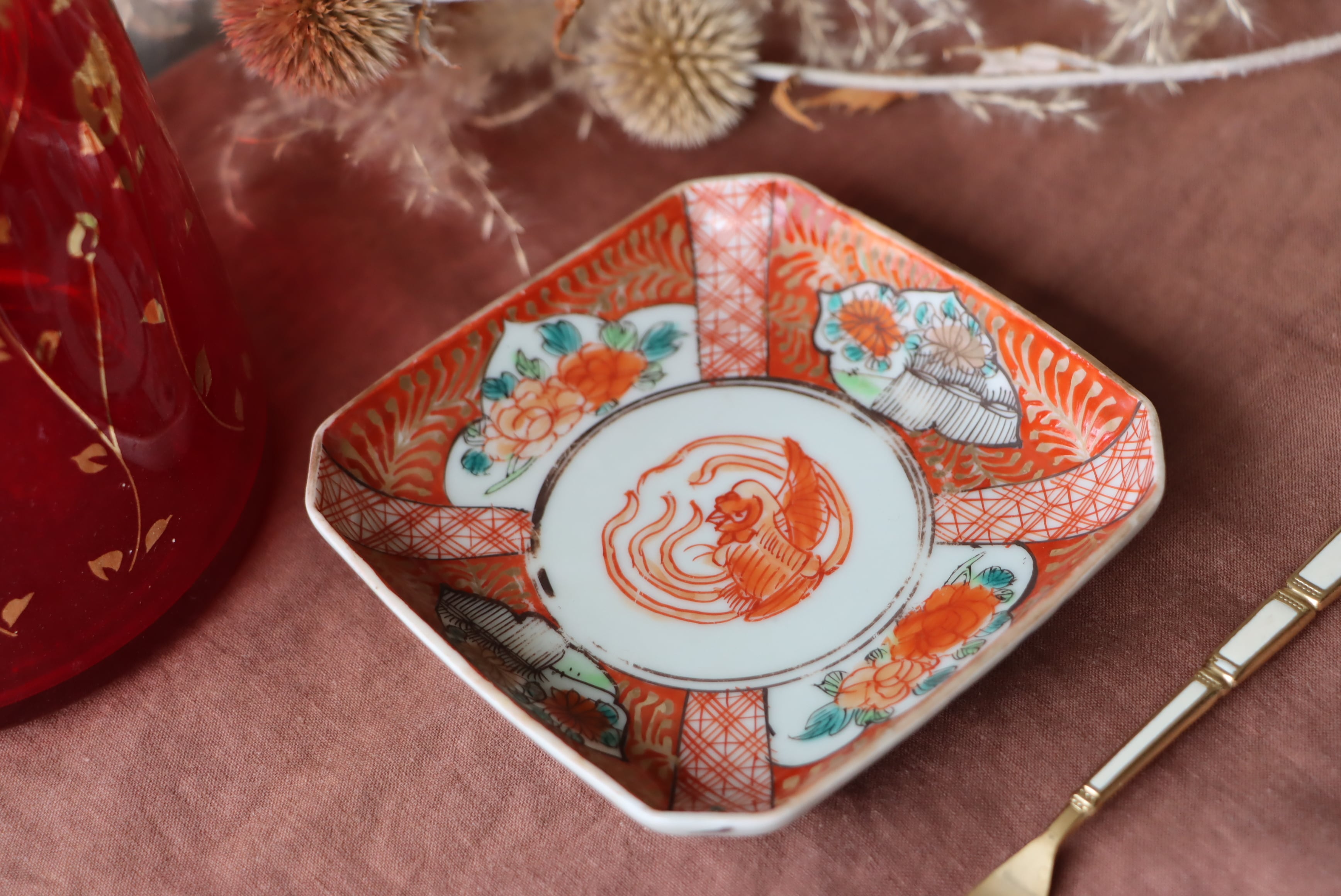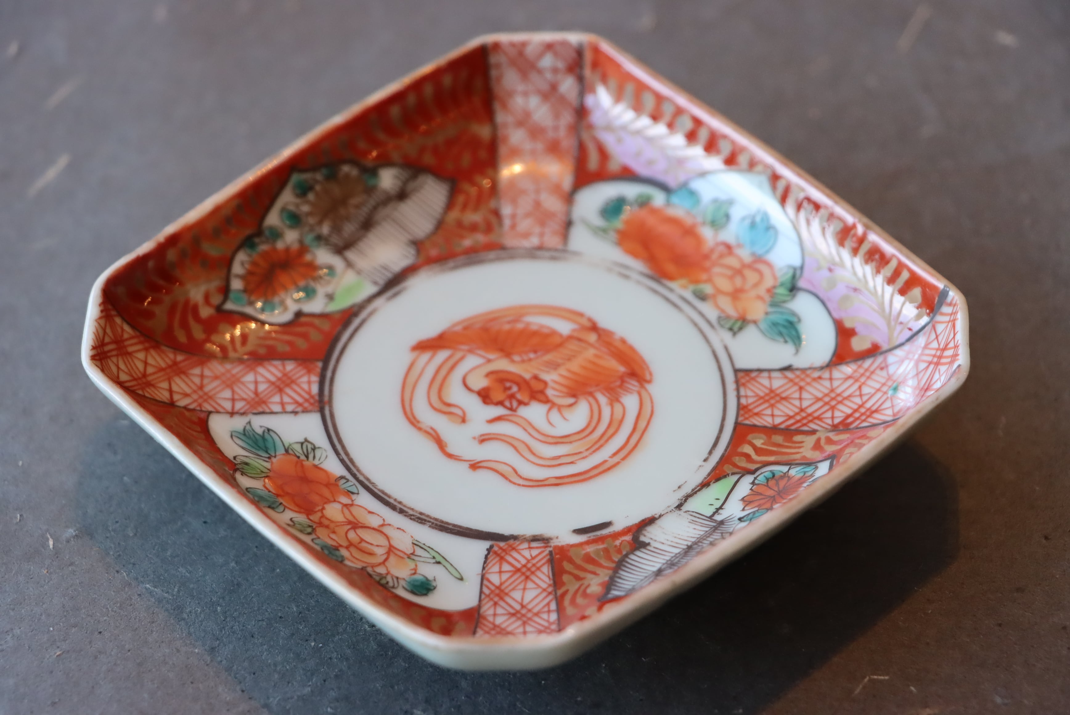 【Imari square shaped small plate with flower and phoenix design in overglaze enamels.】