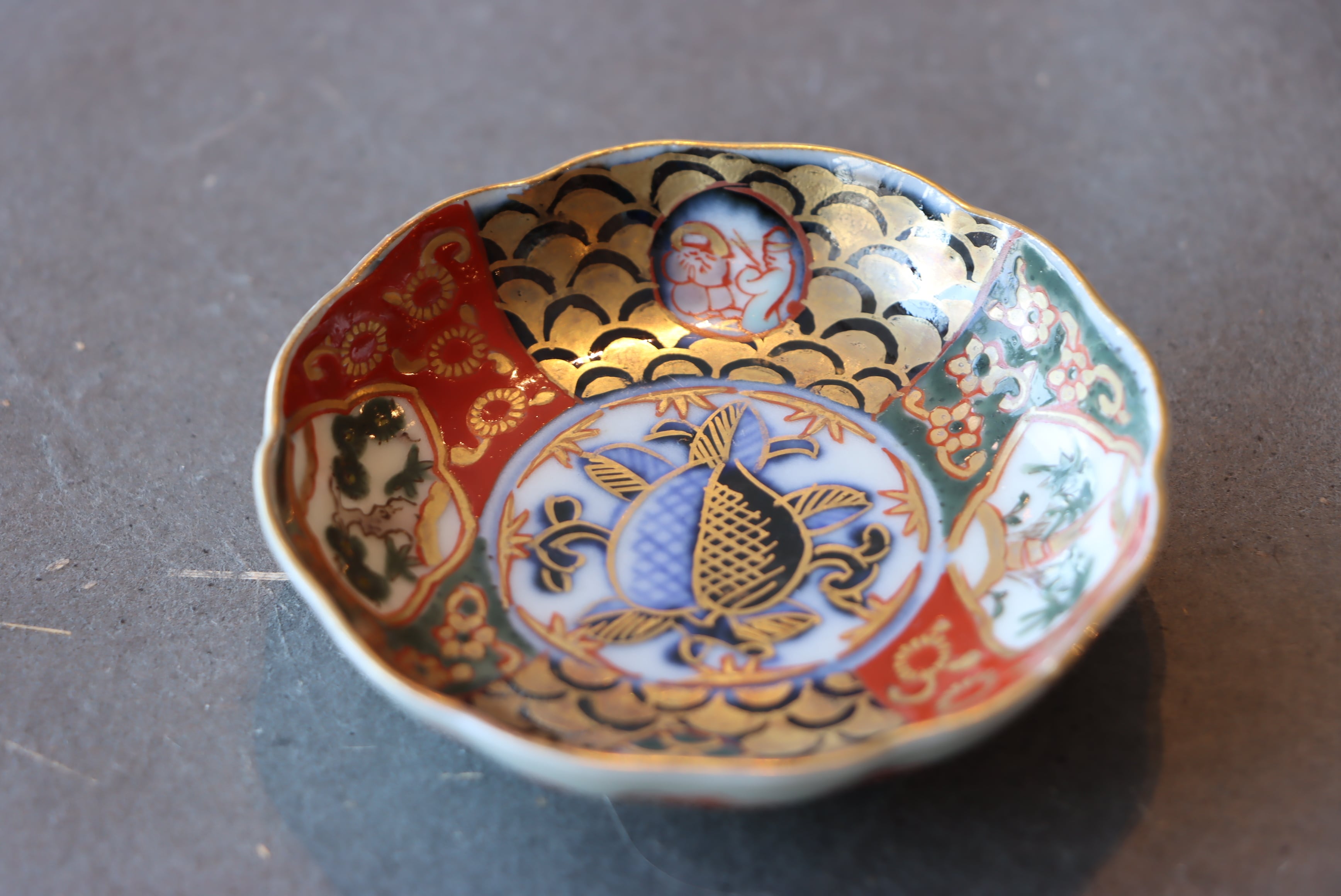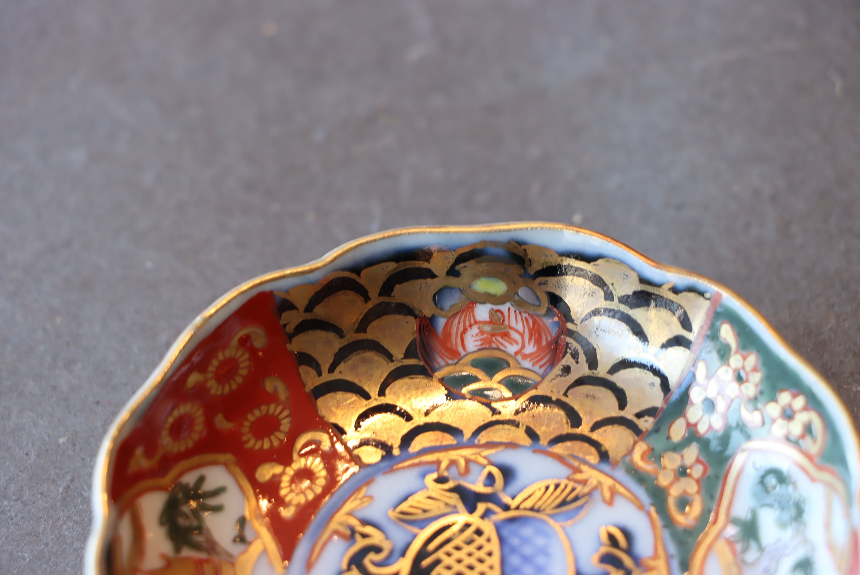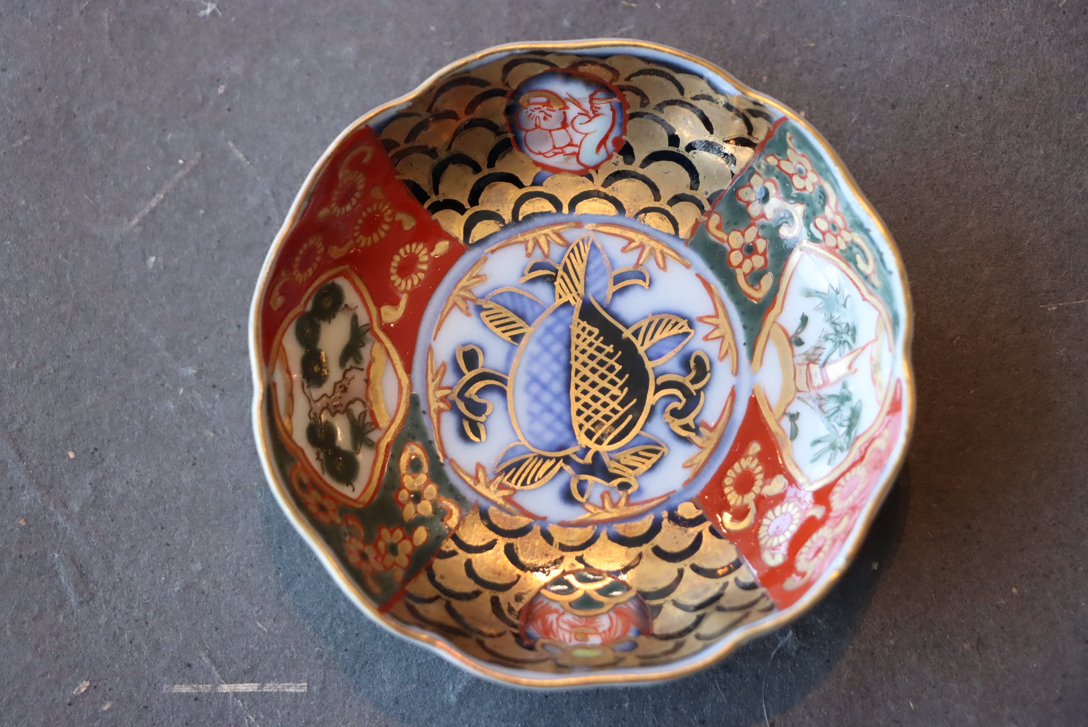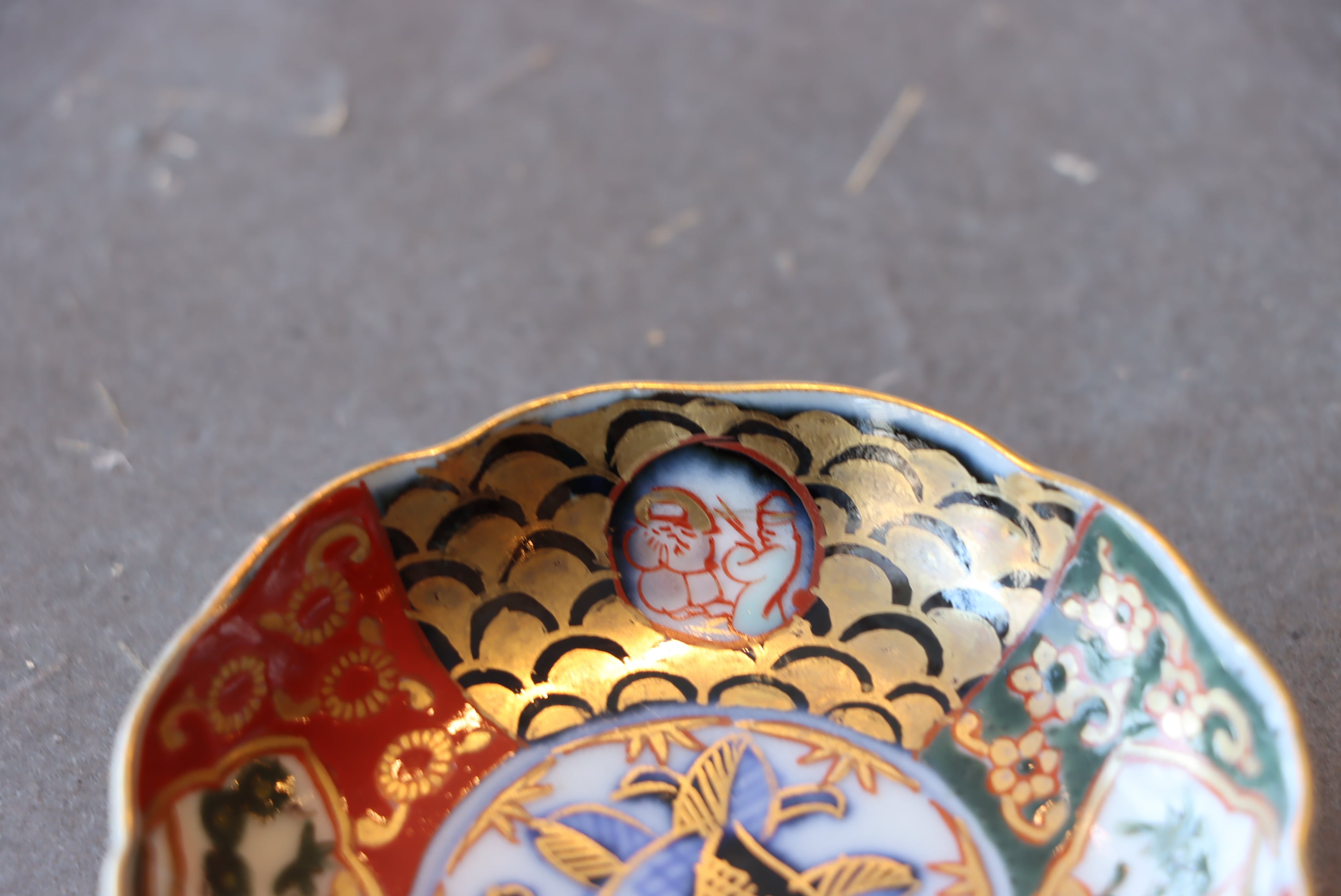 【Imari small plate less than 10 cm with venerable old man, crane and turtle design in overglaze enamels.】
