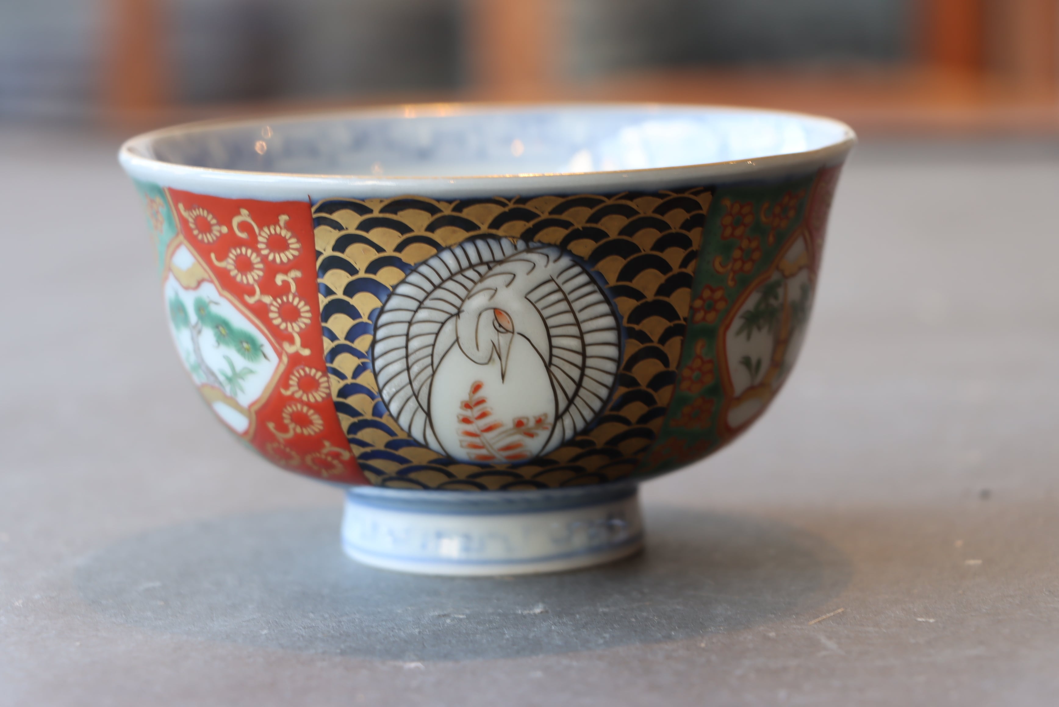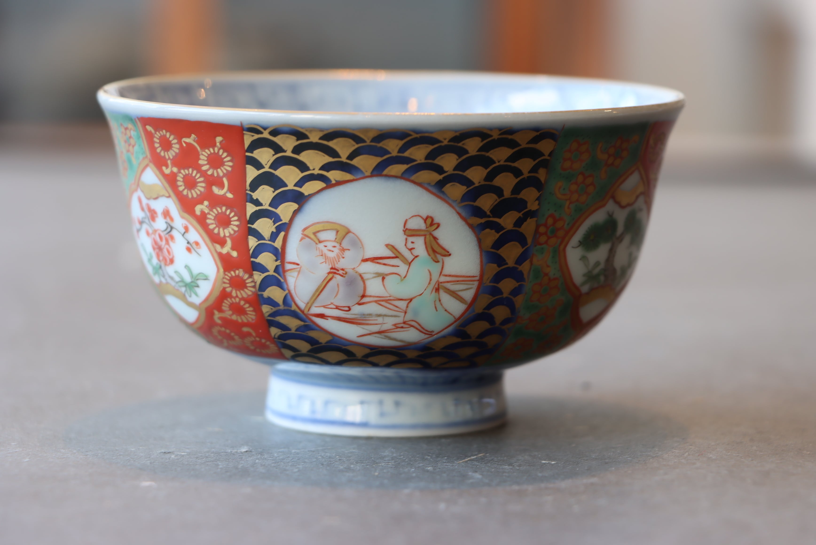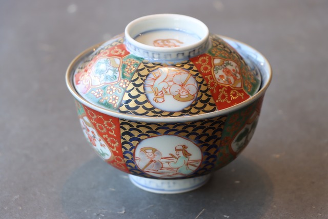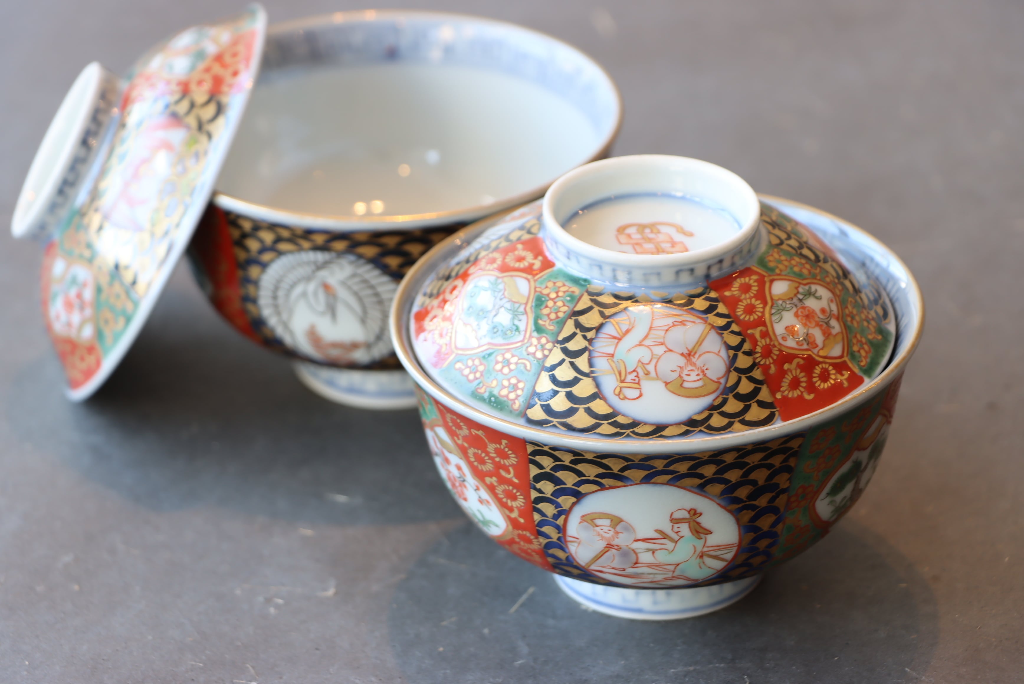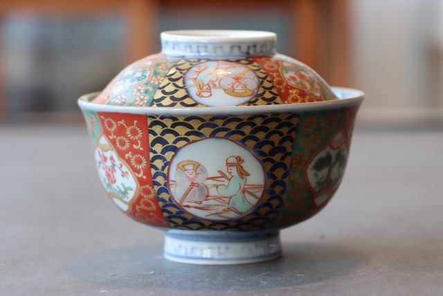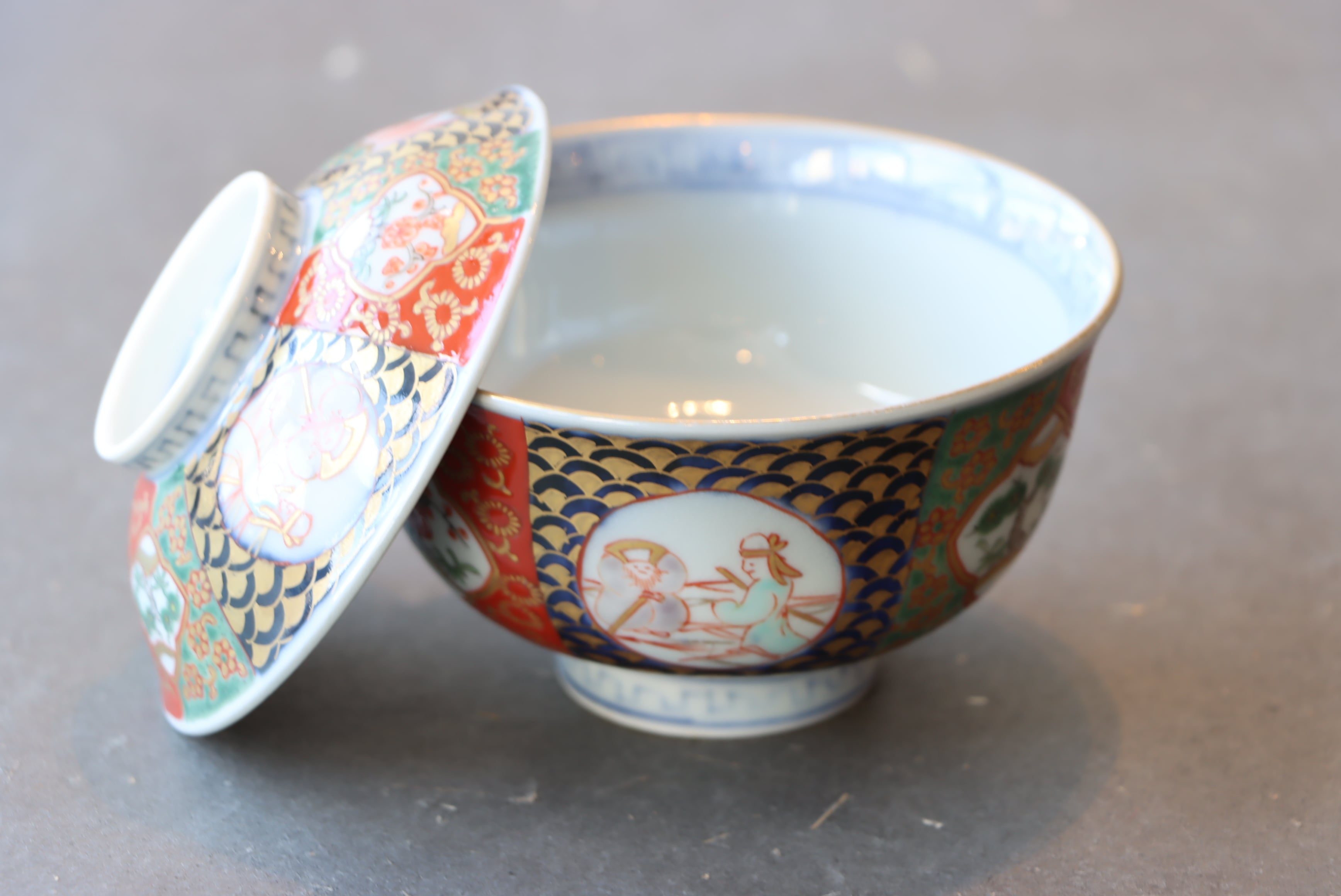 【Imari covered bowl with venerable old man, crane and turtle design in overglaze enamels.】