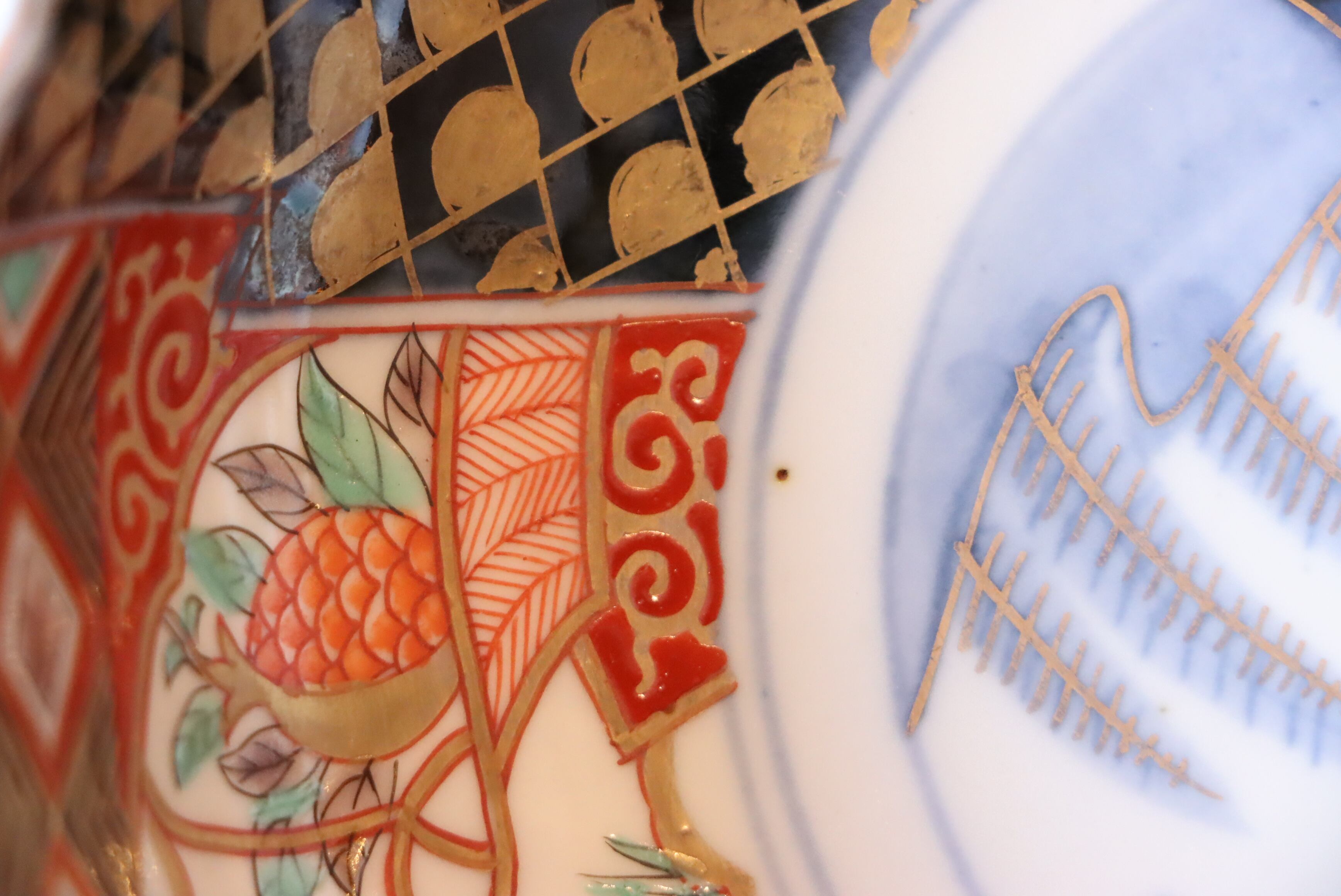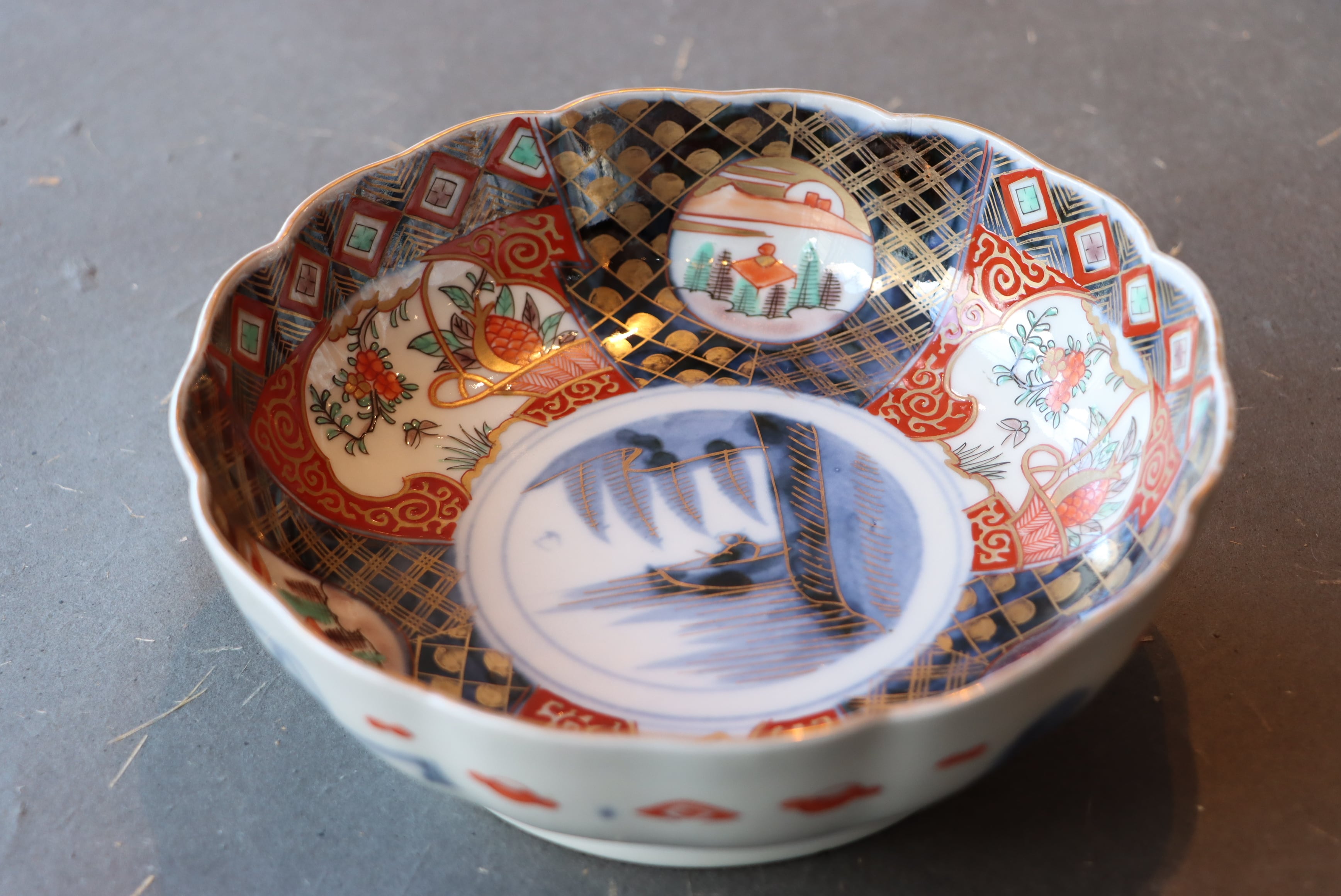 【Imari "Namasu" bowl with figure riding on the boat and pomegranate design in overglaze enamels.】
