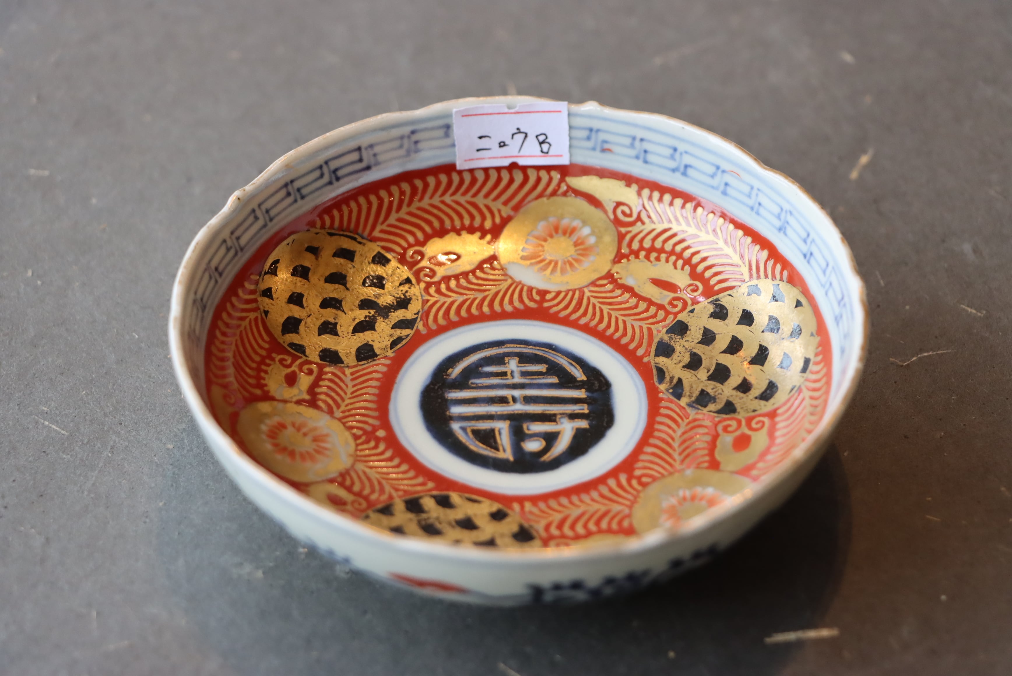 ニュウ 伊万里焼 色絵 花青海波壽文 小皿 B アウトレット