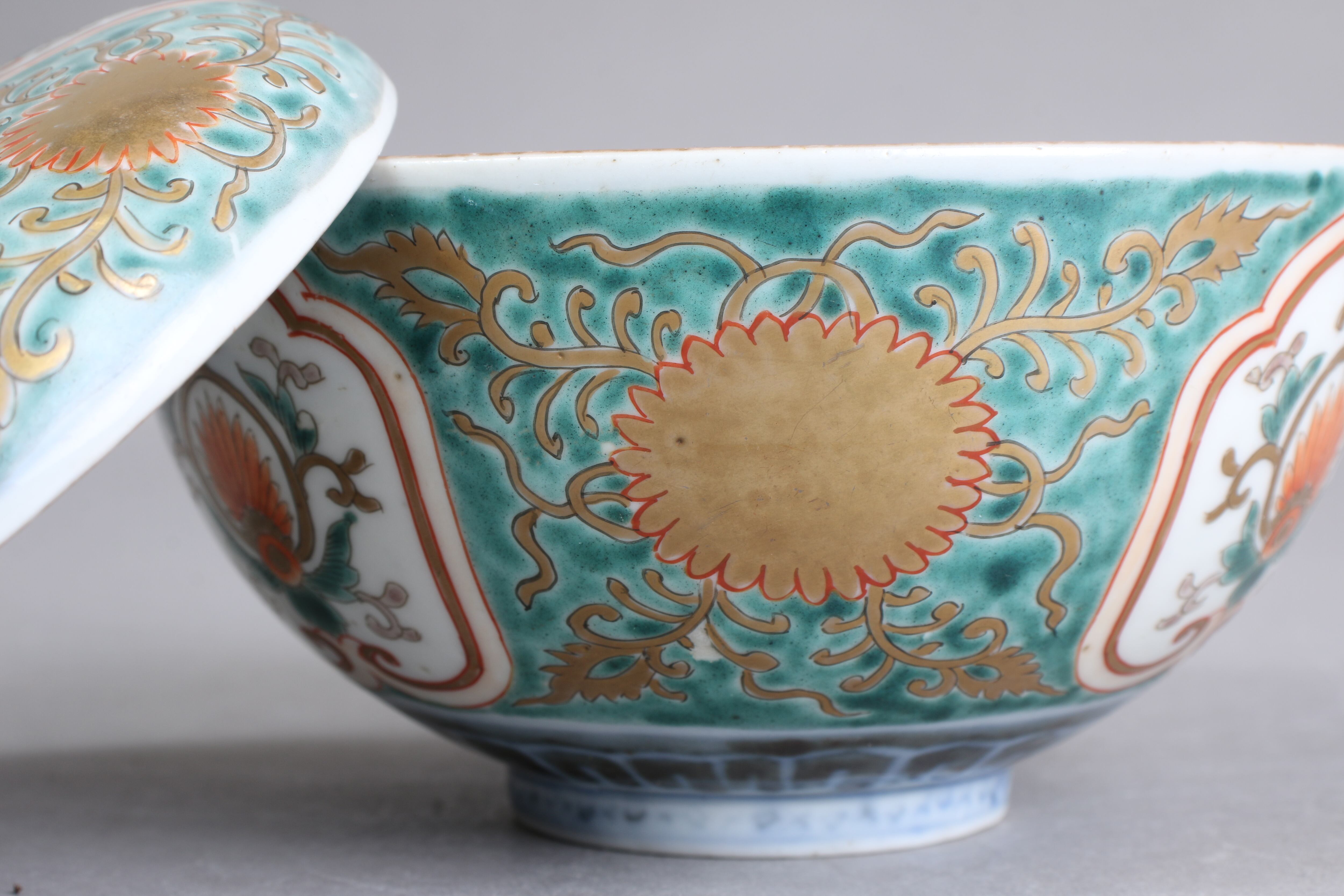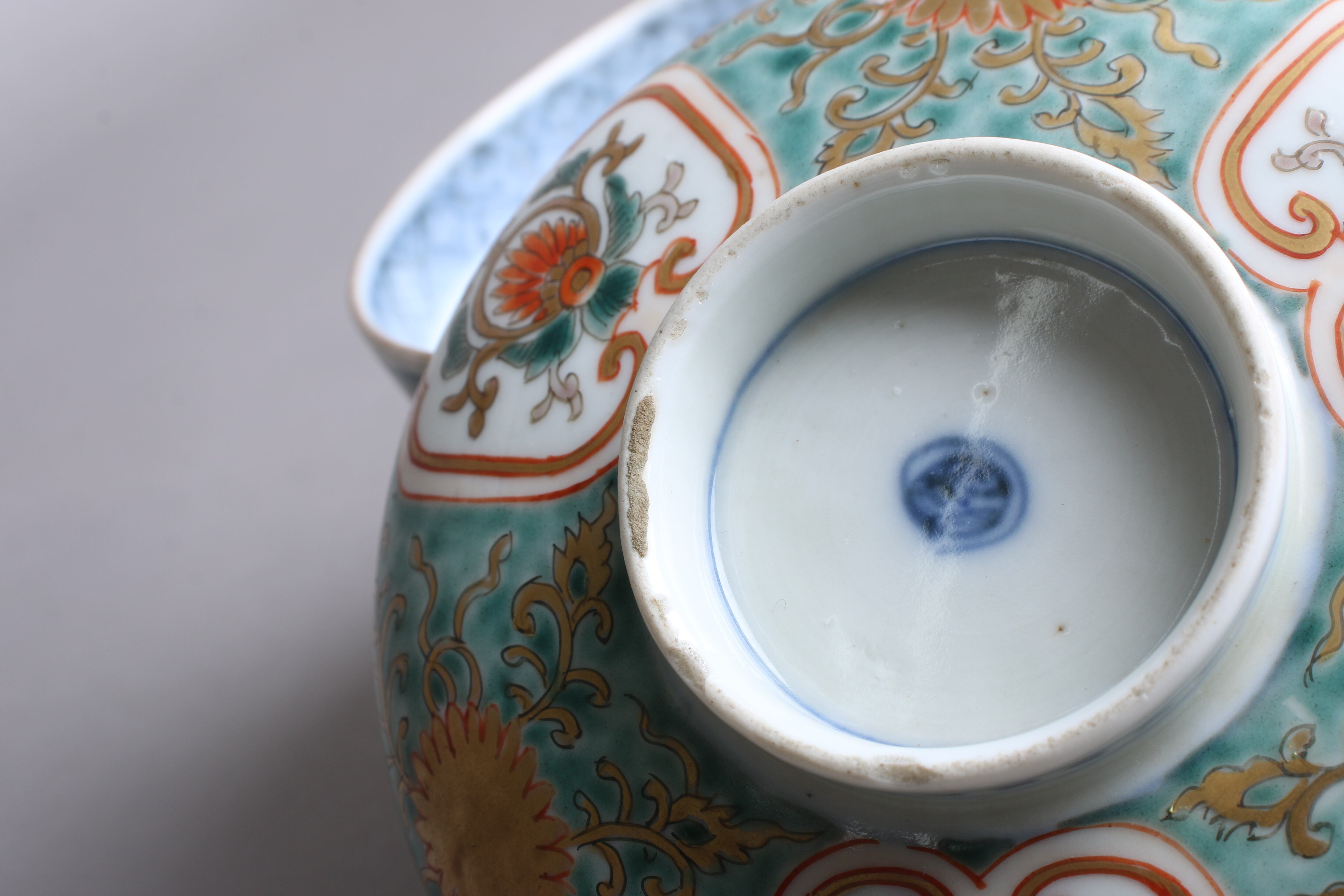 金彩の剥離、釉薬の剥がれている箇所があります。また蓋と身で緑の色合いが若干異なっております。
