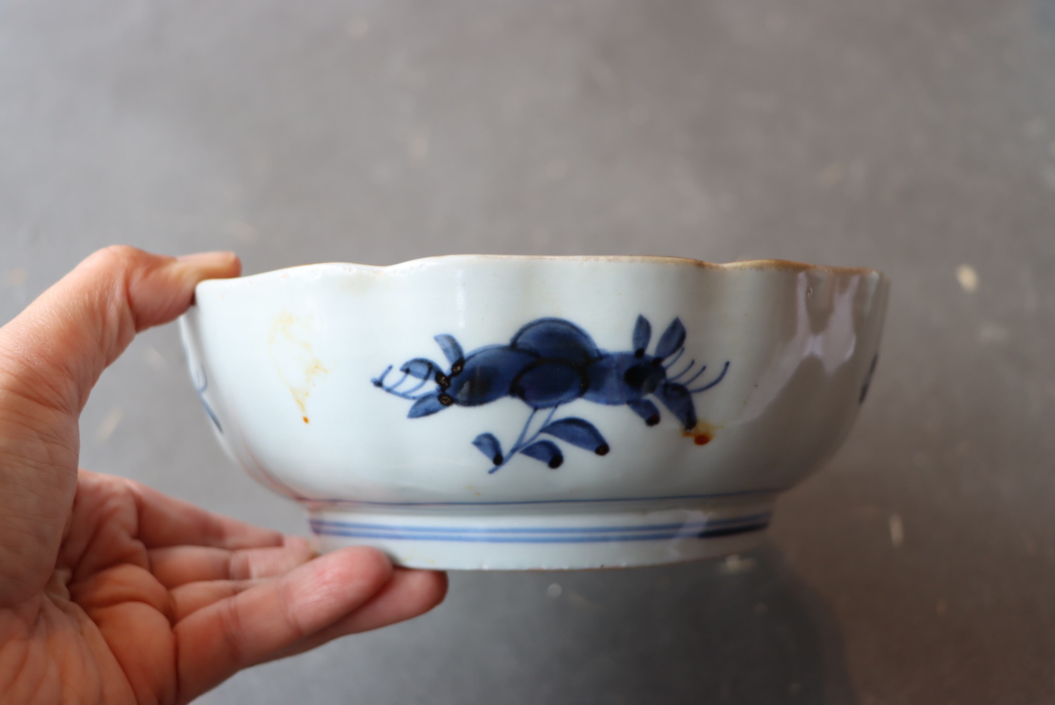 焼成時に窯の中でできる鉄分、くっつき、かまきず、経年による釉薬の薄れがございます。また、一枚一枚手描き、手作りです焼ので器のサイズ(ミリ)、色味、描かれている文様の大きさなど個体差があり、ひとつとして同じものはございません。そういった時代感、個性をご理解いただき、楽しんでくだされば幸いです。電子レンジや食器洗い乾燥機のご使用はお控えください。