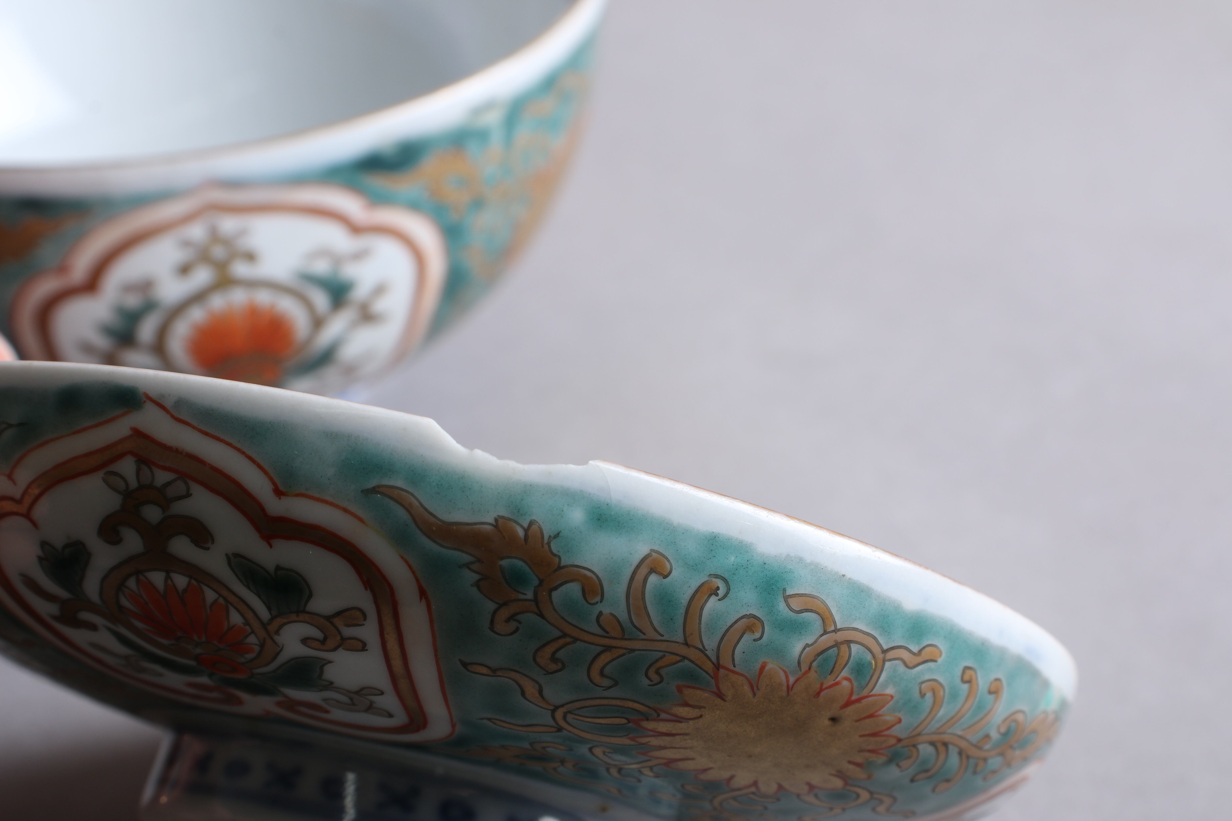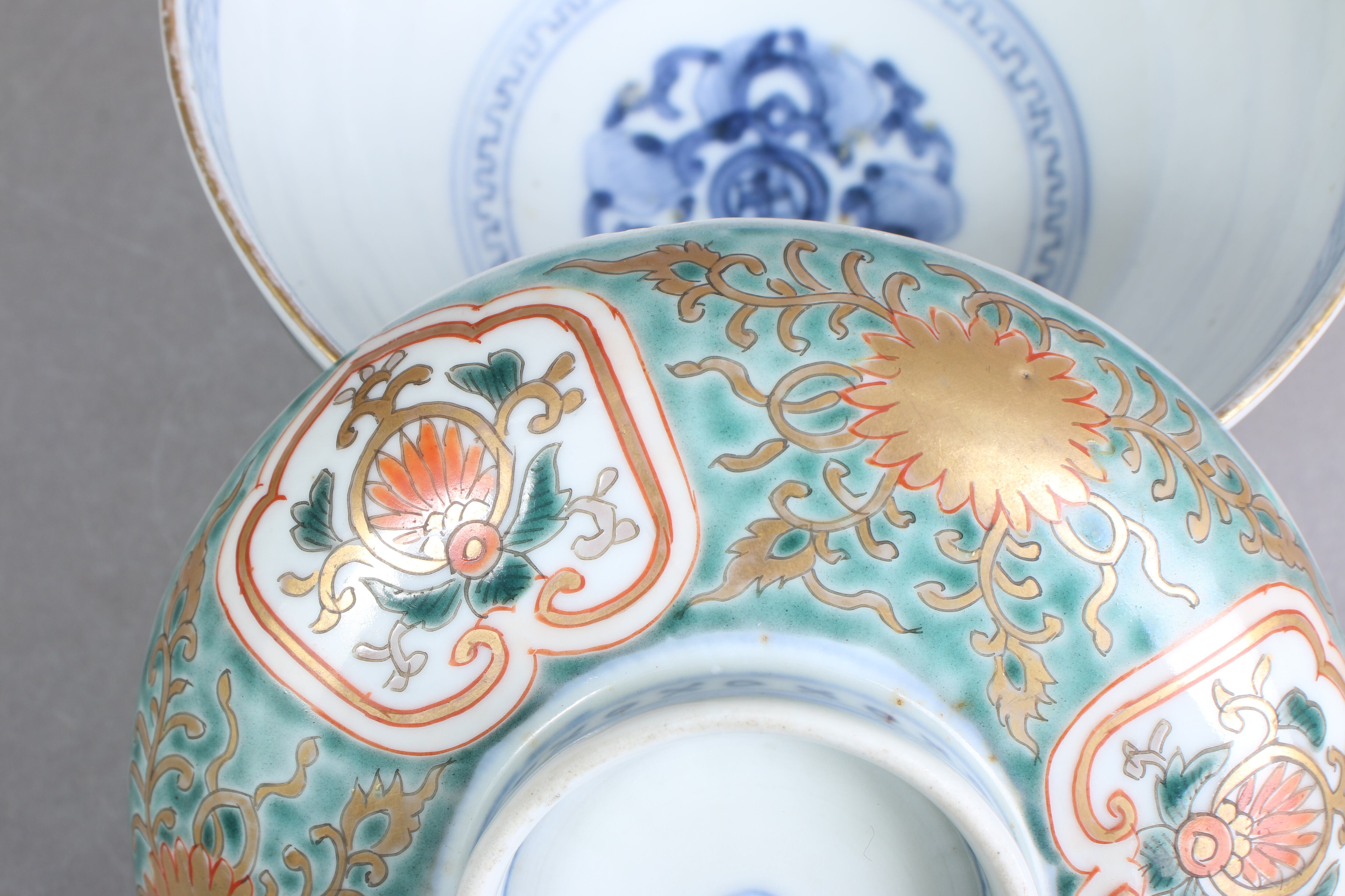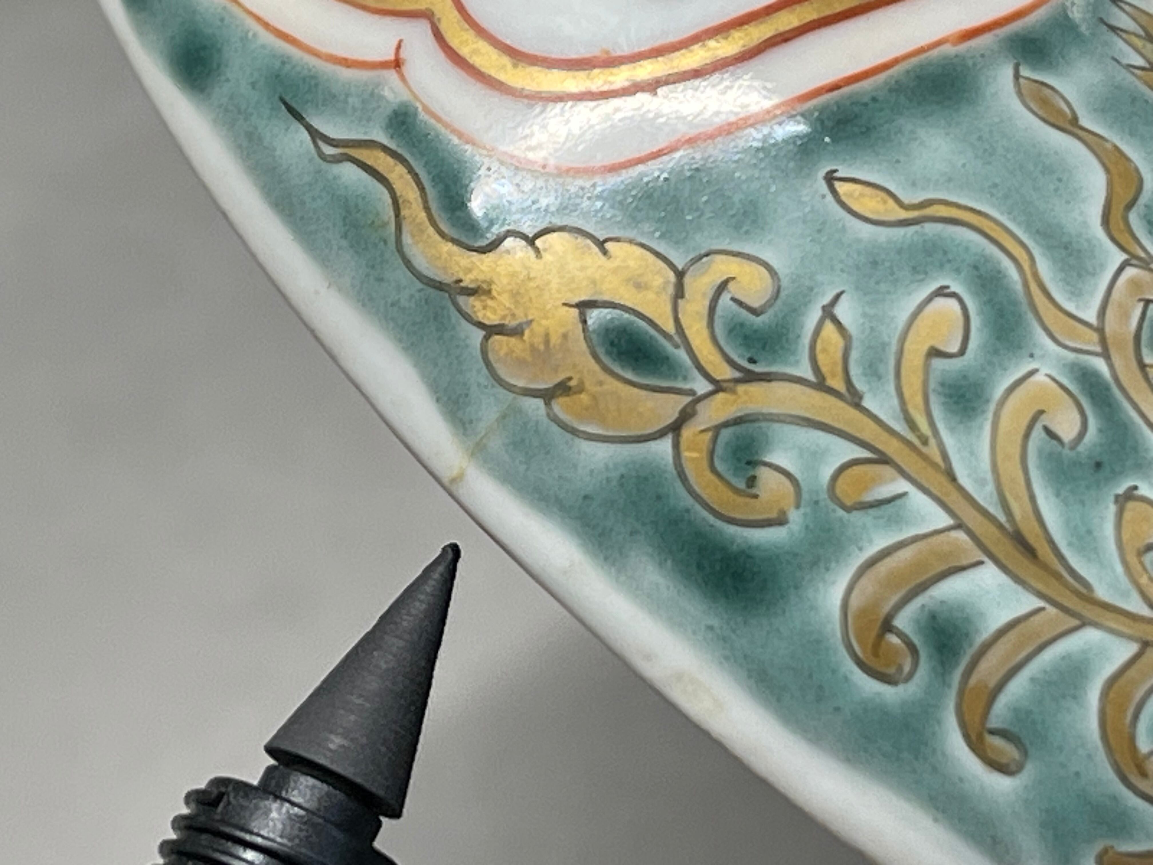 金彩の剥離、釉薬の剥がれている箇所があります。また蓋と身で緑の色合いが若干異なっております。