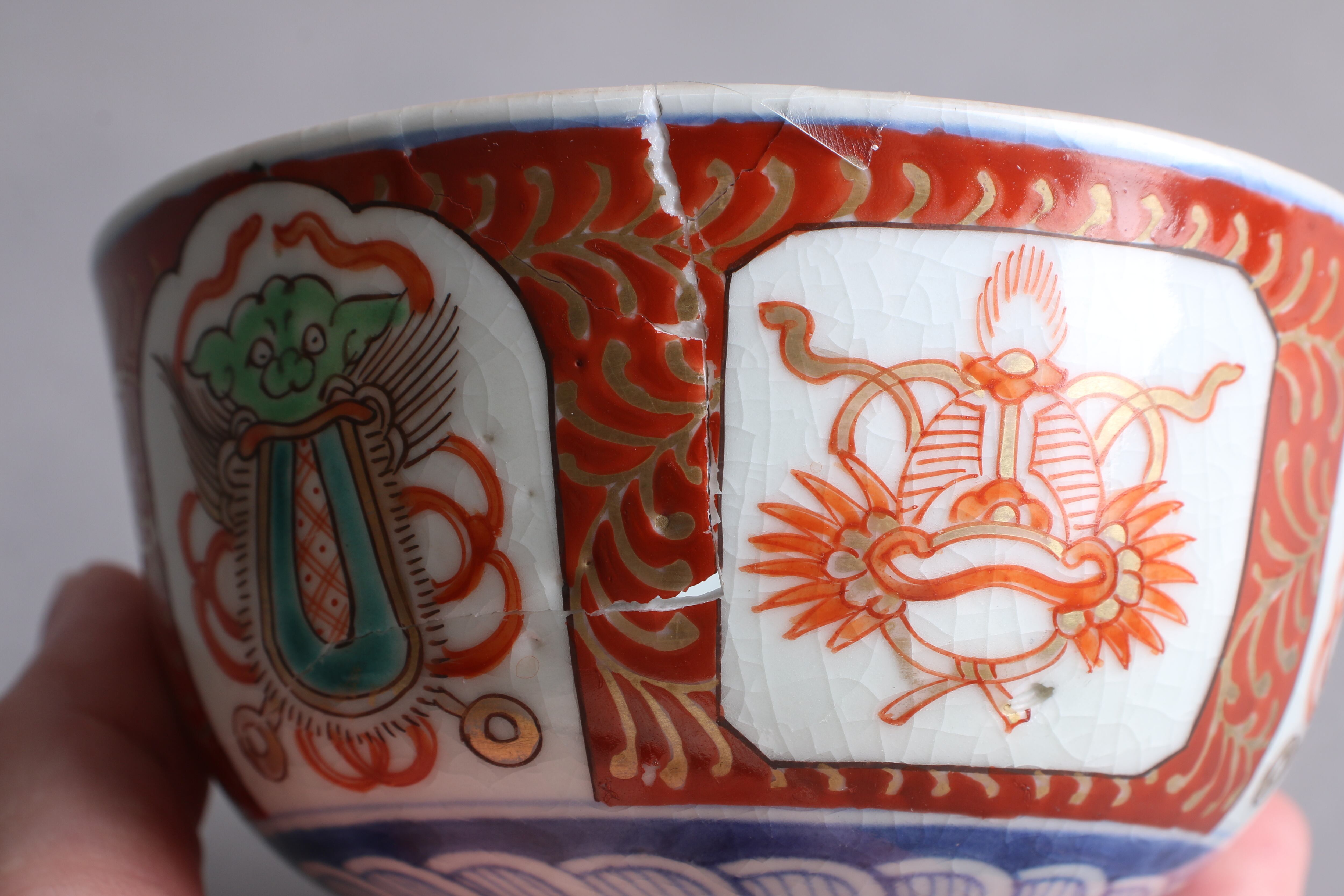 口縁に施されている金彩が剥離しています。パーツを合わせられたときに隙間、カケがございます。金継ぎ用に。