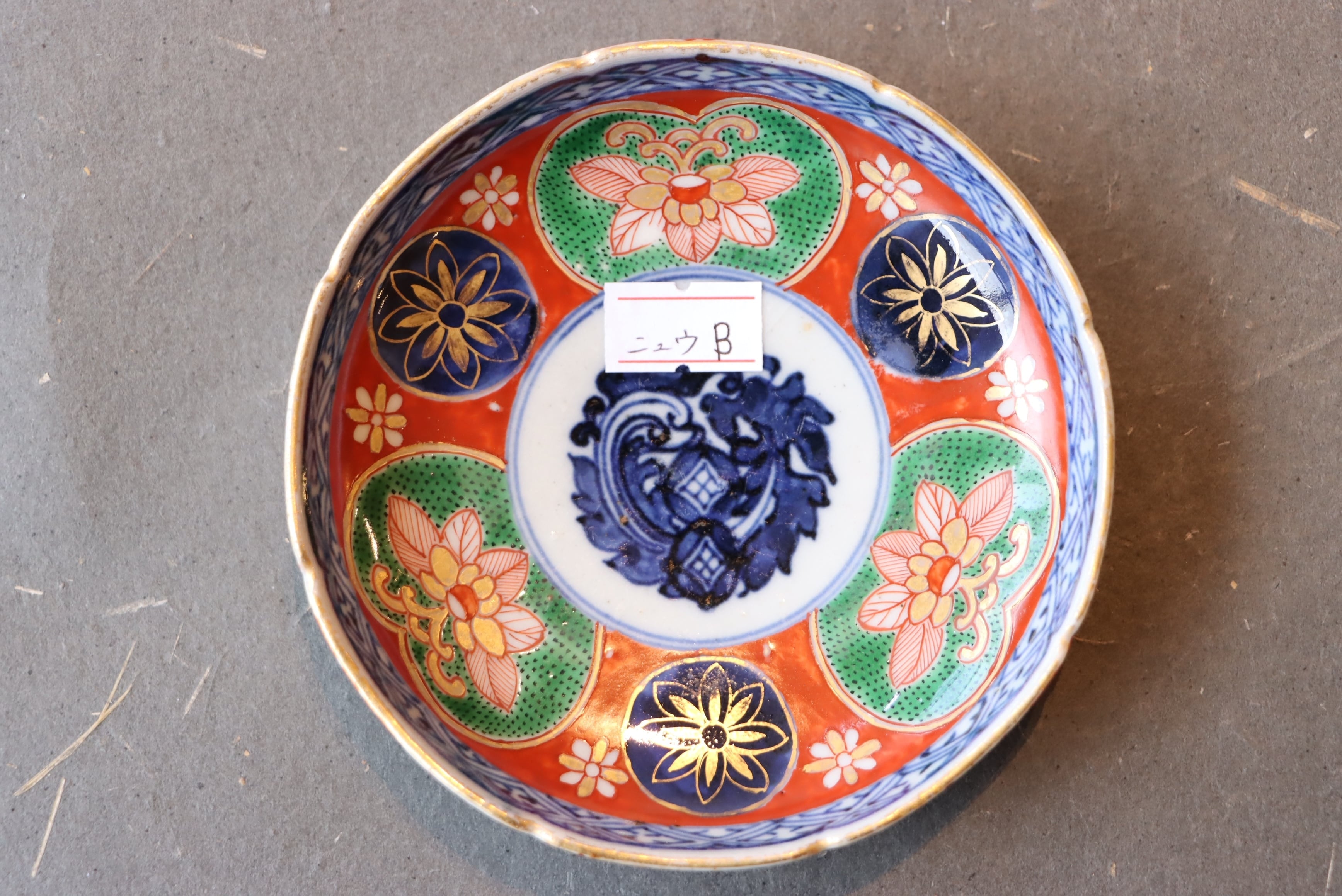 焼成時に窯の中でできる鉄分、くっつき、かまきず、ピンホール、経年による釉薬の薄れがございます。また、一枚一枚手描き、手作りですので器のサイズ(ミリ)、色味、描かれている文様の大きさなど個体差があり、ひとつとして同じものはございません。そういった時代感、個性をご理解いただき、楽しんでくだされば幸いです。電子レンジや食器洗い乾燥機のご使用はお控えください。