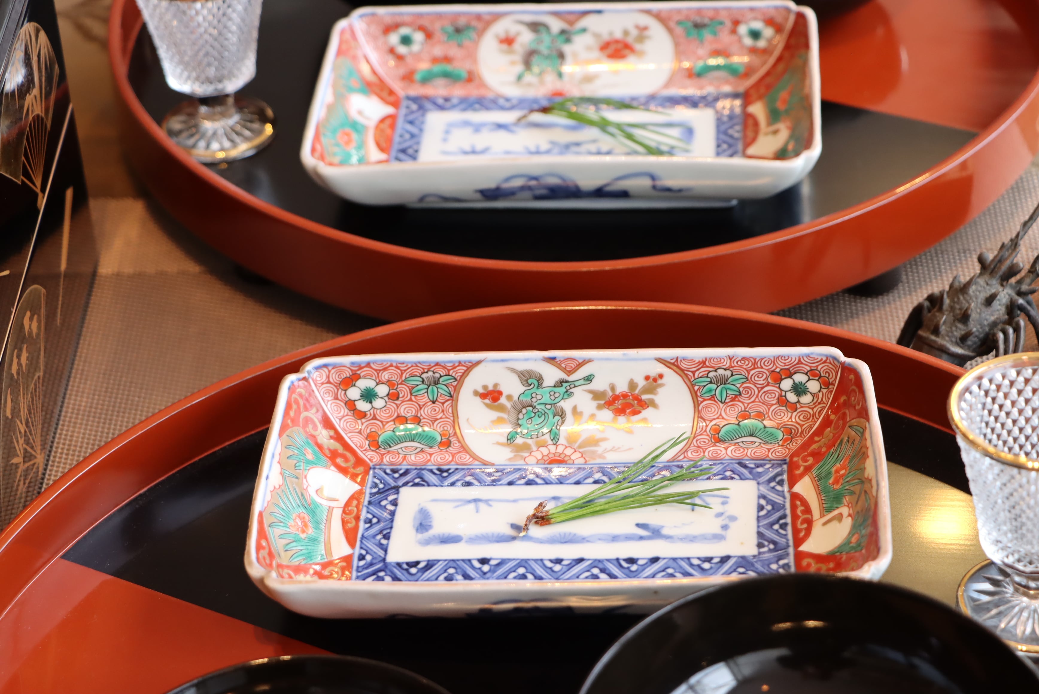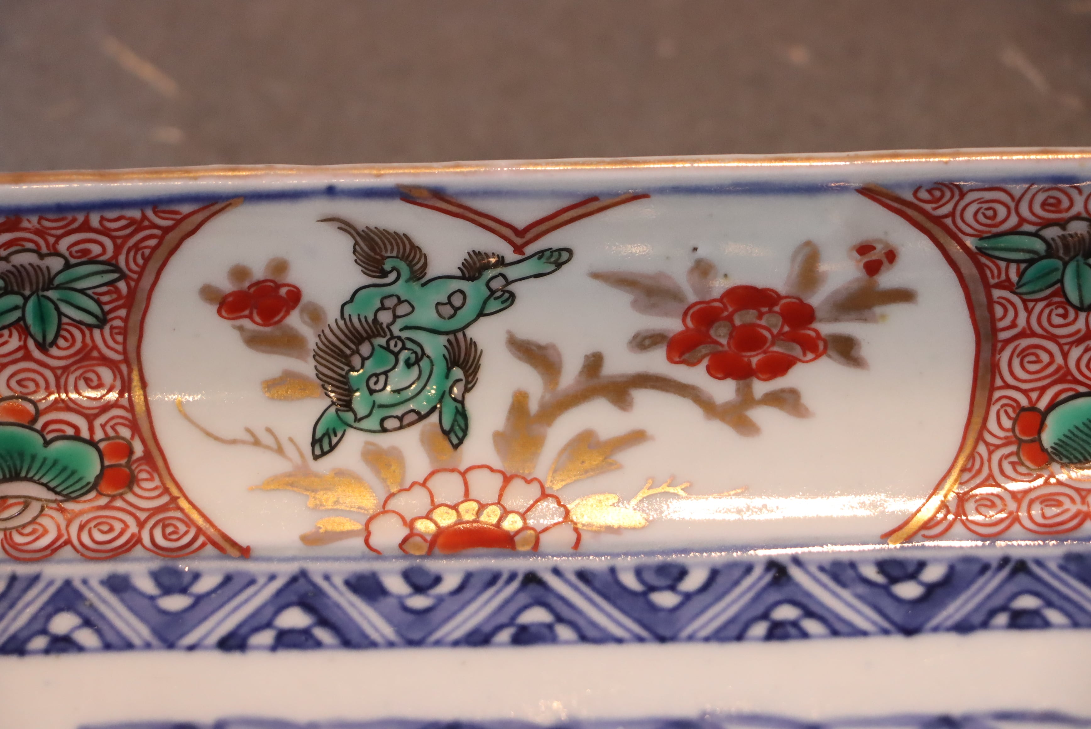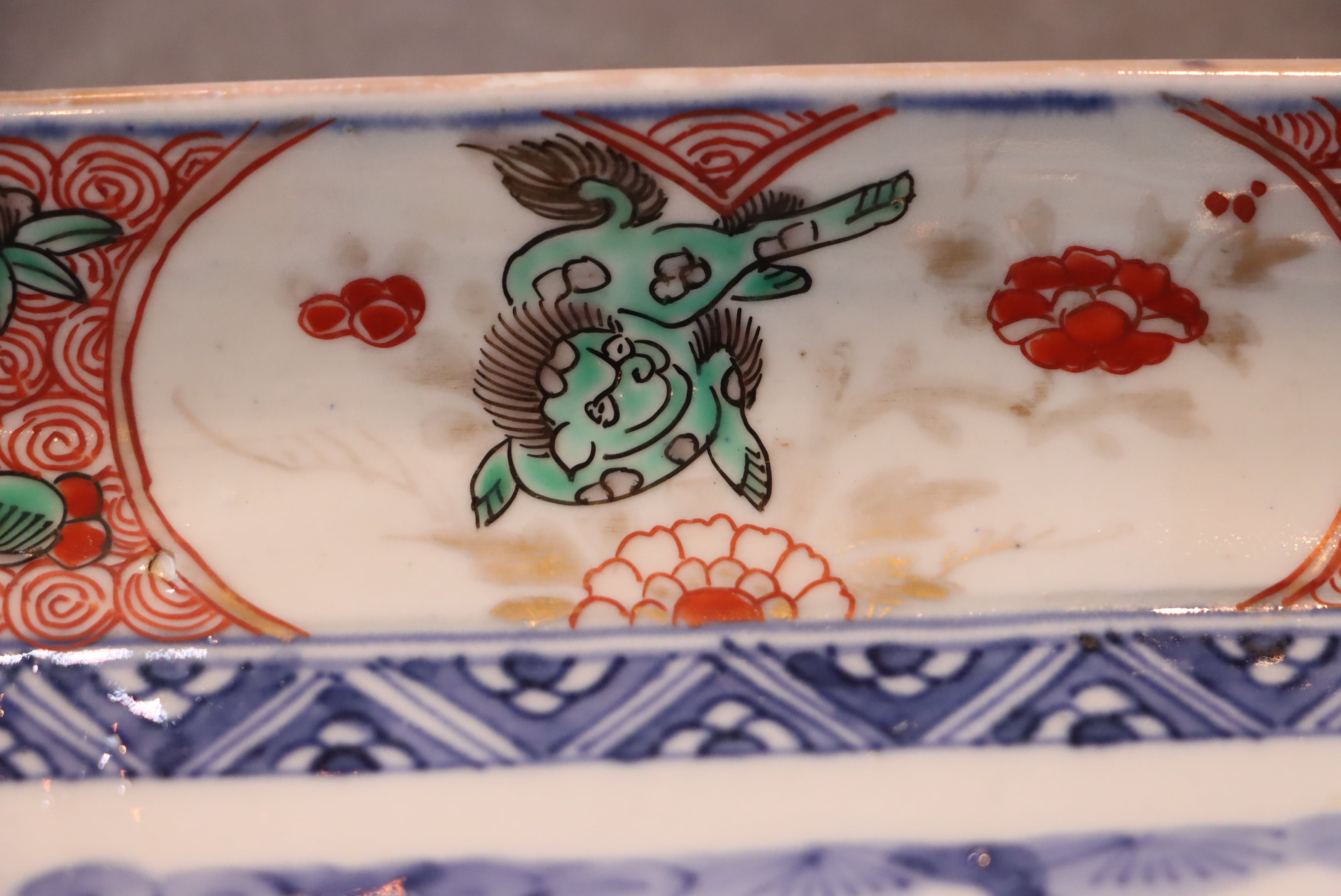 【Imari rectangular plate with lion, peony and white heron design in overglaze enamels.】