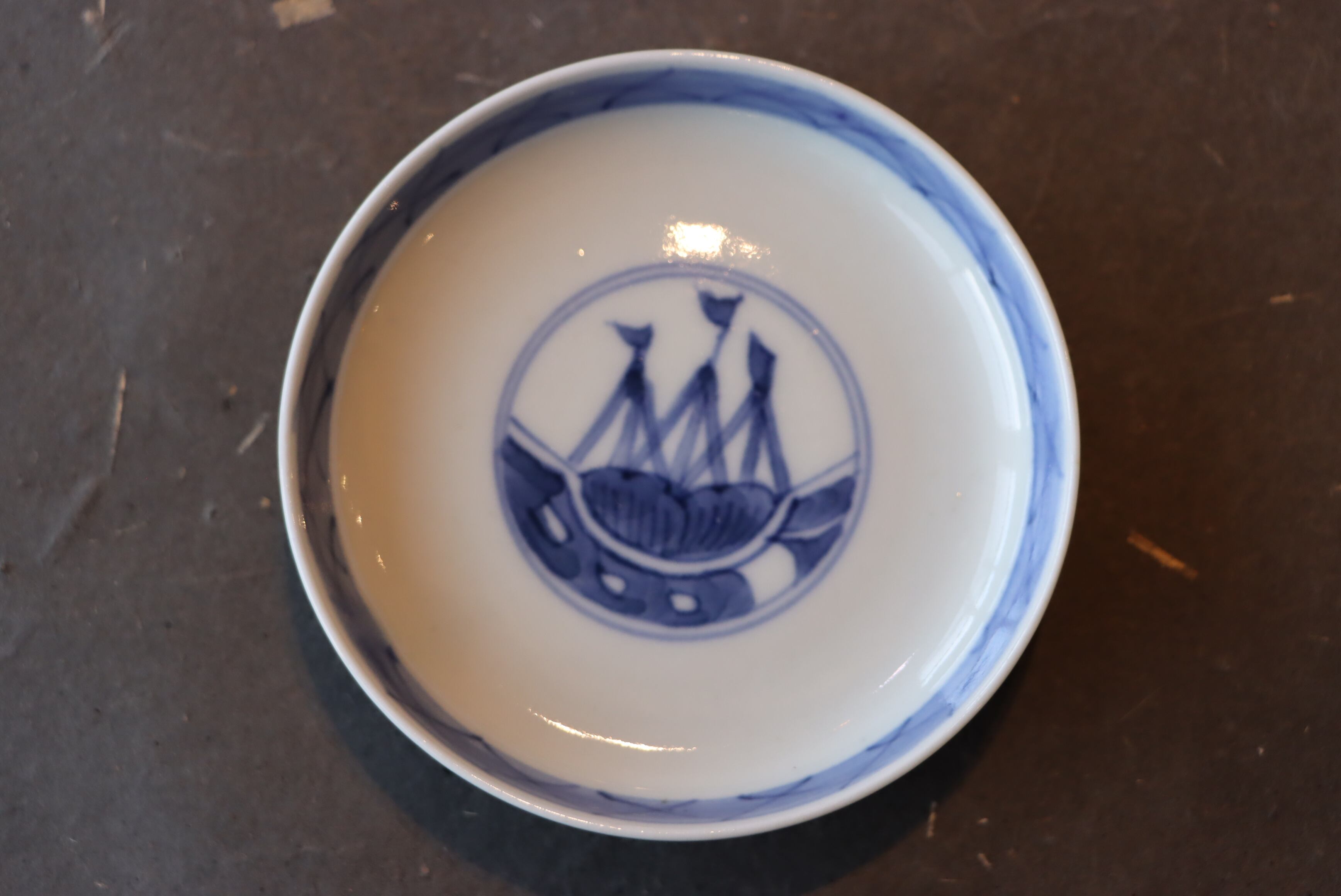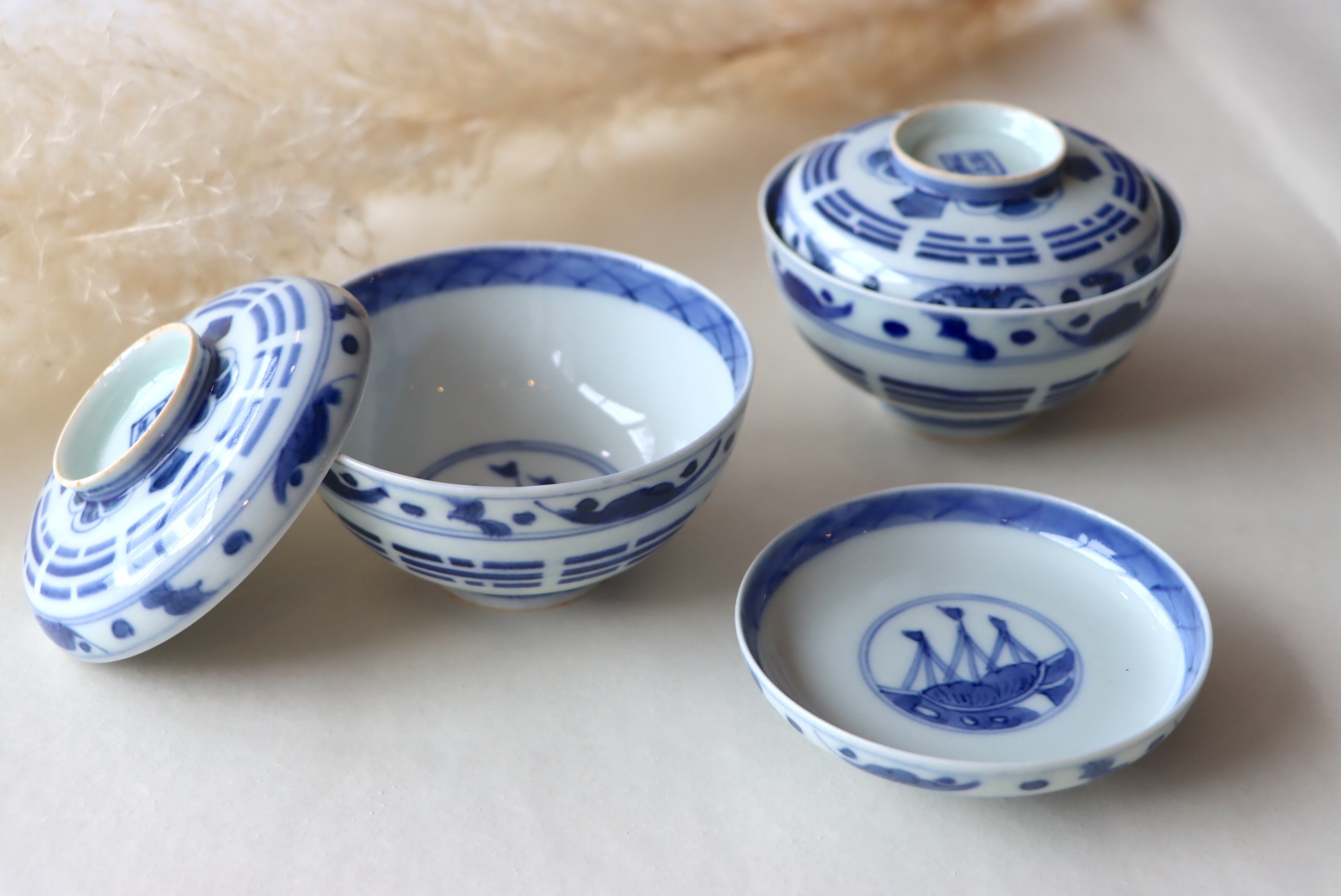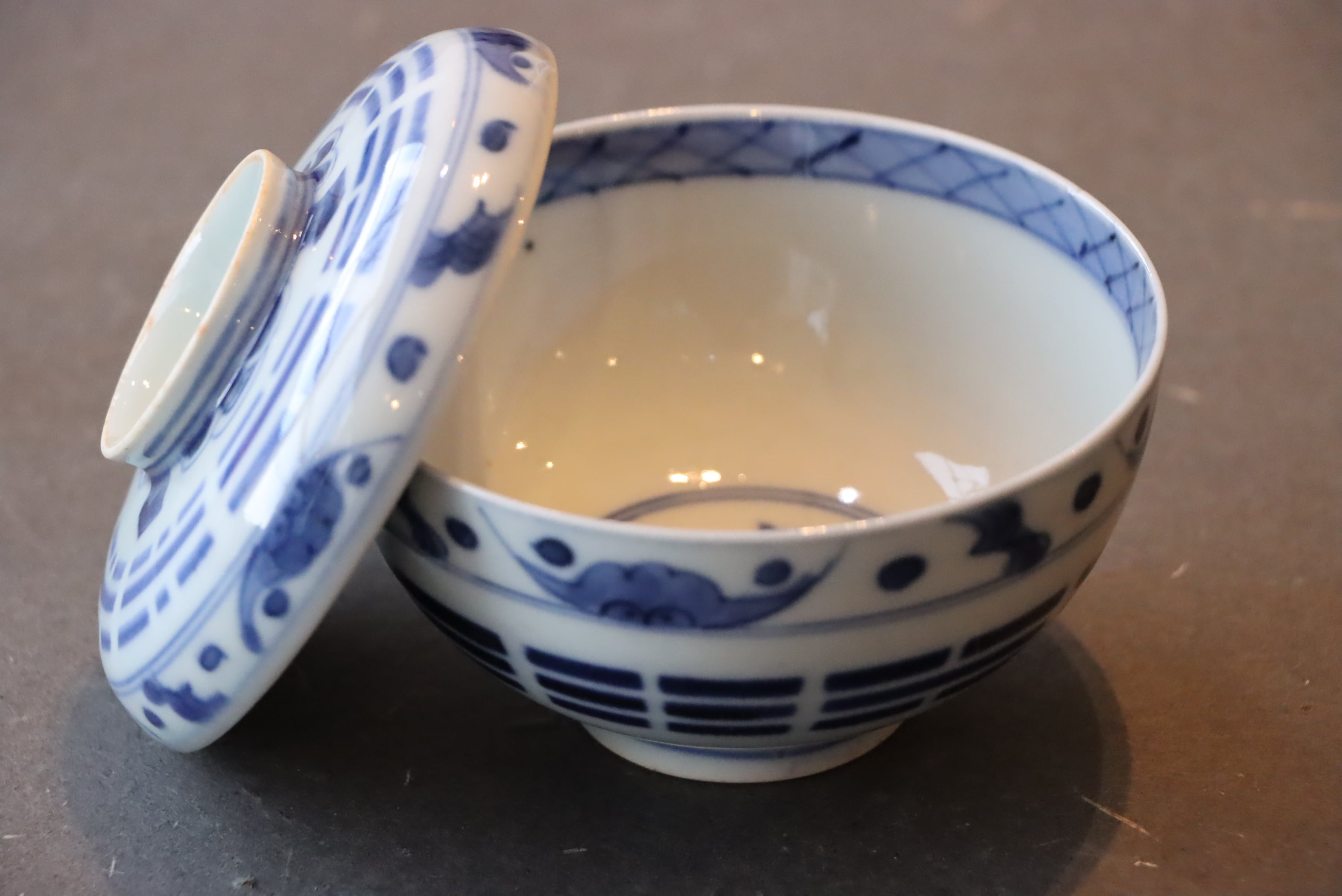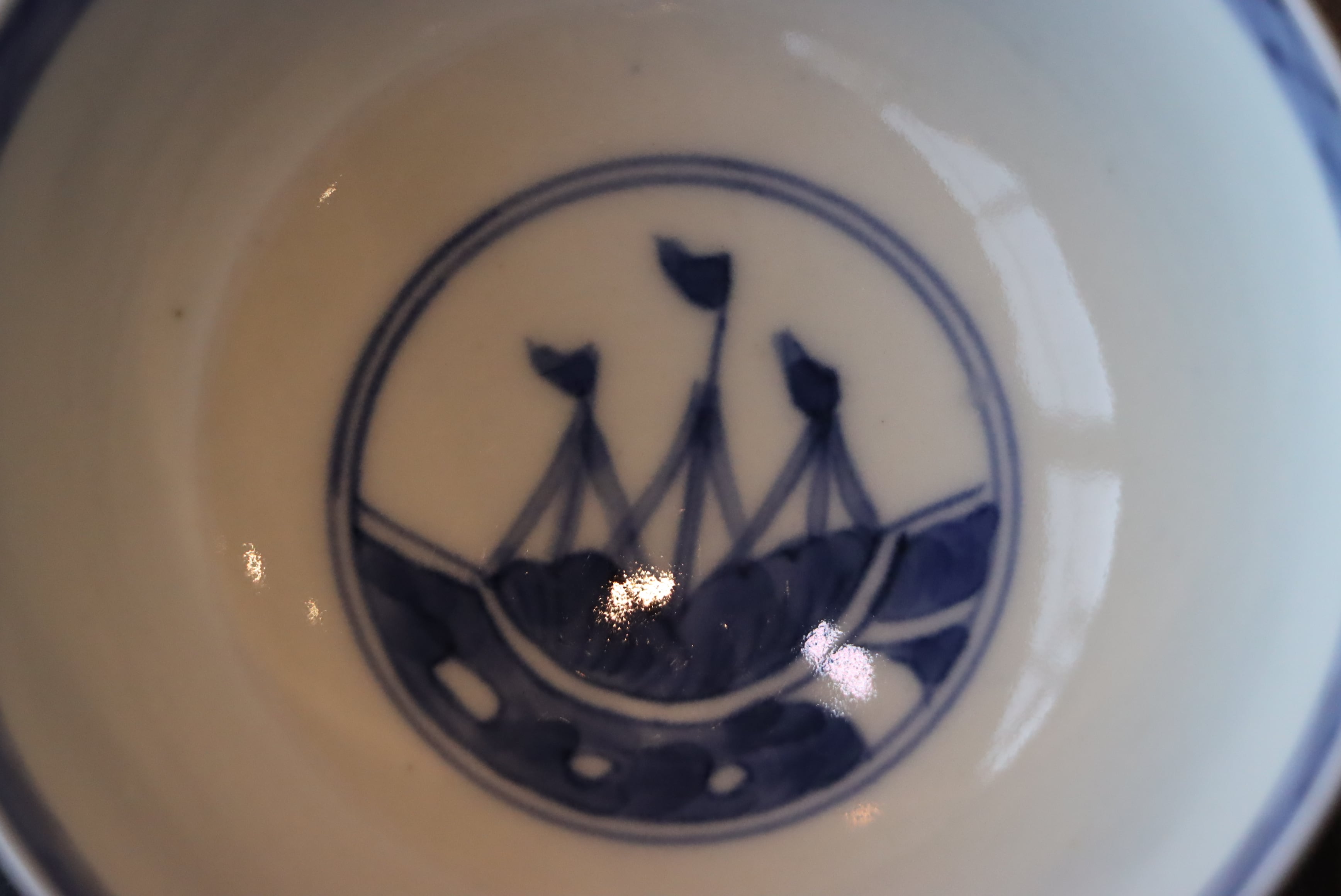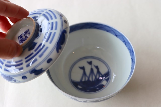 【Imari blue and white covered bowl with arithmetic block and foreign ship design.】