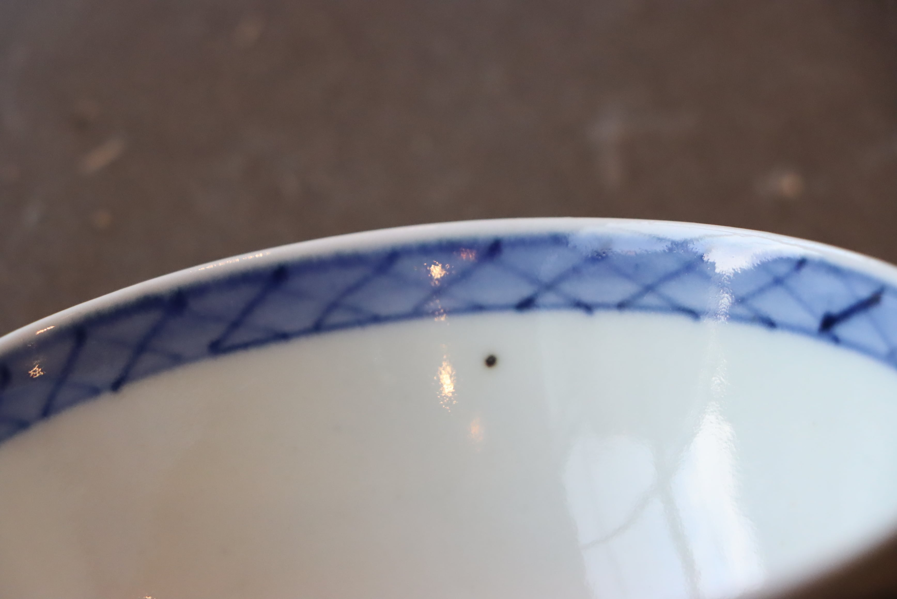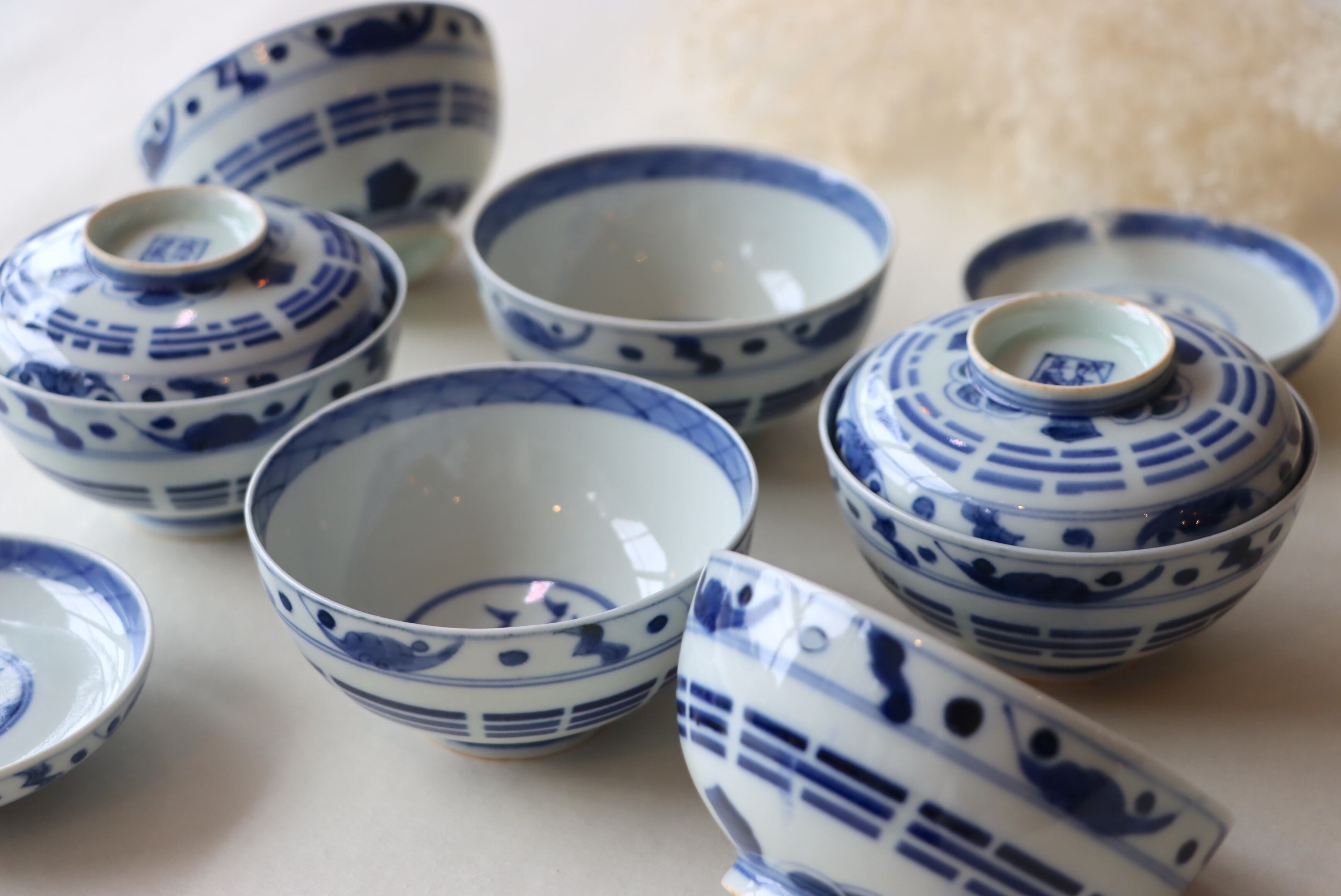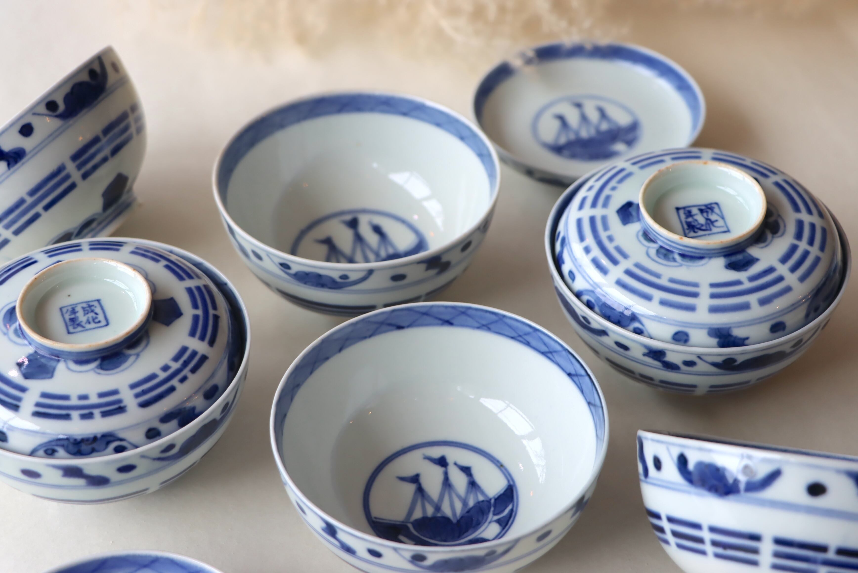 【Imari blue and white covered bowl with arithmetic block and foreign ship design.】