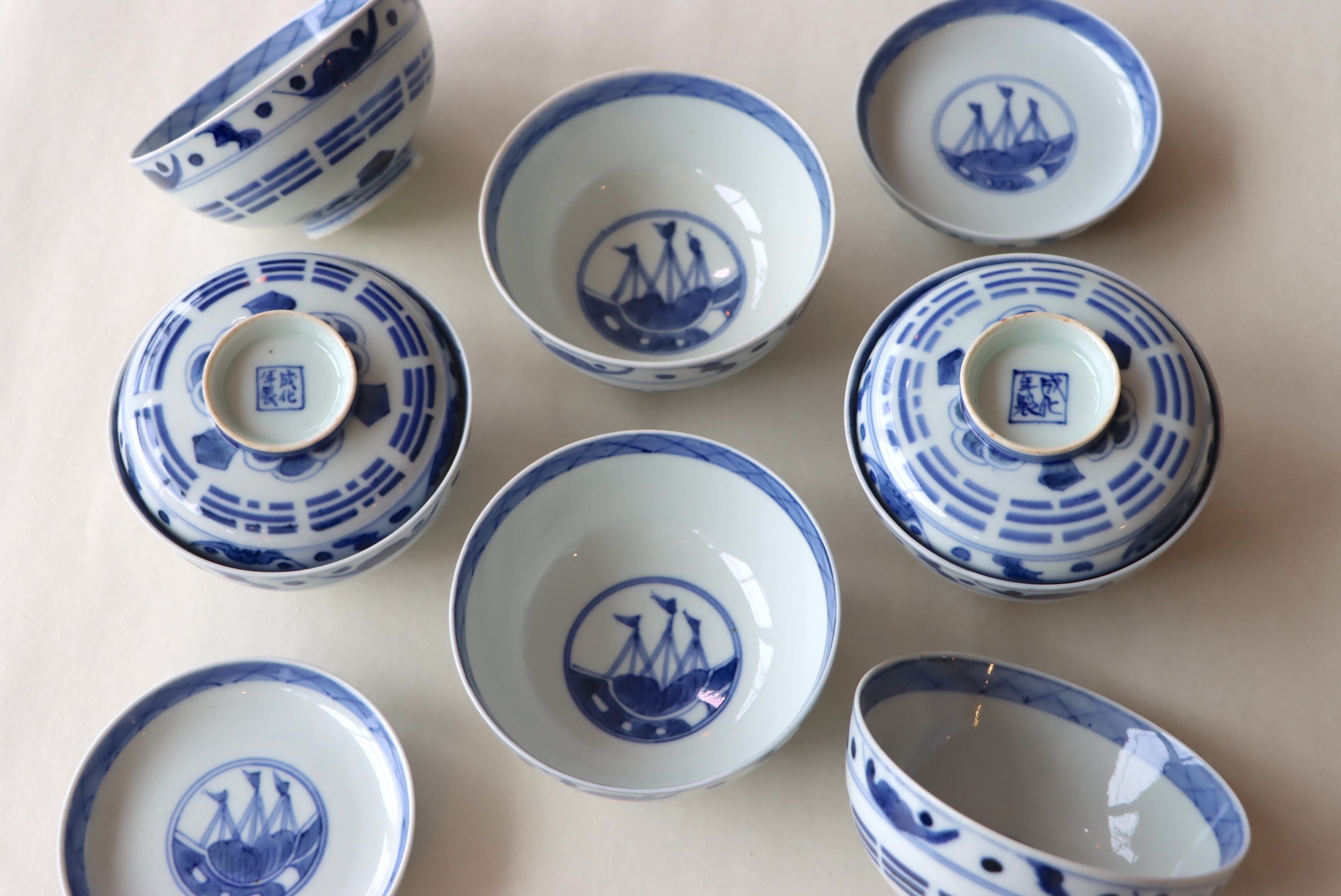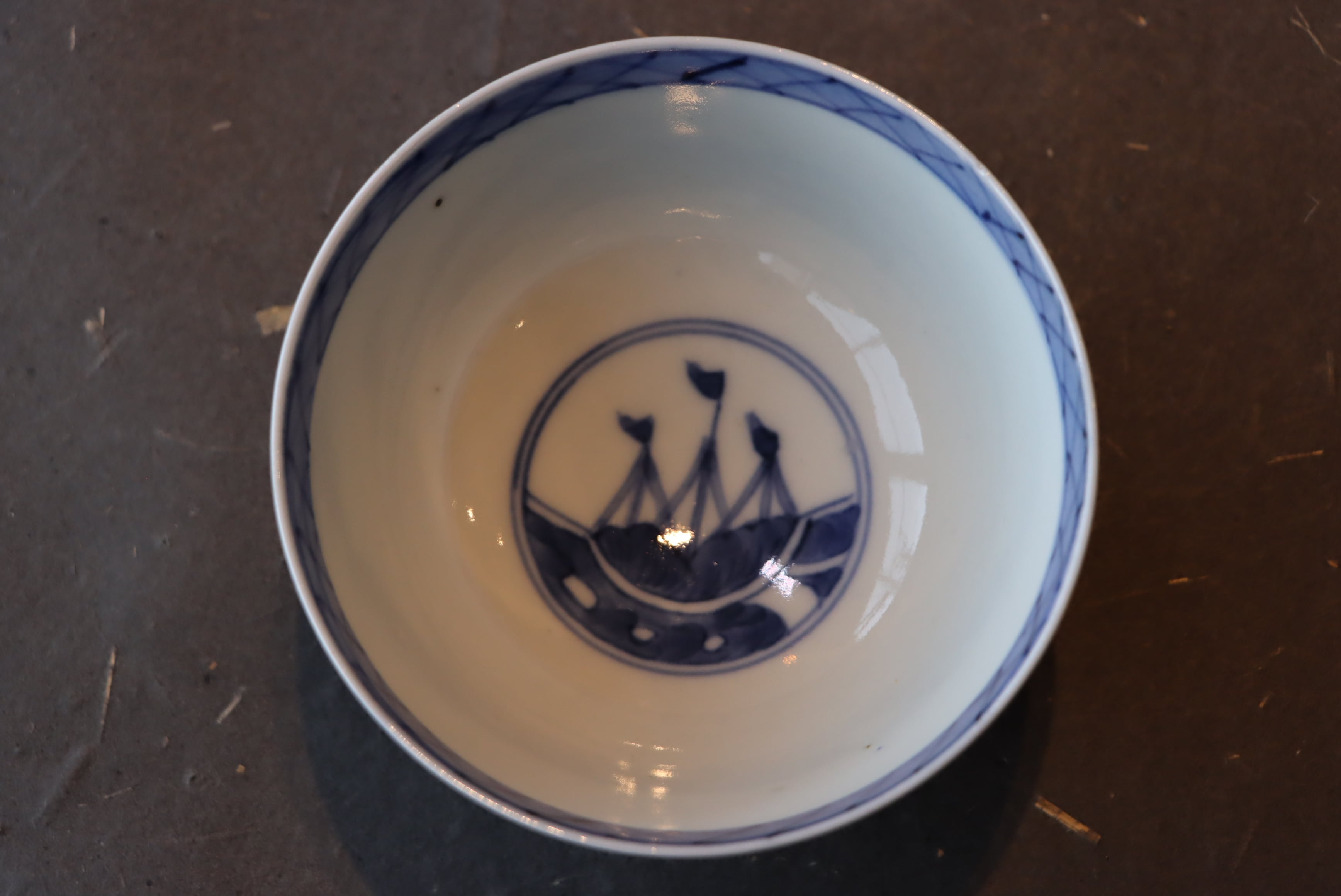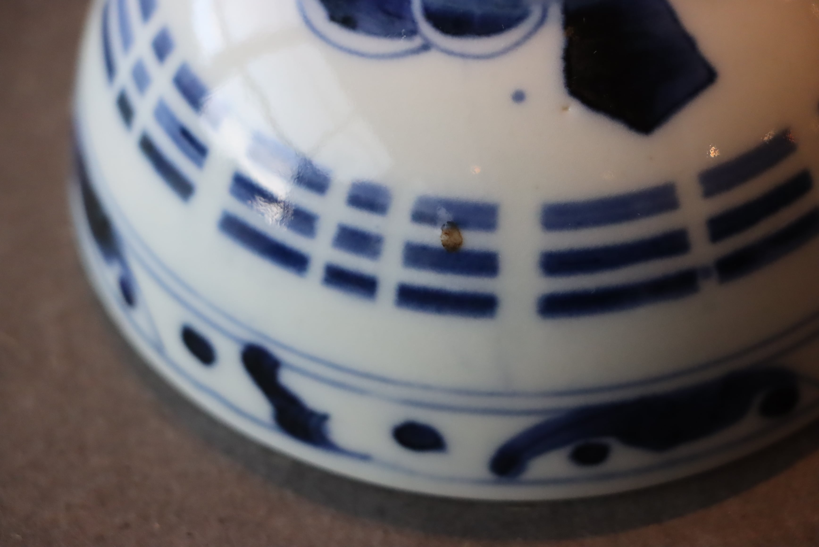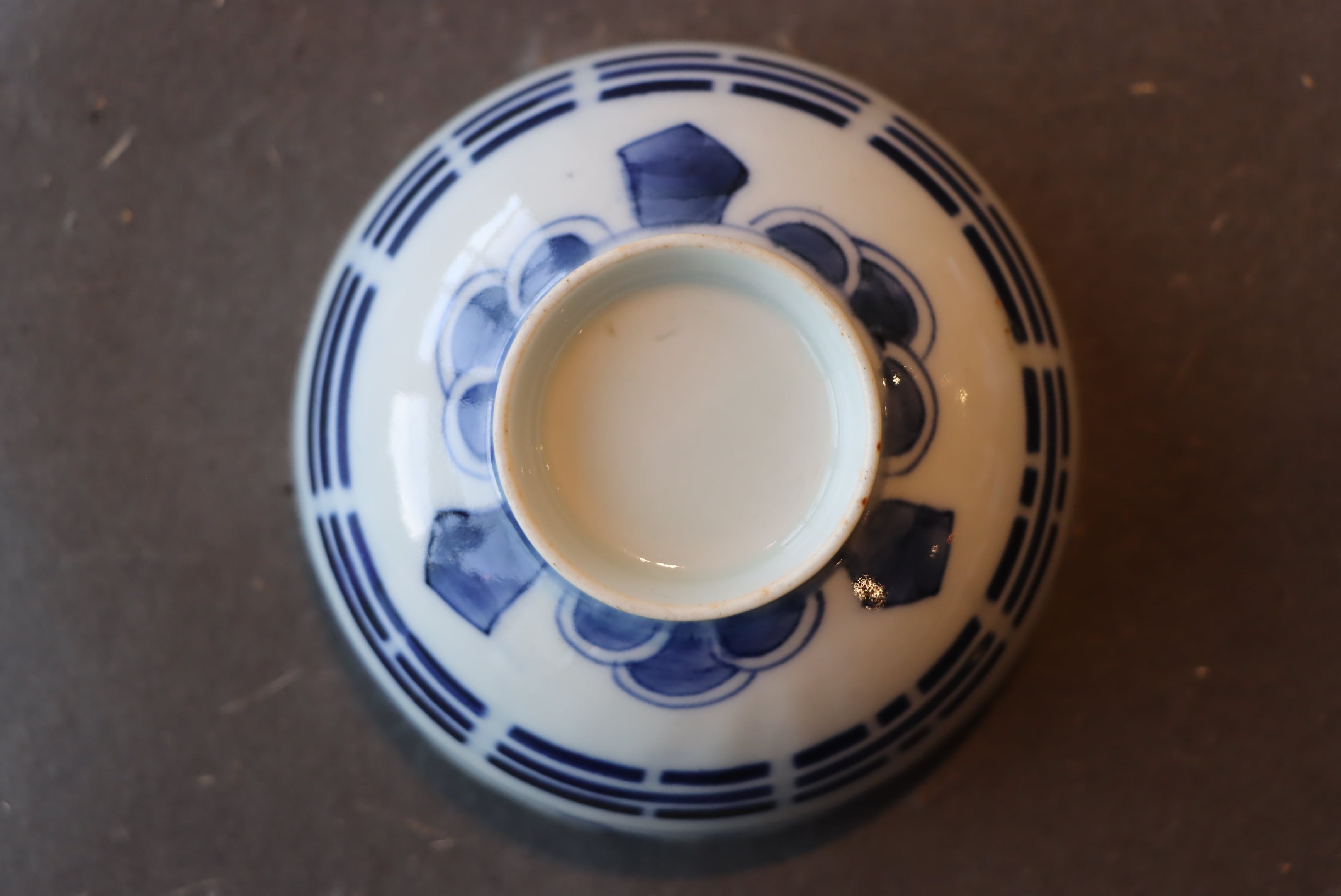 【Imari blue and white covered bowl with arithmetic block and foreign ship design.】