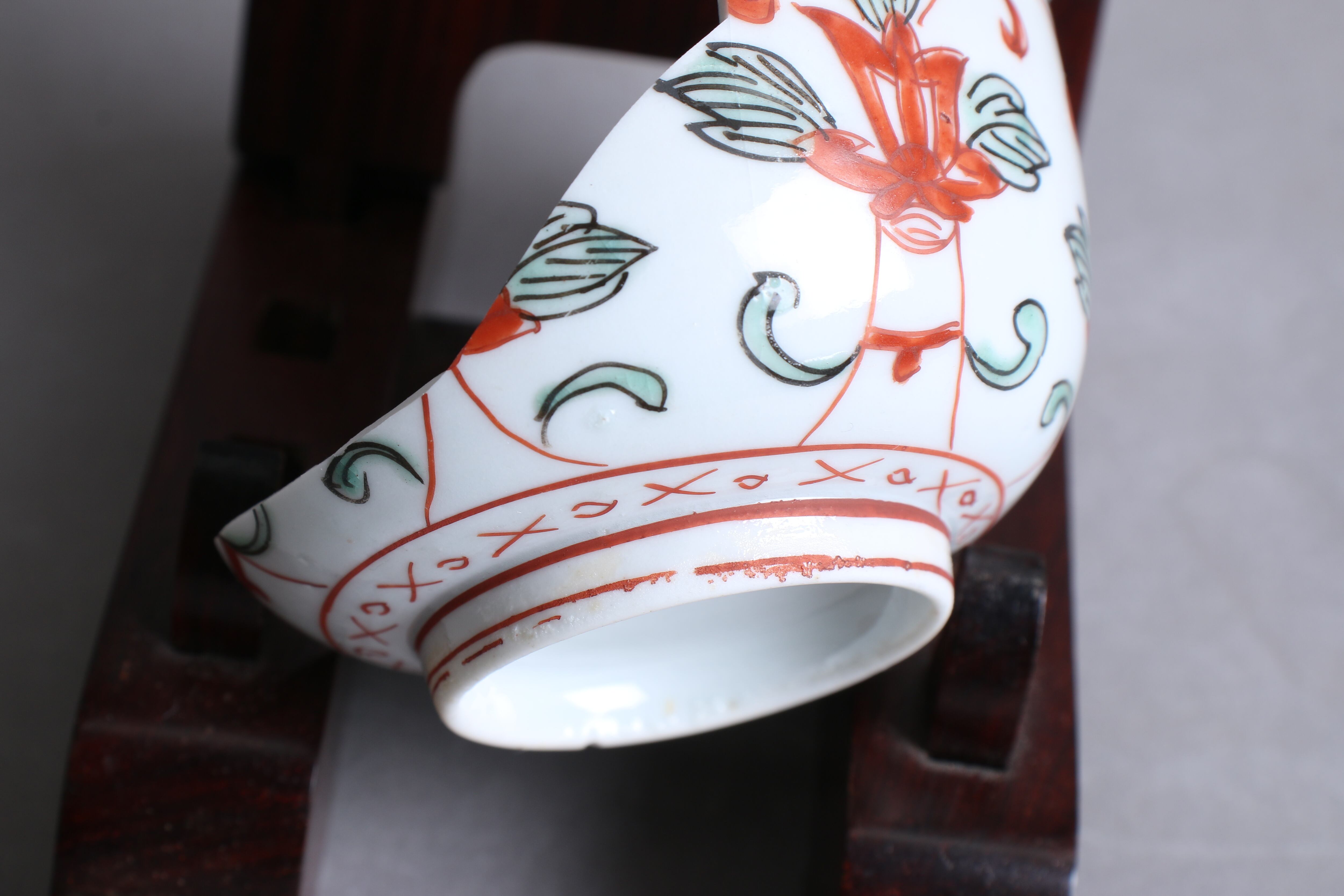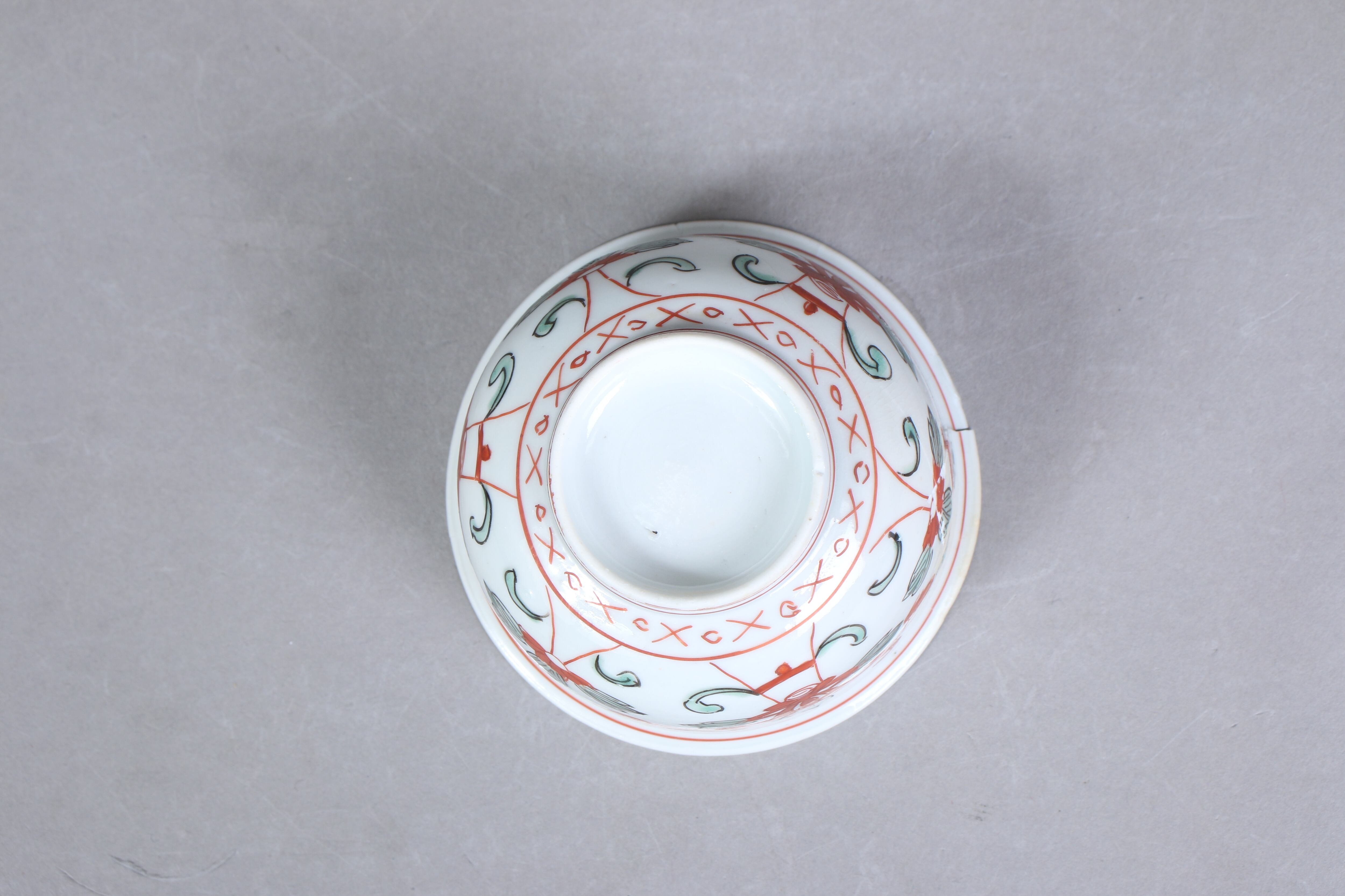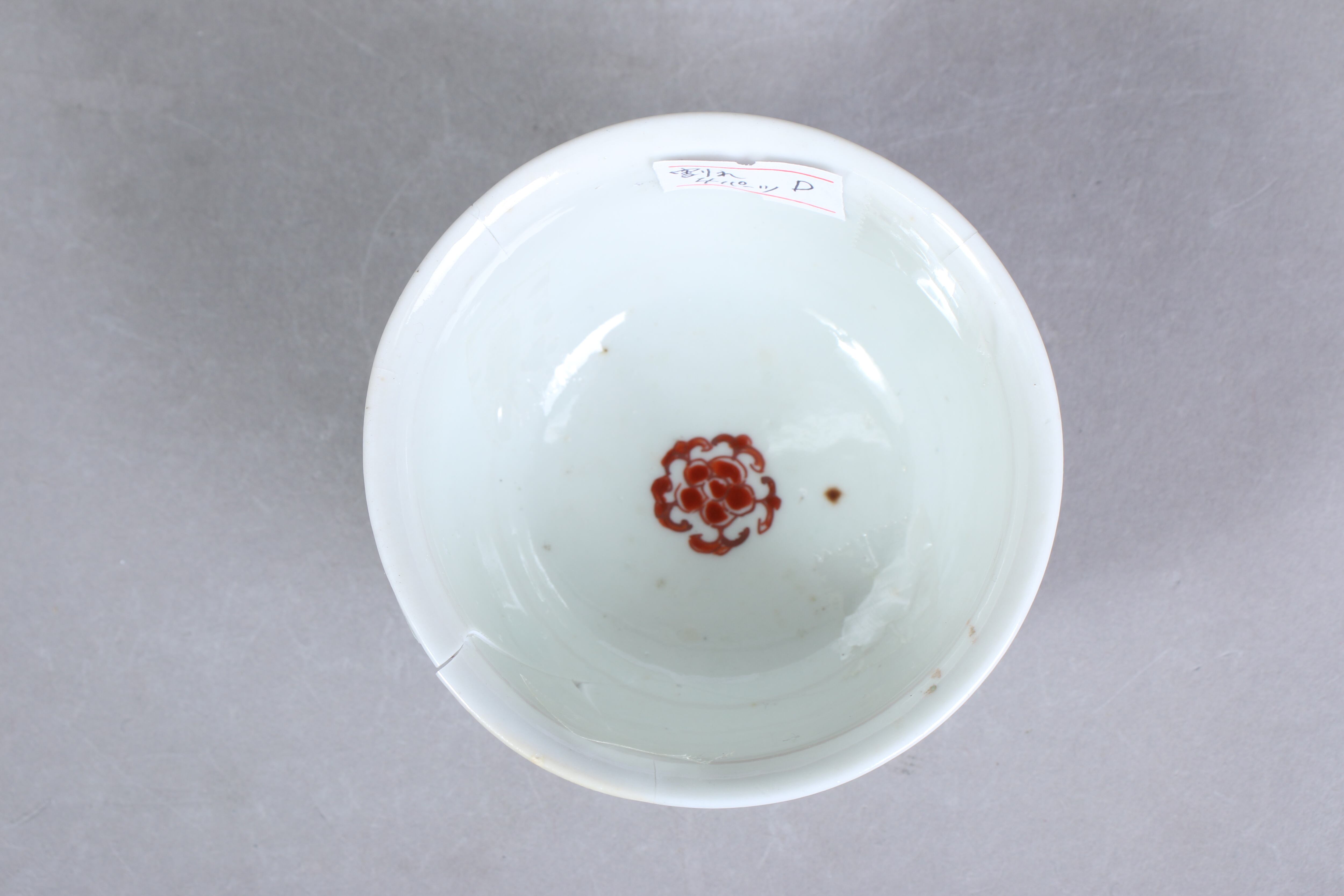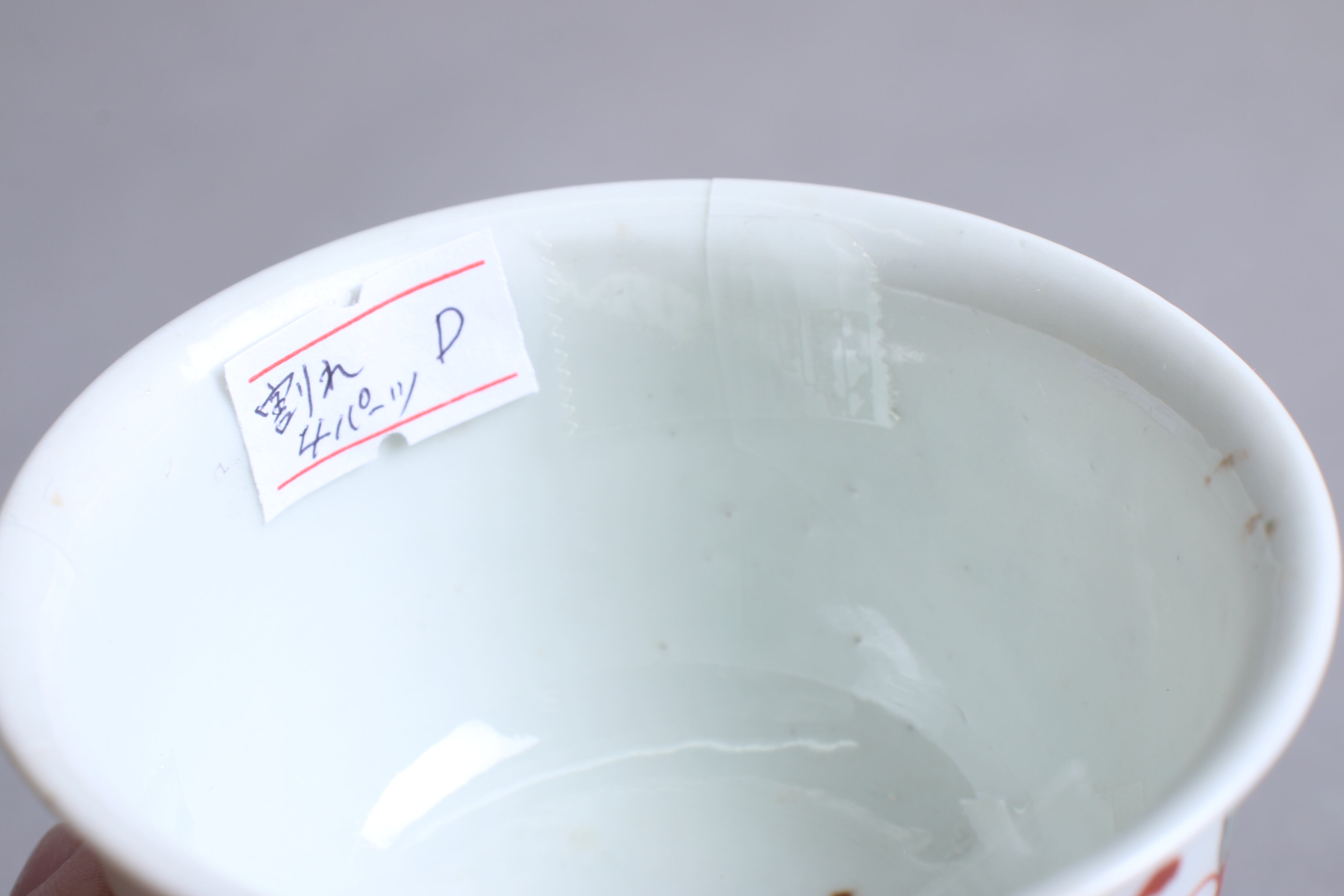 状態:割れ4パーツ。合わせられたときに隙間、カケがございます。その他、高台カケ、ニュウ あり。金継ぎ用に。
