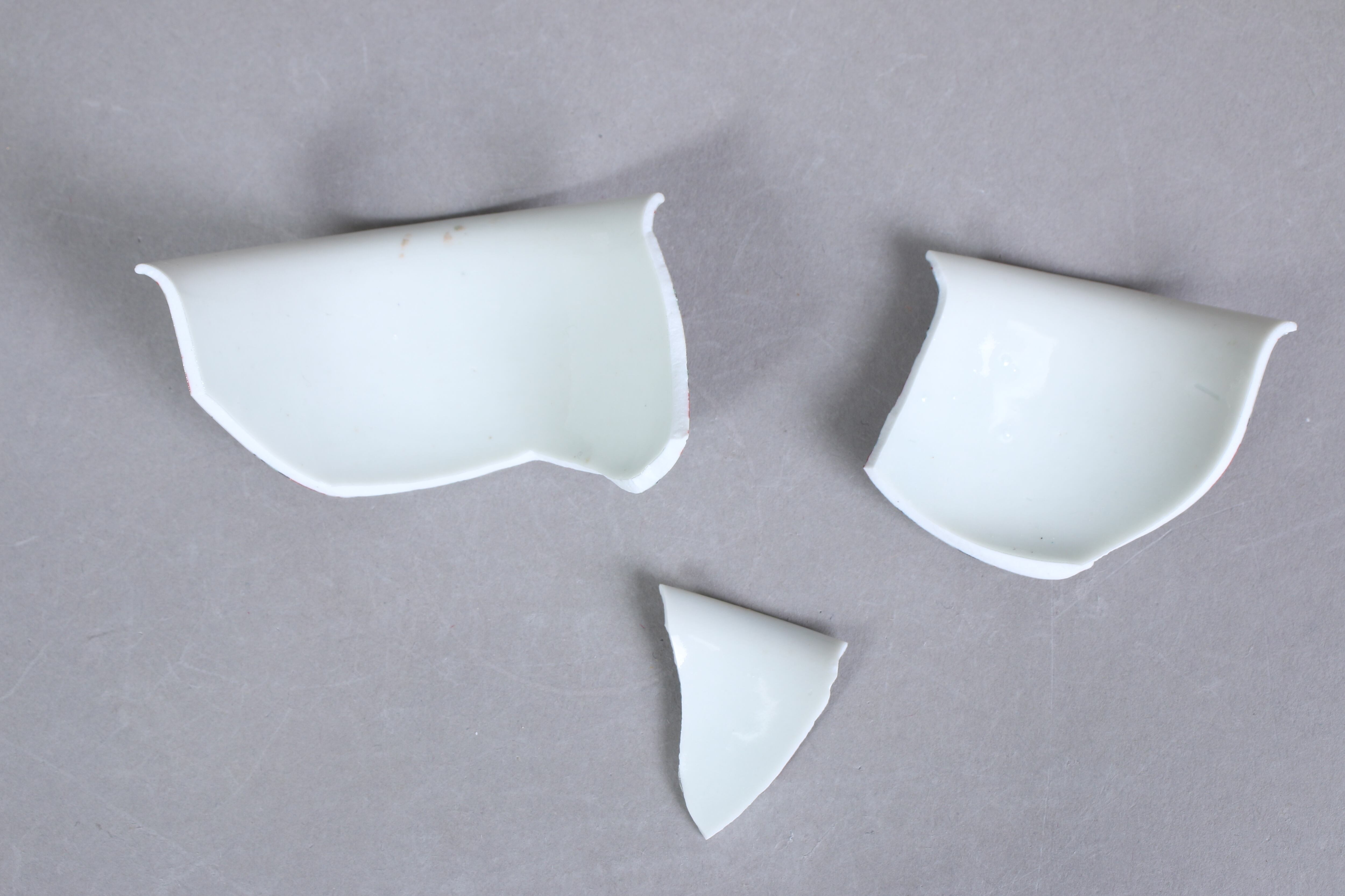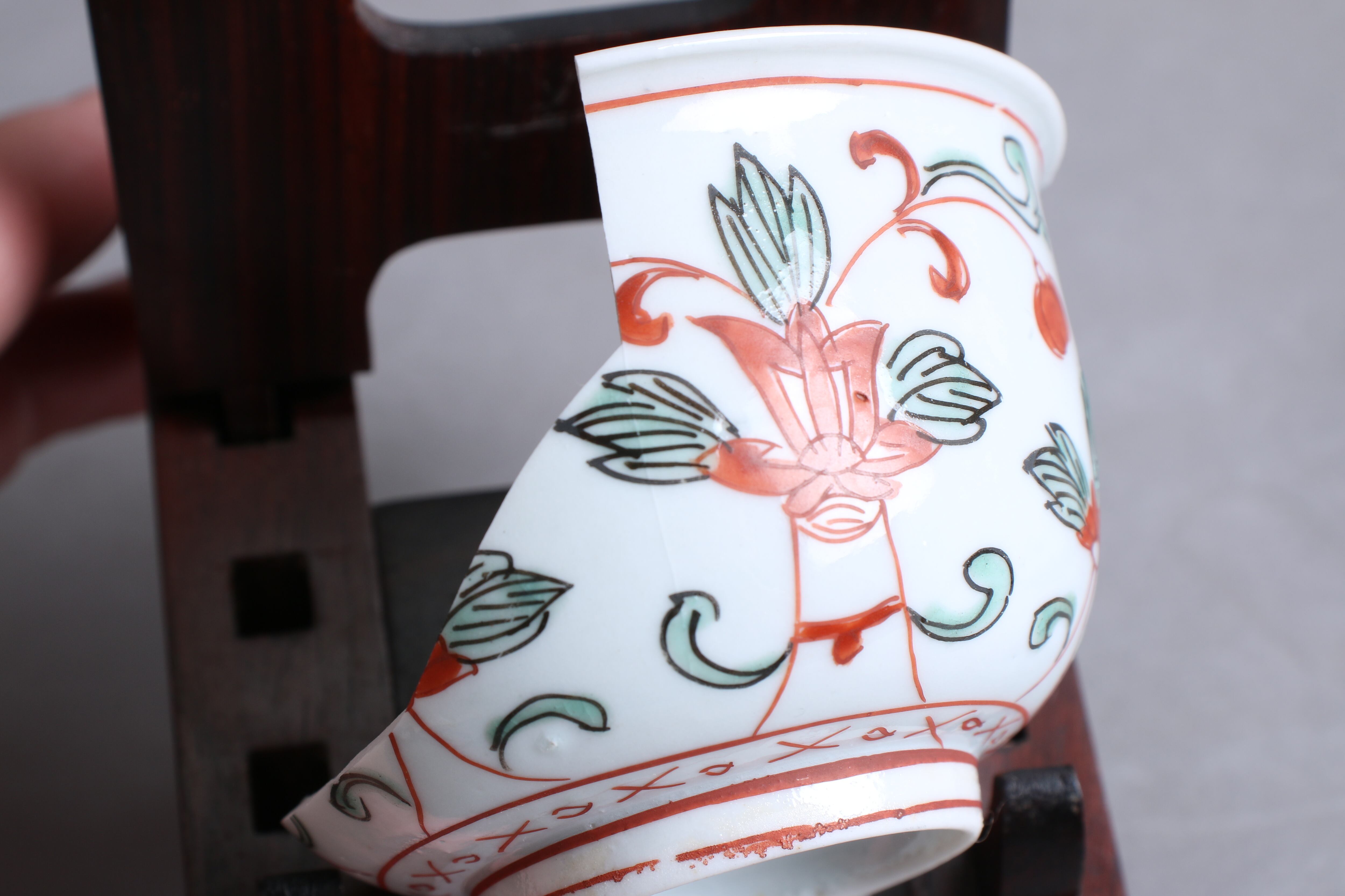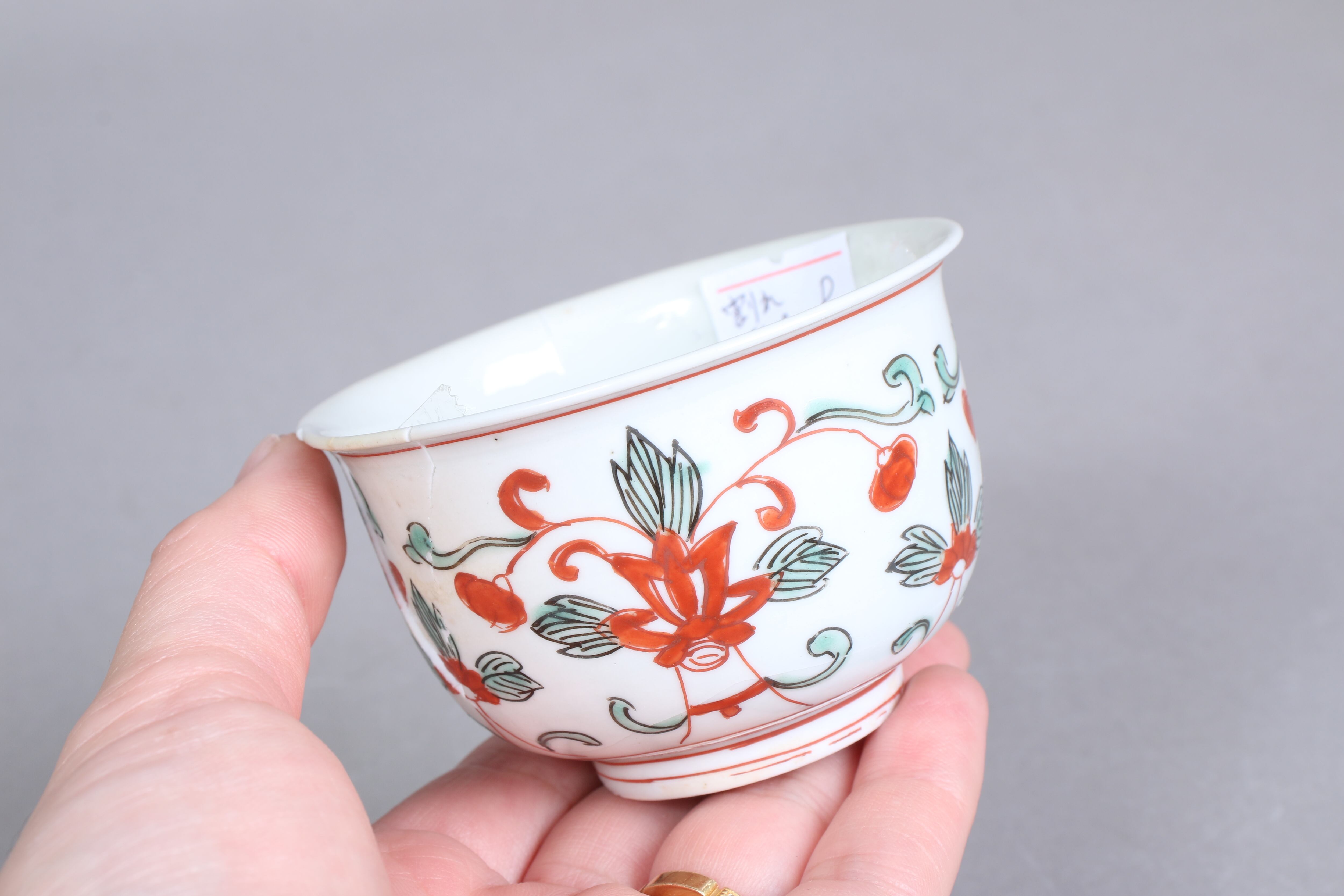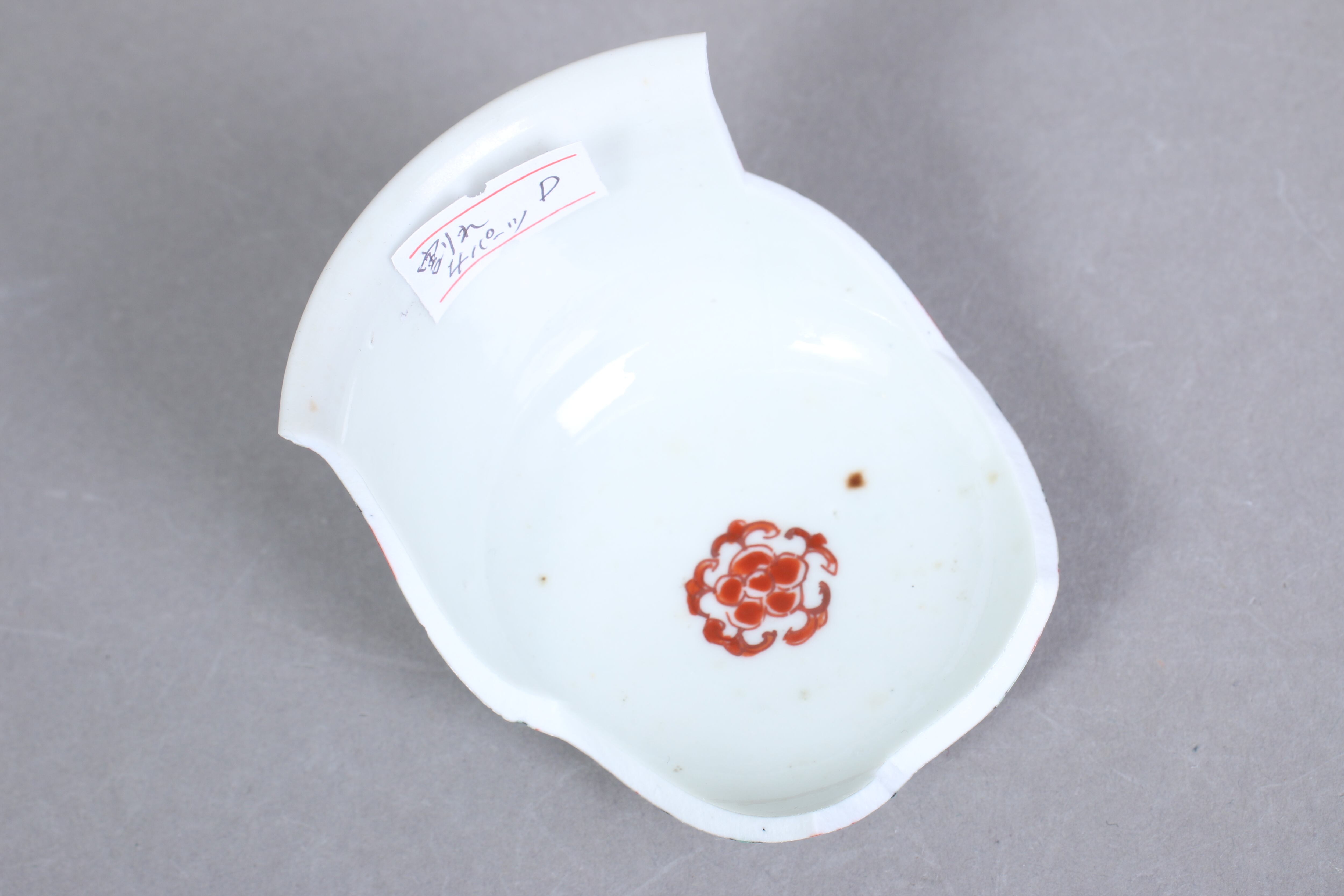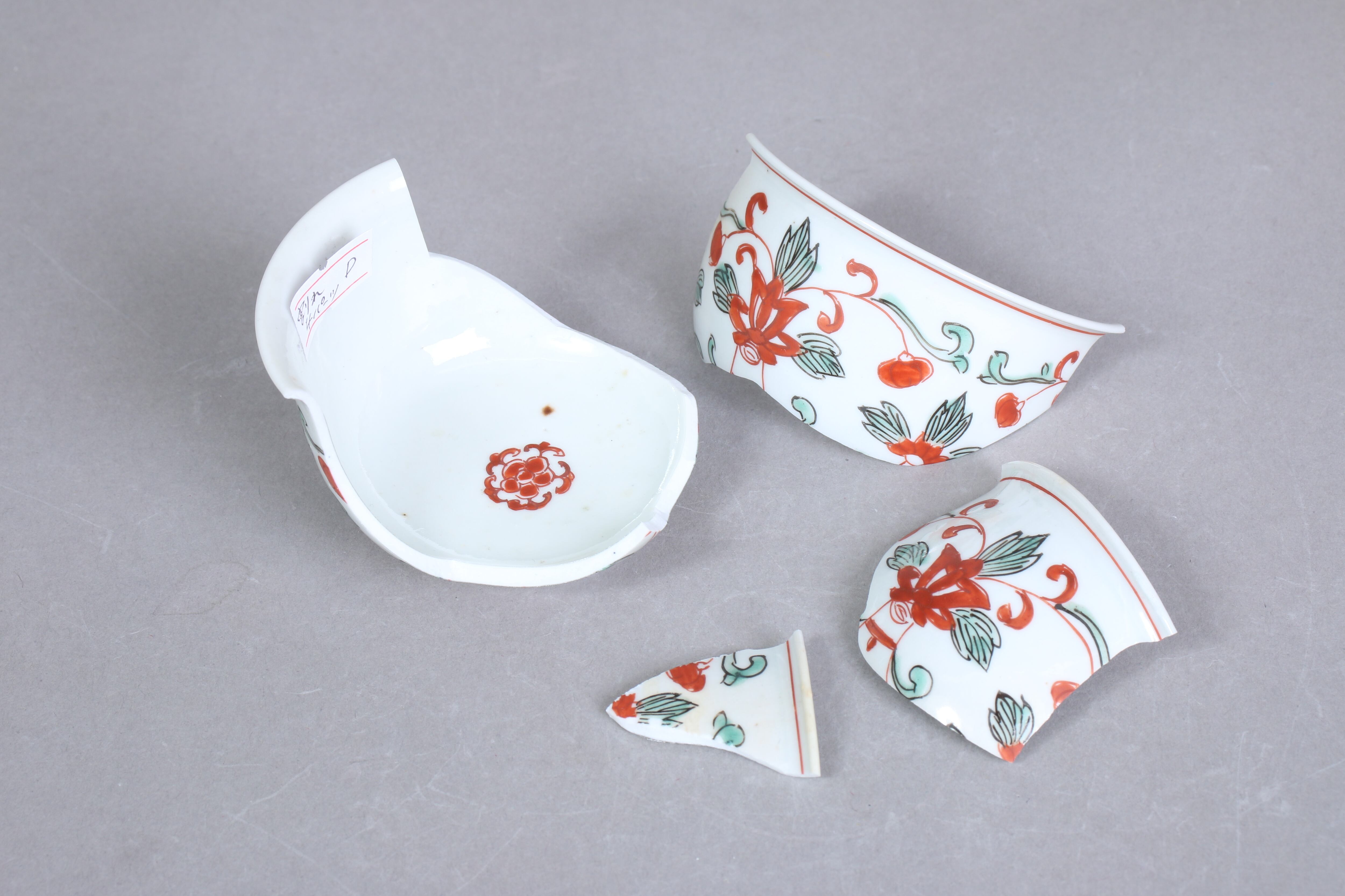 状態:割れ4パーツ。合わせられたときに隙間、カケがございます。その他、高台カケ、ニュウ あり。金継ぎ用に。