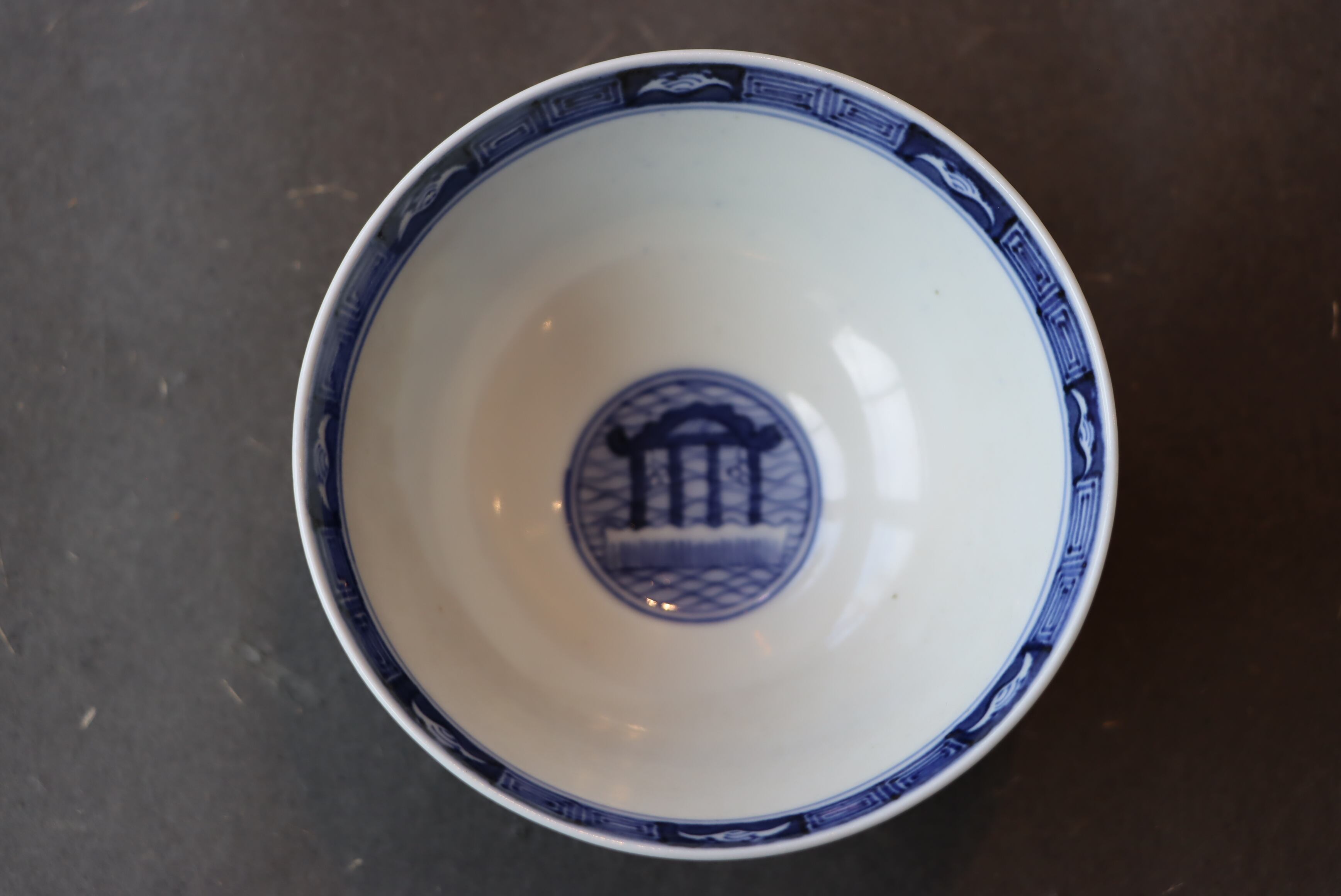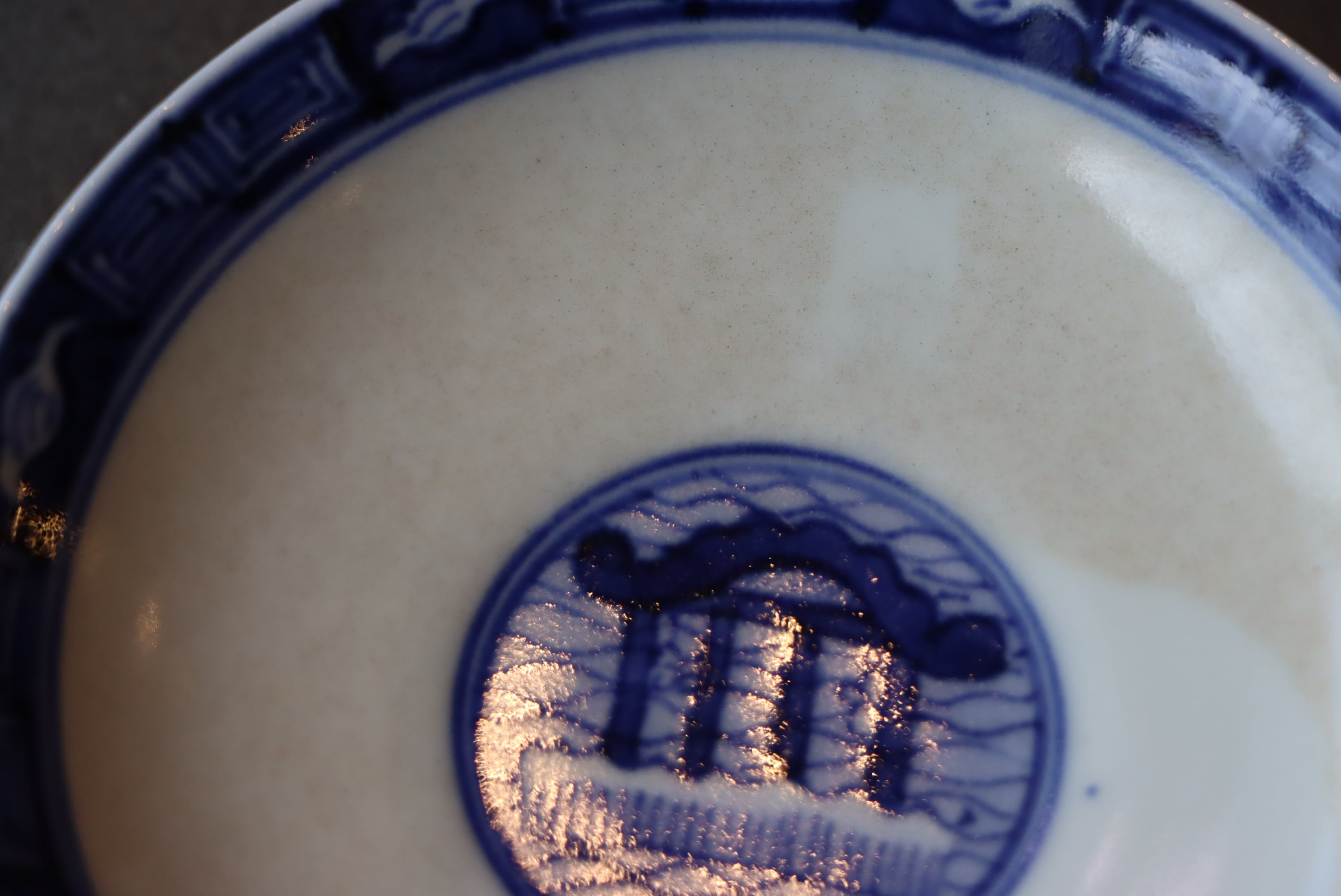 穏やかな水面をゆく楼閣船を、そっと覗き込むように描いた染付の蓋茶碗。