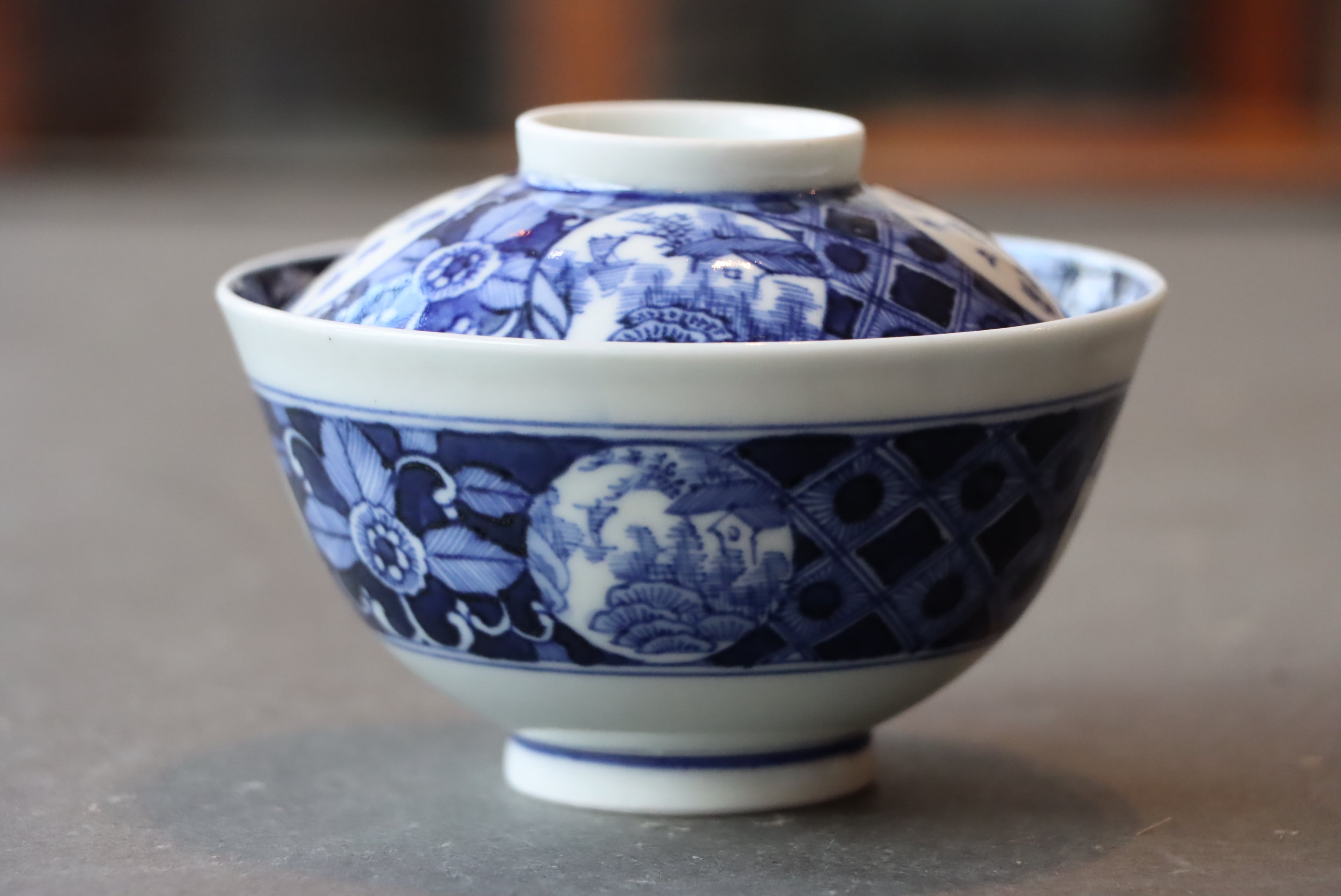 染付 楼閣船文 蓋茶碗/Blue and white covered bowl