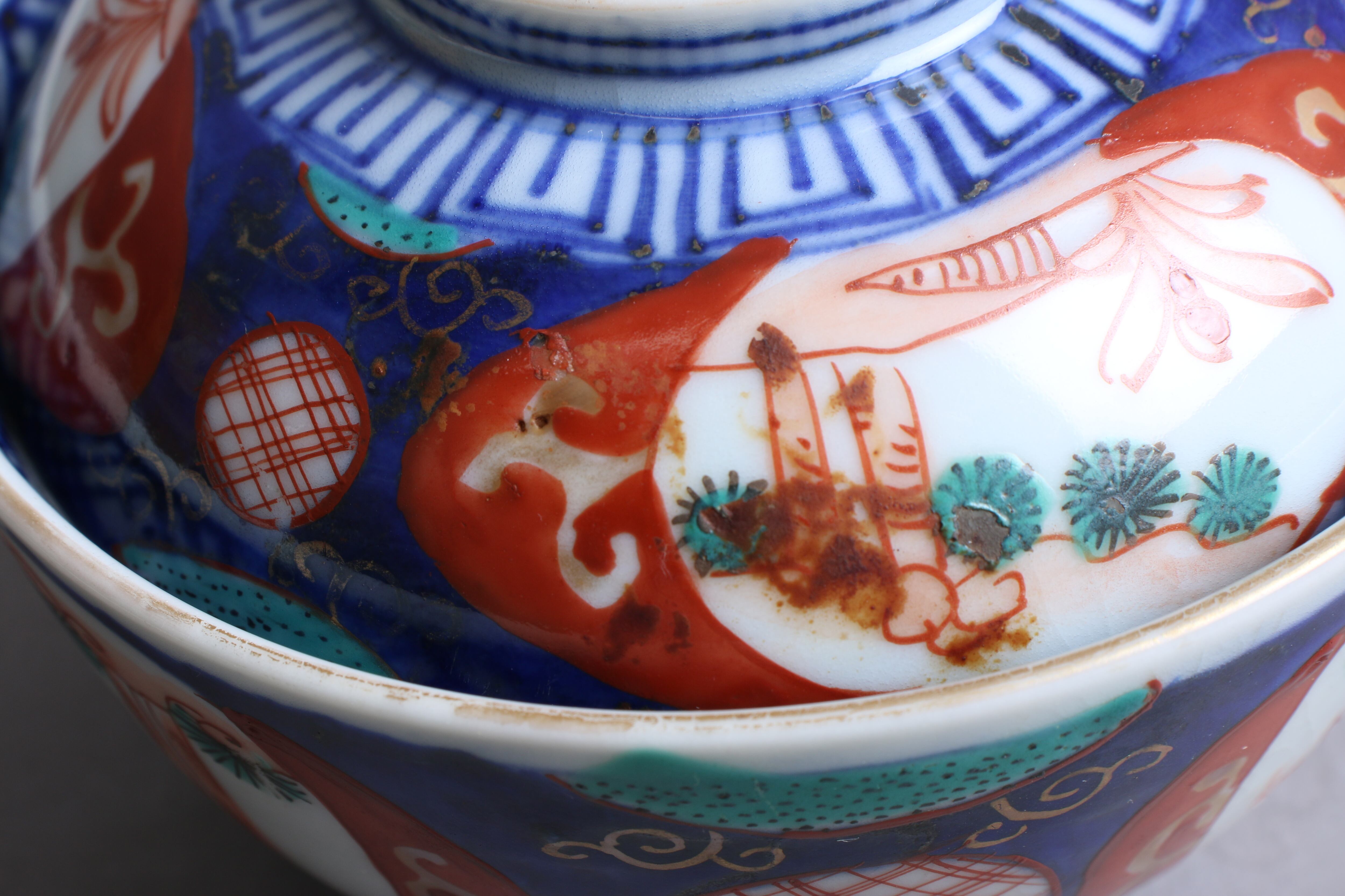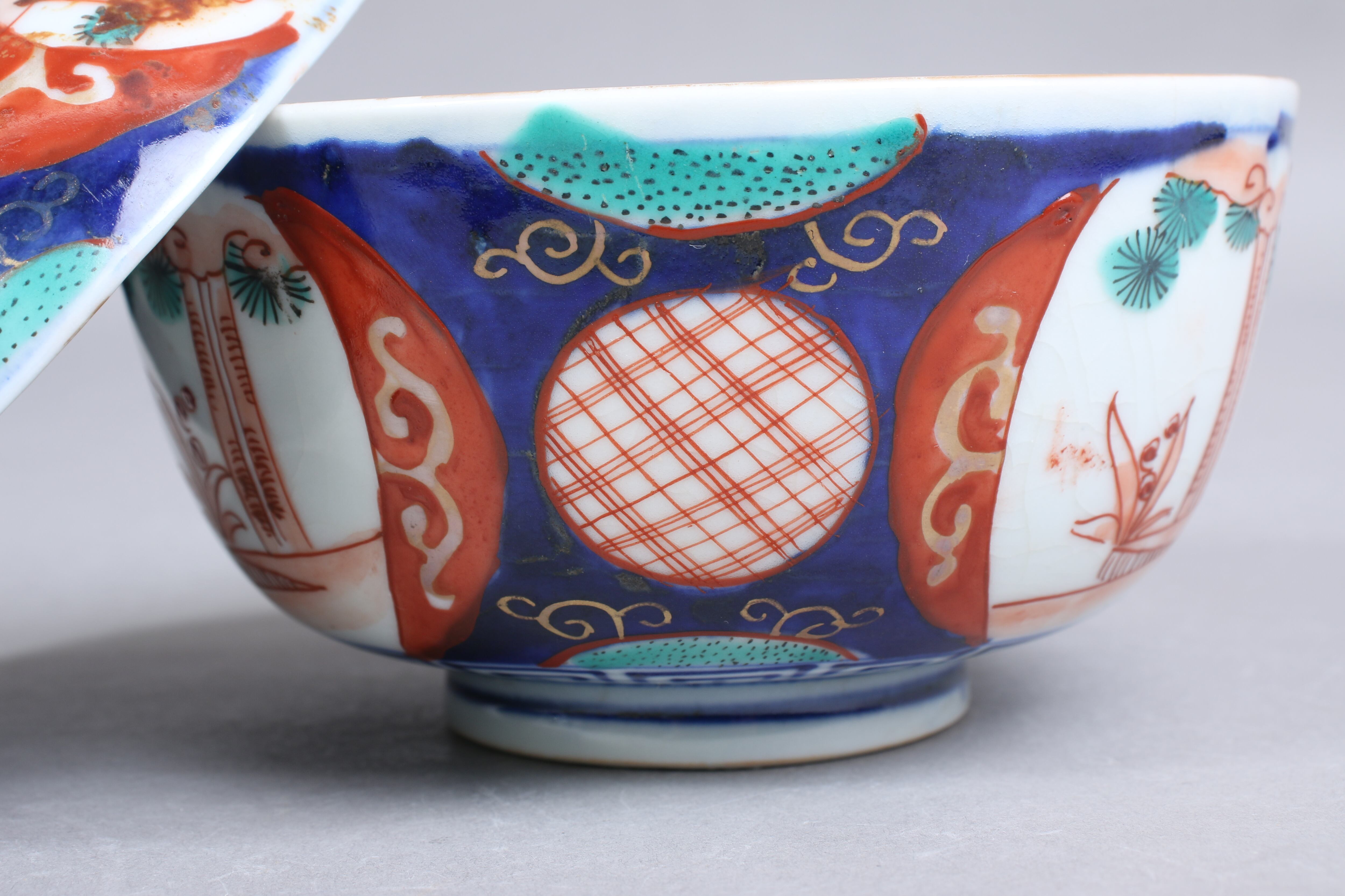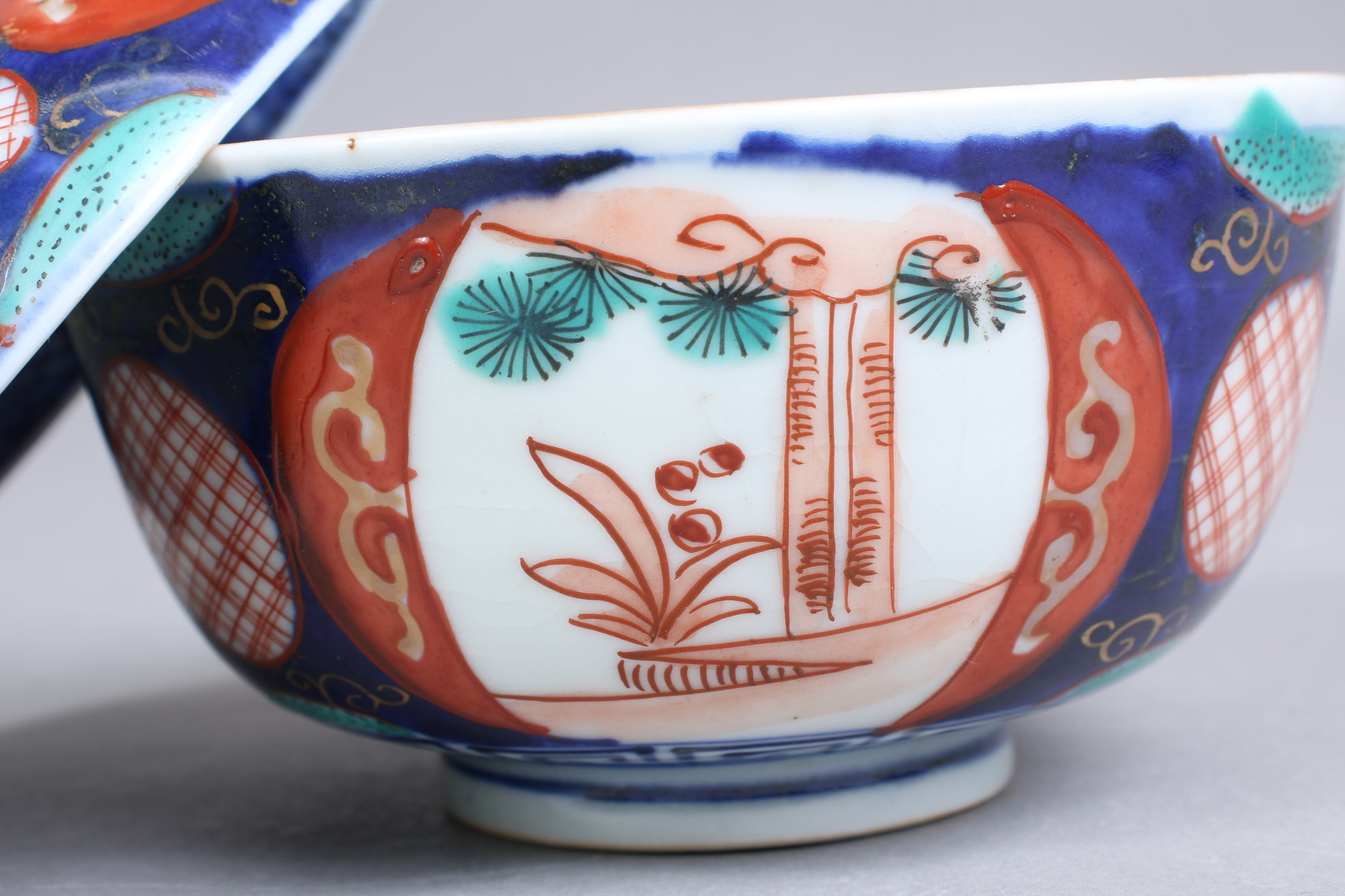 状態:蓋、身の全体(表、内側共に)甘手あり。甘手部分に時代色が入っている箇所がございます。また口縁に施されている金彩が剥離している箇所があります。状態は写真でご確認ください。